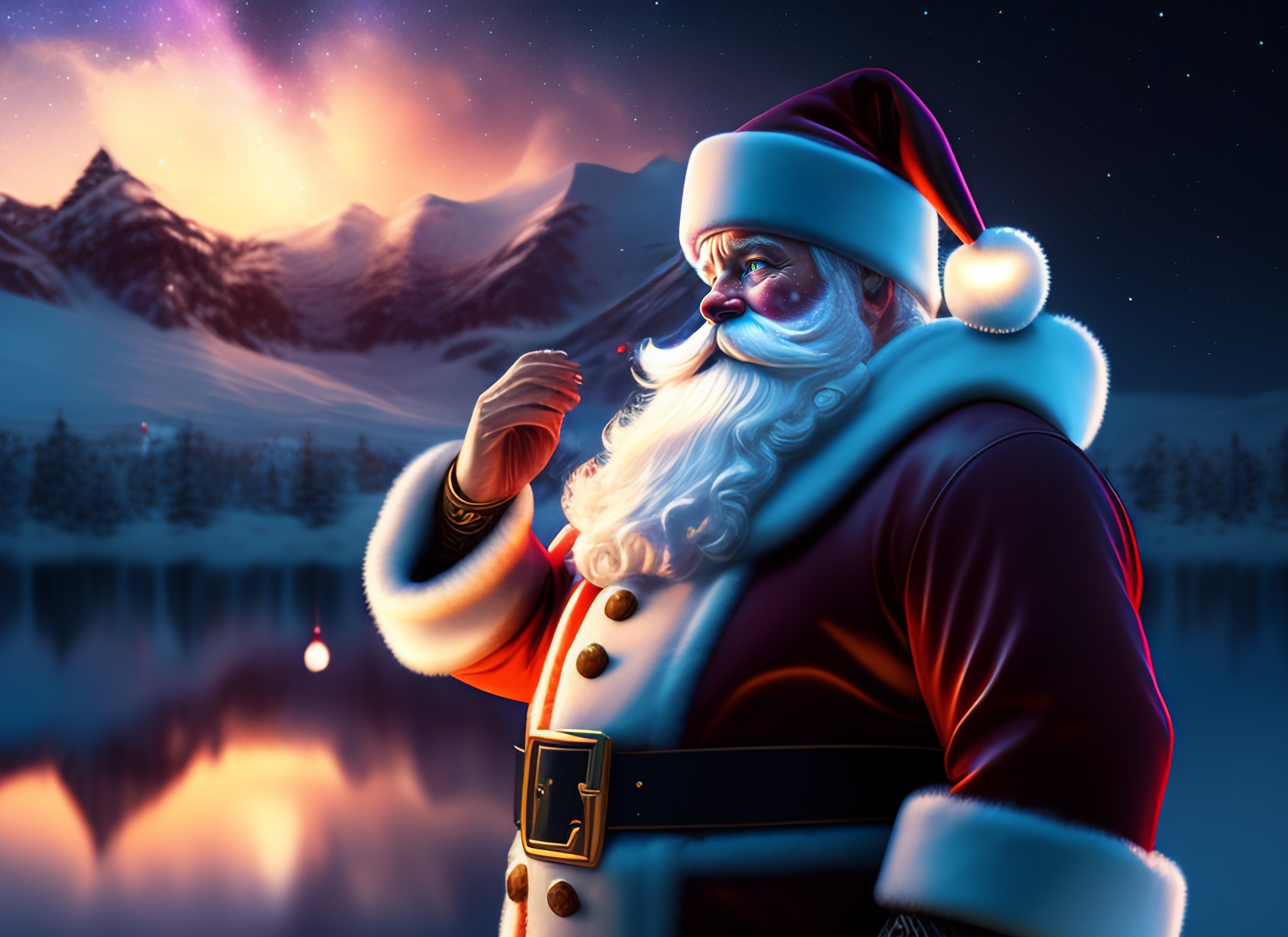 Santa claus, night sky at christmas eve winter background, hyper realistic, highly detailed, digital painting, realistic photography, unreal engine 5, extremely detailed