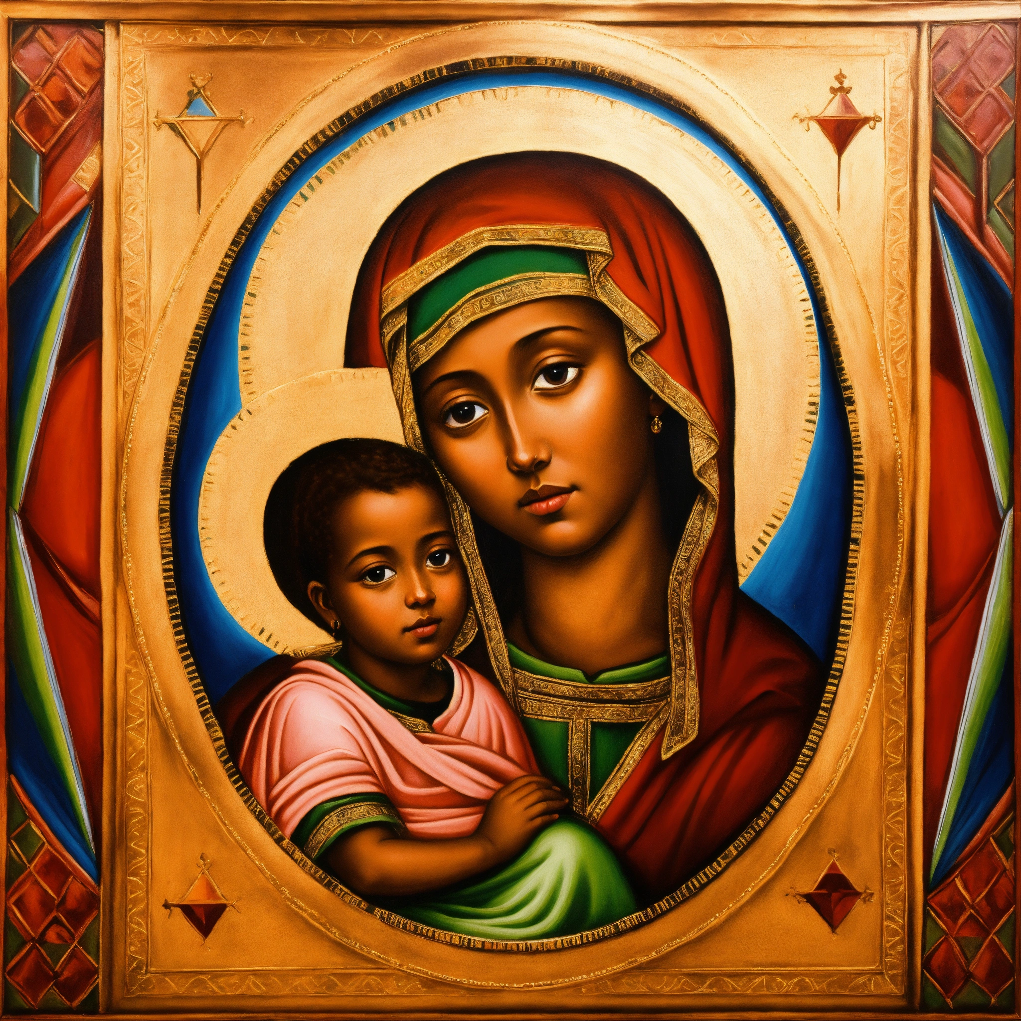 Illustrate an ethiopian madonna and child painted by raphael sanzio, symmetrical designs, photo realistic 16k not as an orthodox icon