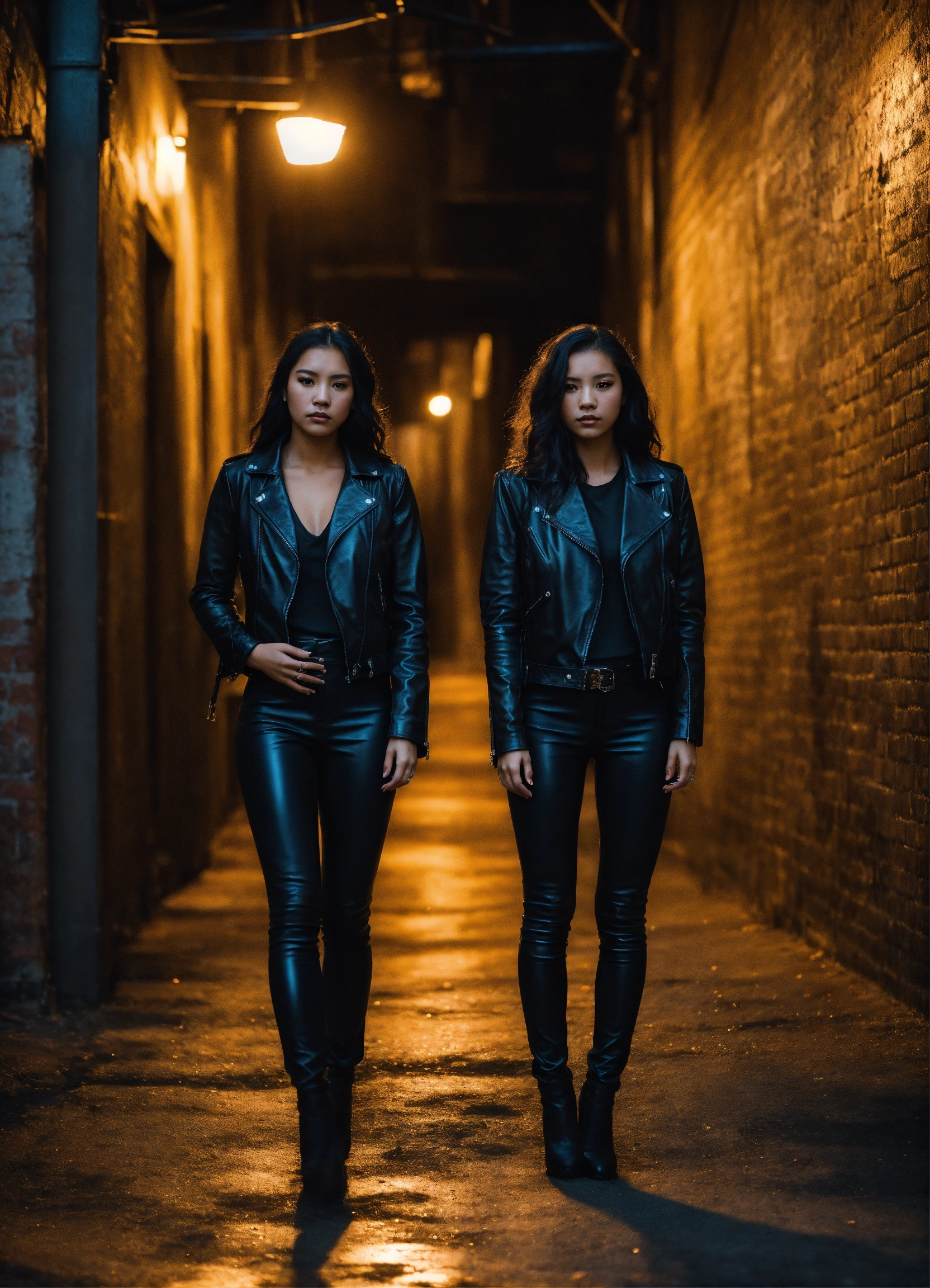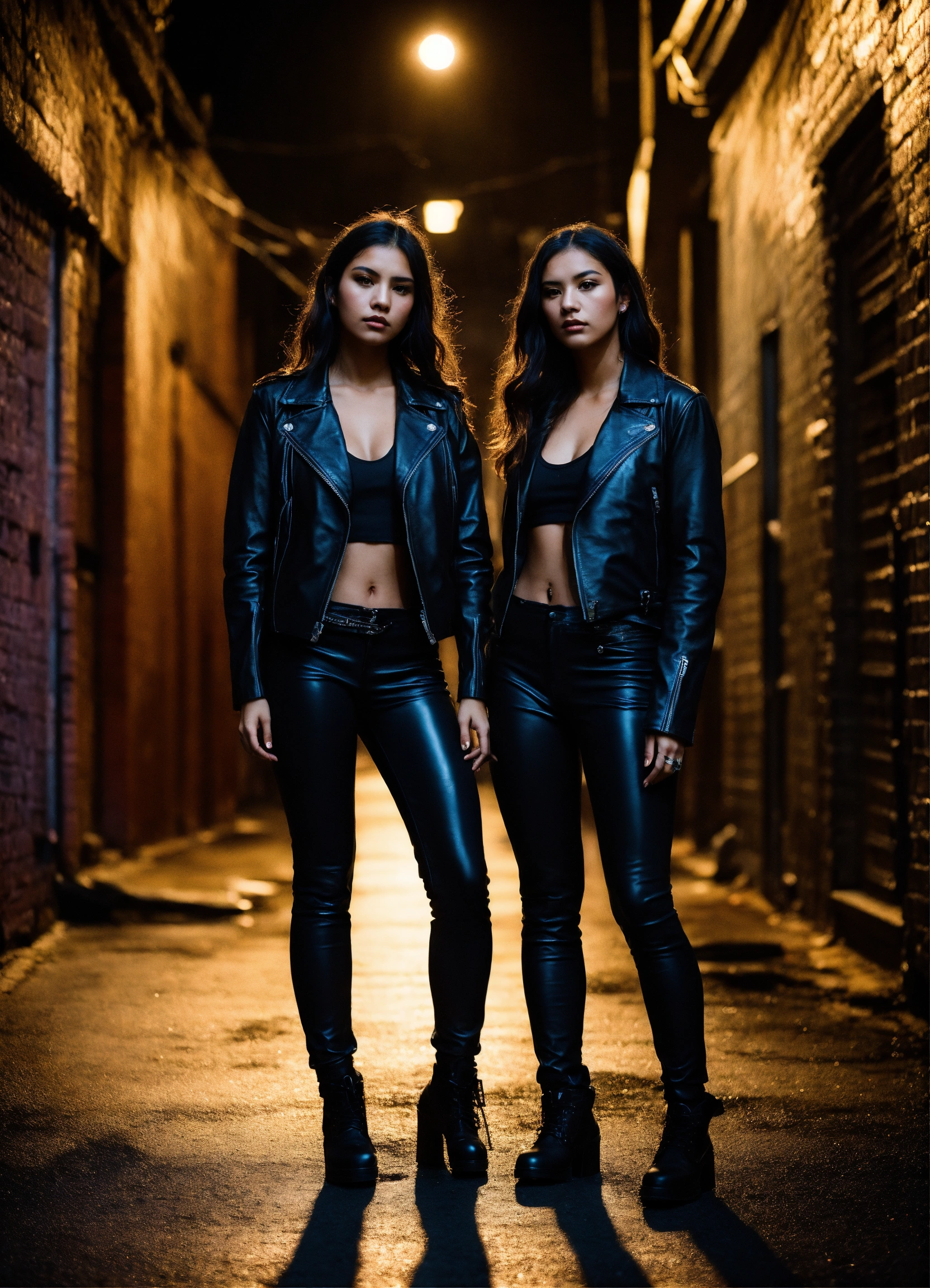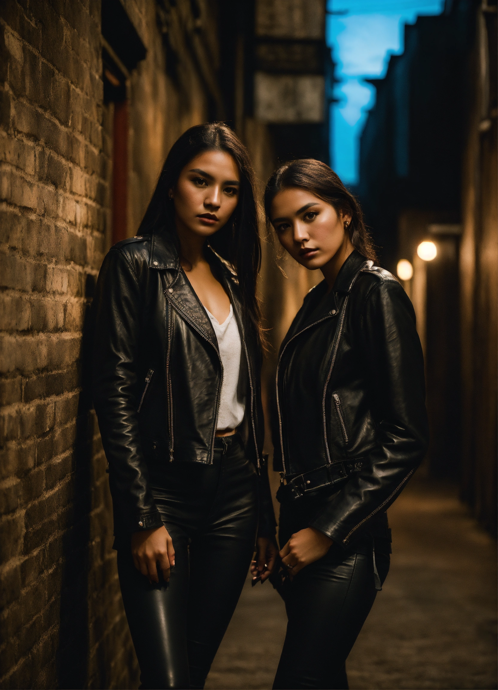 Two beautiful young native women, wearing a black leather jackets and black leather pants, posing in a dark alley, beautiful, moody lighting, best quality, full body portrait, real picture, intricate details, depth of field, fujifilm xt3, outdoors, beautiful lighting, raw photo, 8k uhd, film grain, dark hues, moody