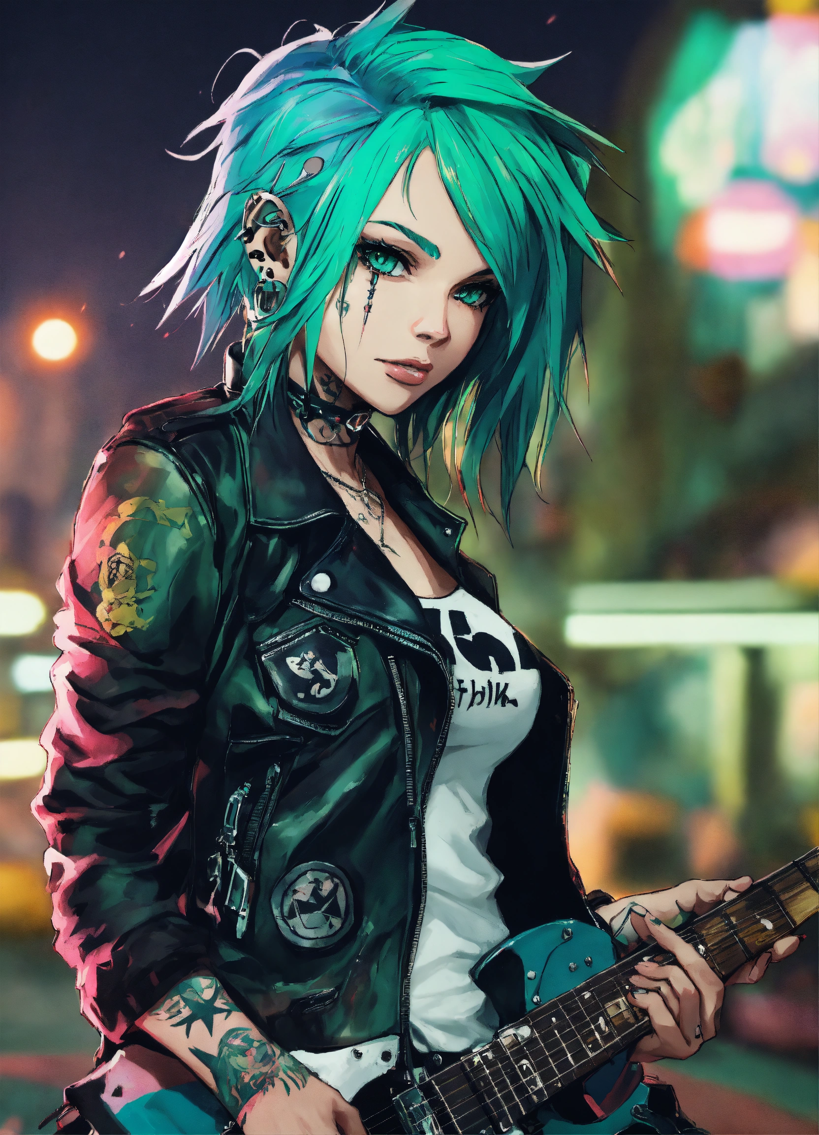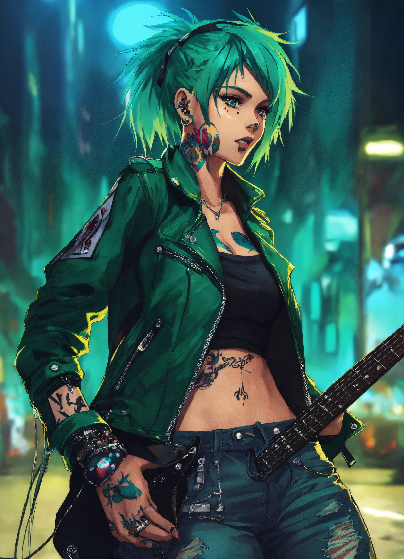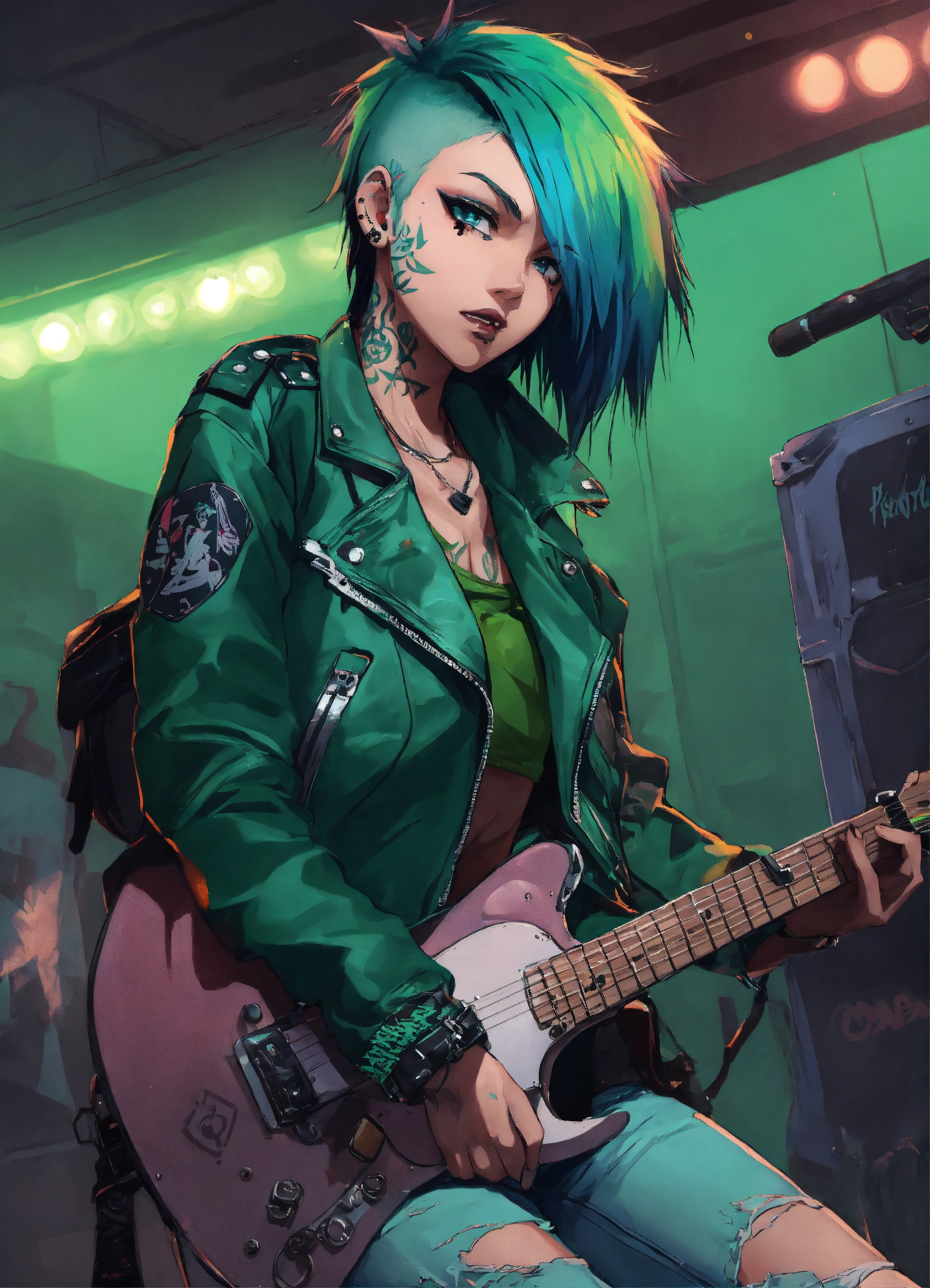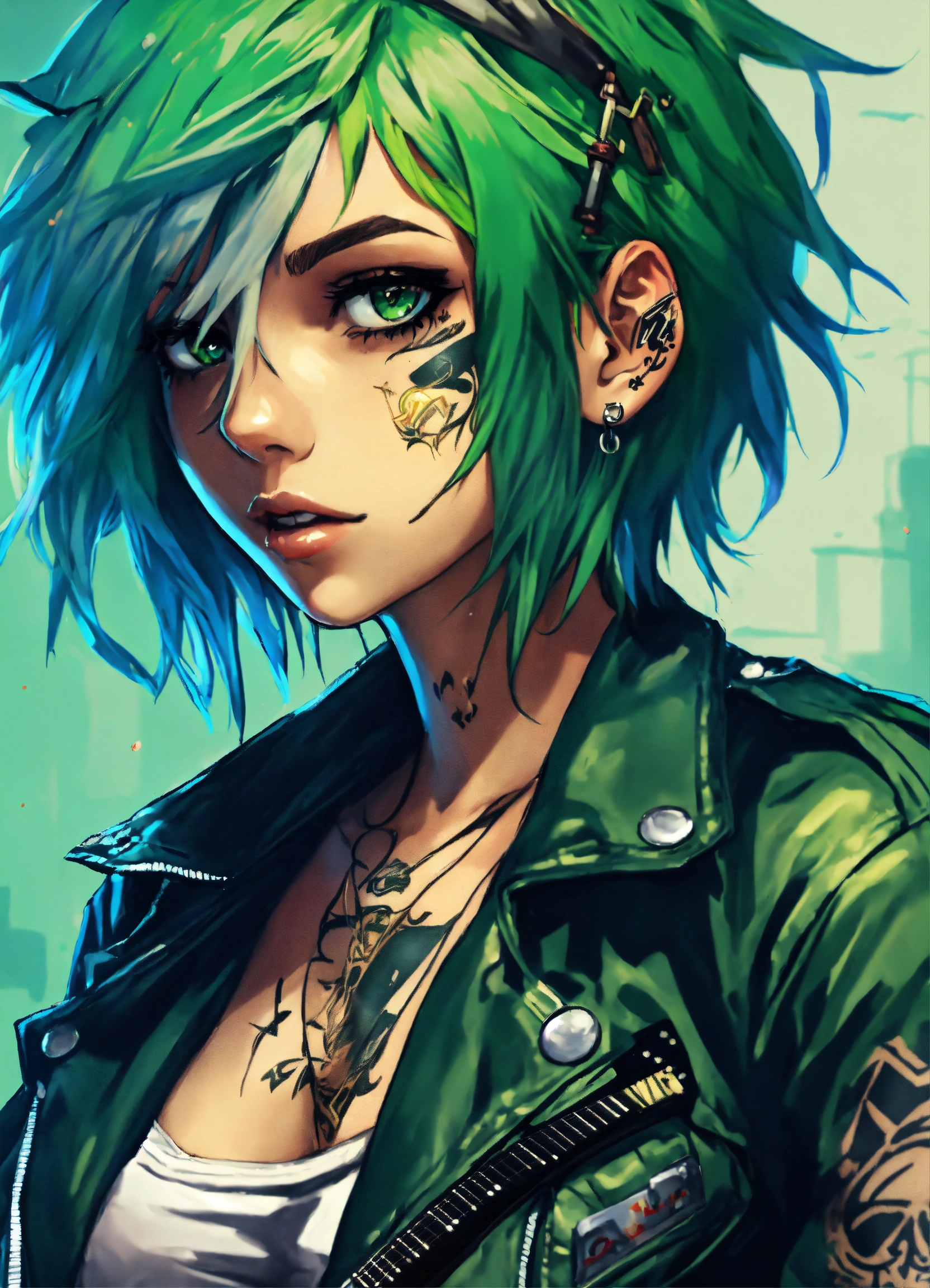 2d epic anime manga style, punk rock girl face tattoos, piercings, half-shaved green hair, leather jacket, ripped jeans, electric guitar, aqua tone, in the shadows