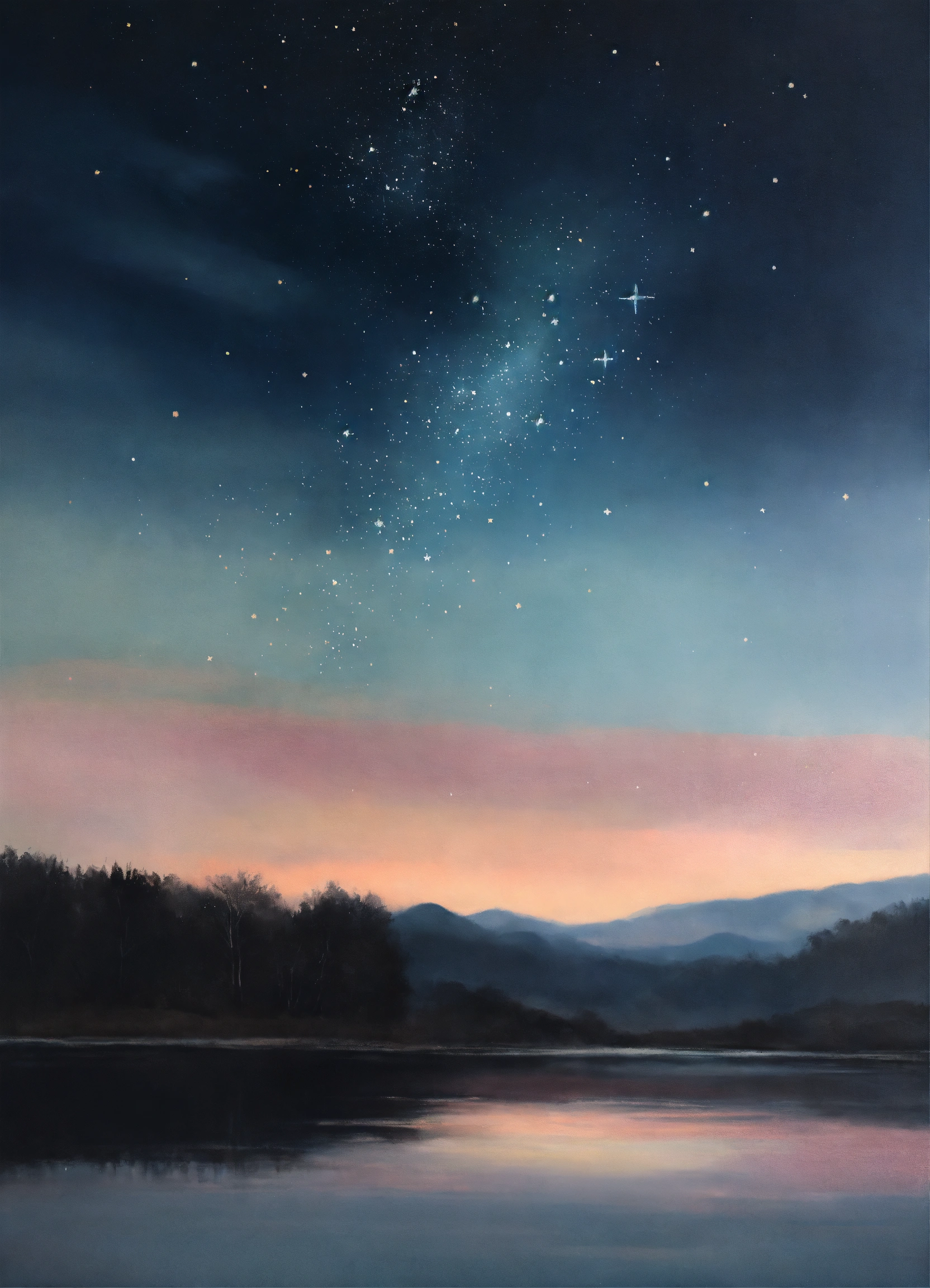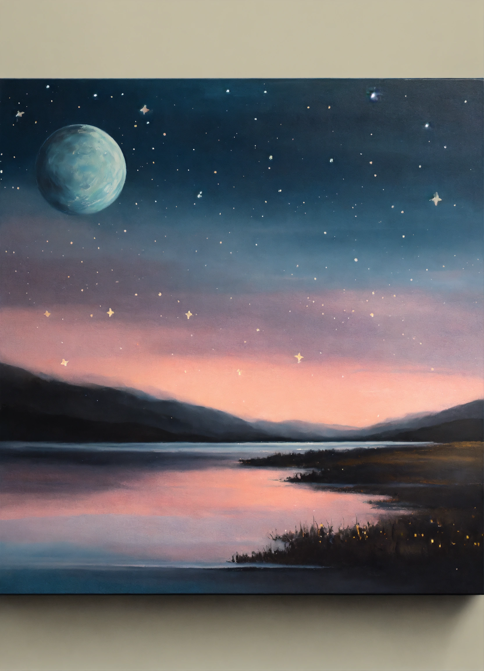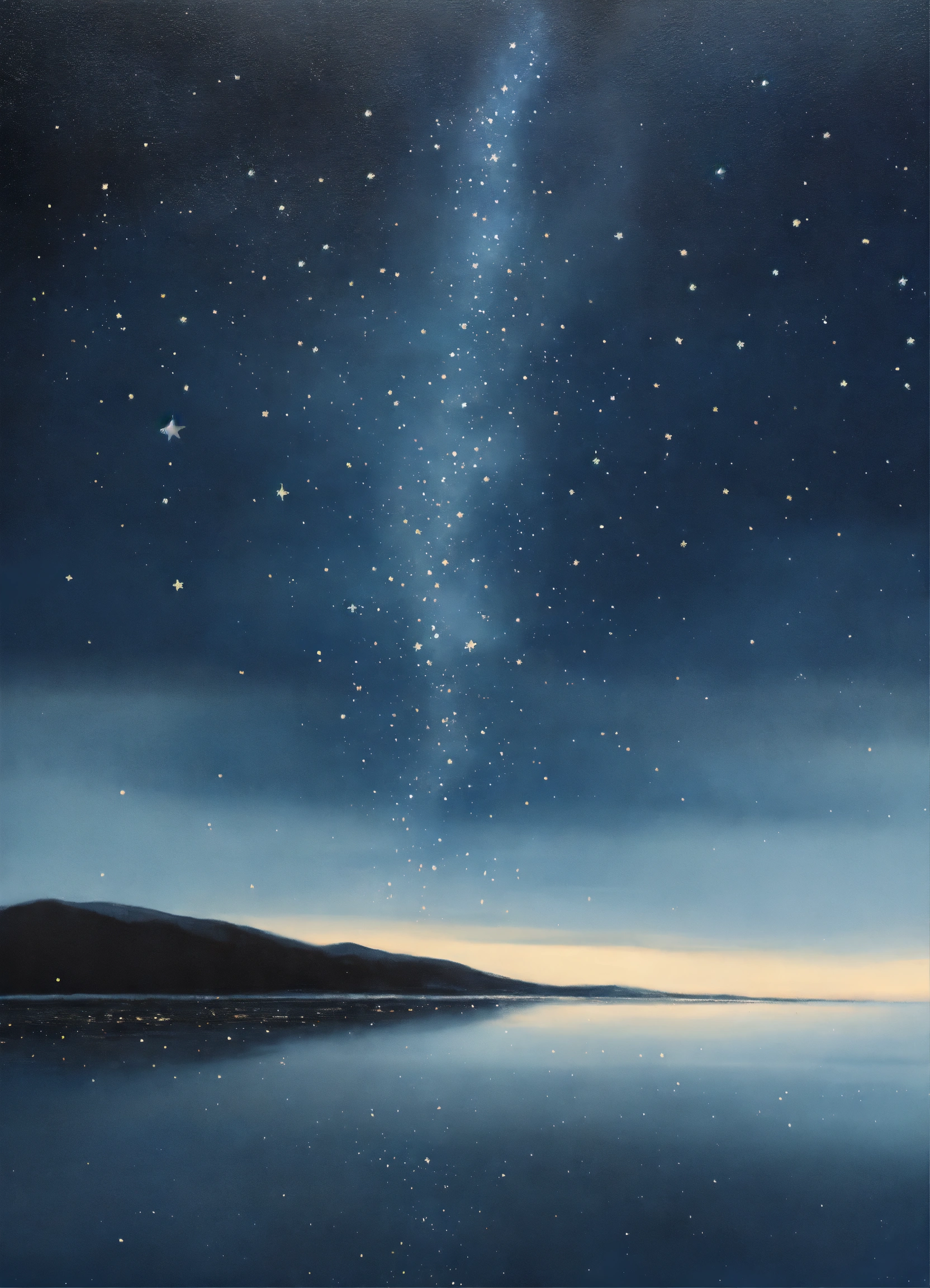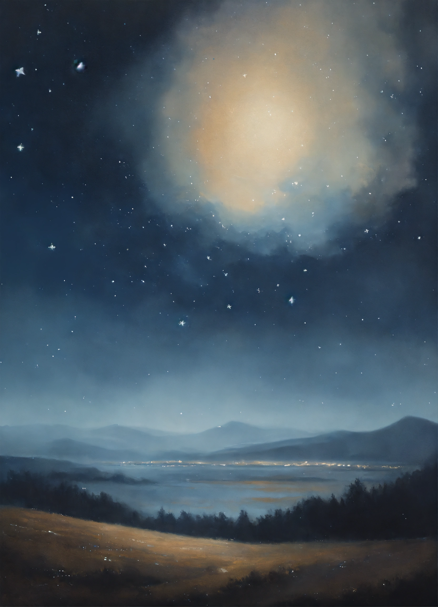 Minimalist oil painting of night sky with stars in soft tones in a silent and divine environment and high resolution