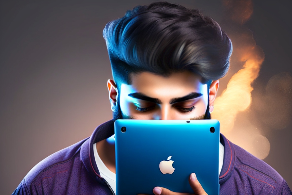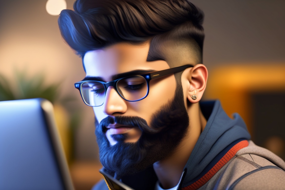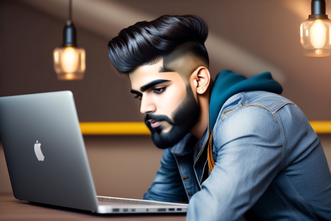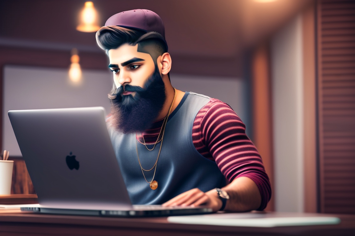 A cute 18 years old pakistani boy, looking like hipster, with beard, is a designer working in studio, on his macbook, make this one but a woman hipster whit tatoos