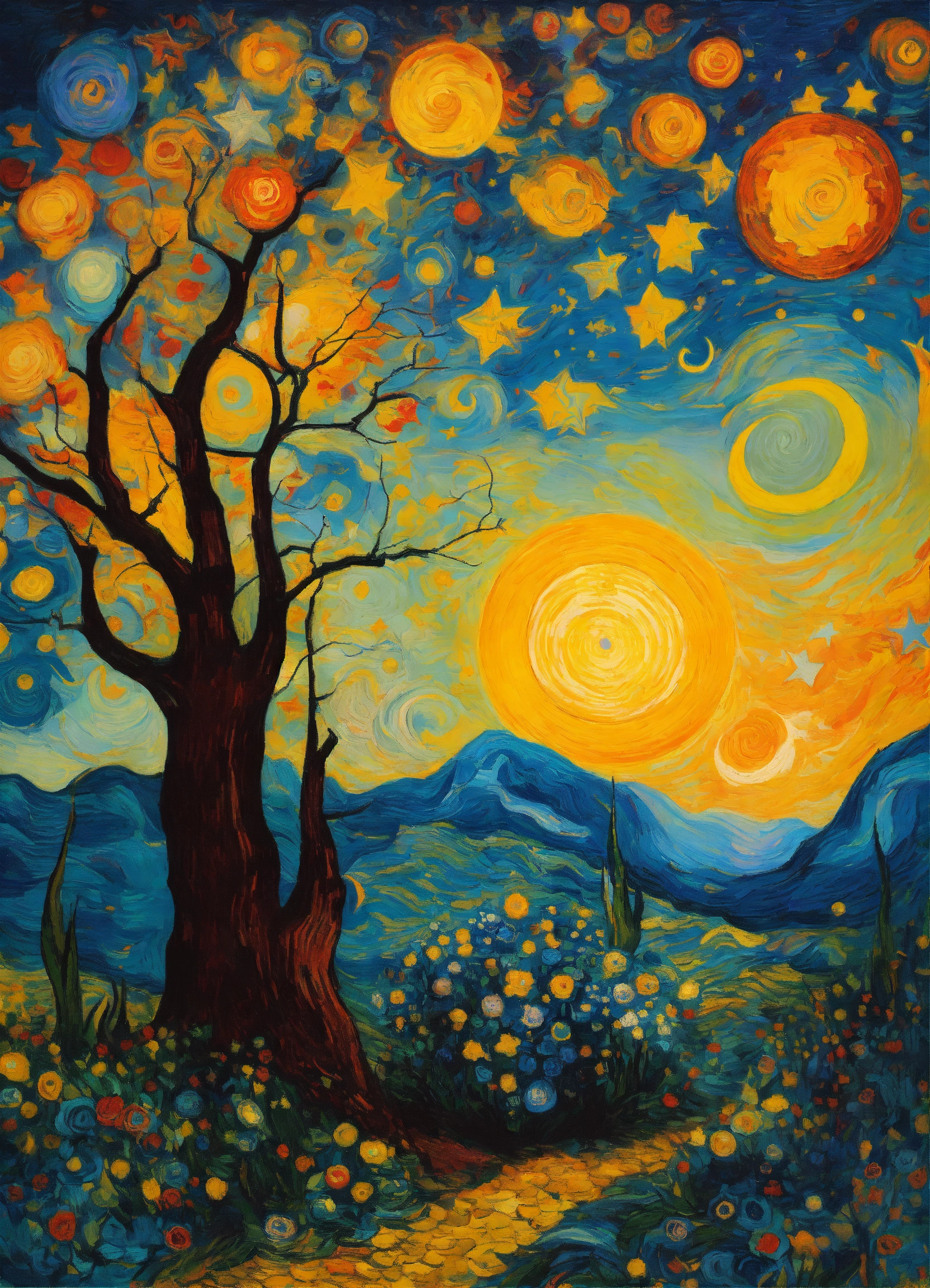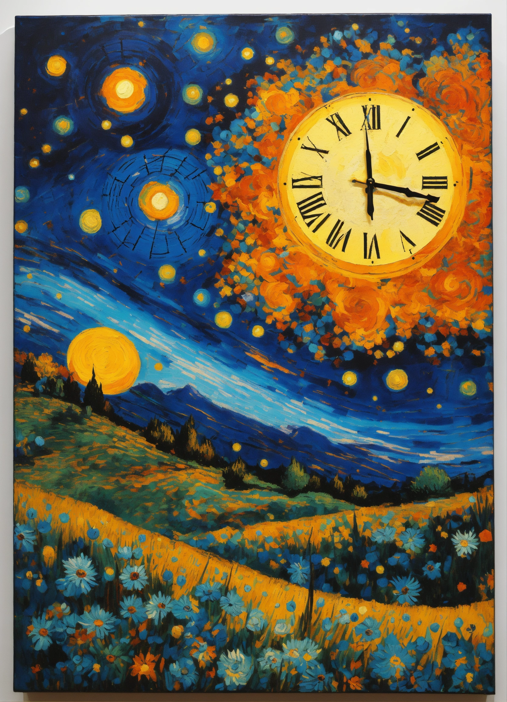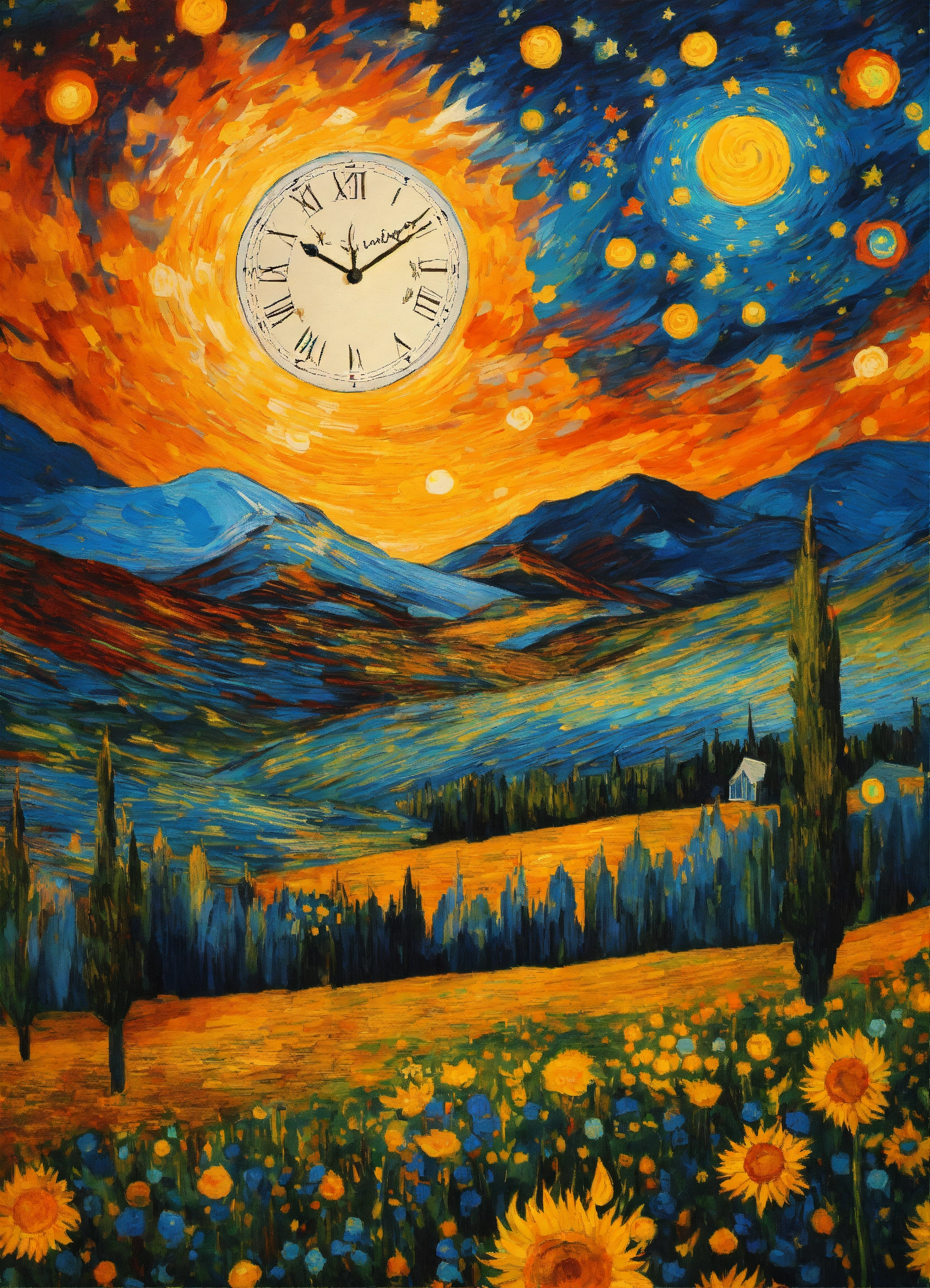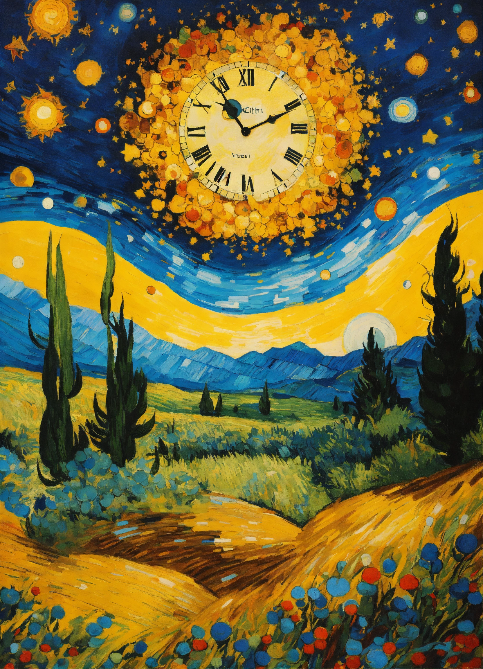 Cosmic realm, clock, stars painted vincent van gogh, stars and psychedelic abstract patterns, night day, sun and moon.