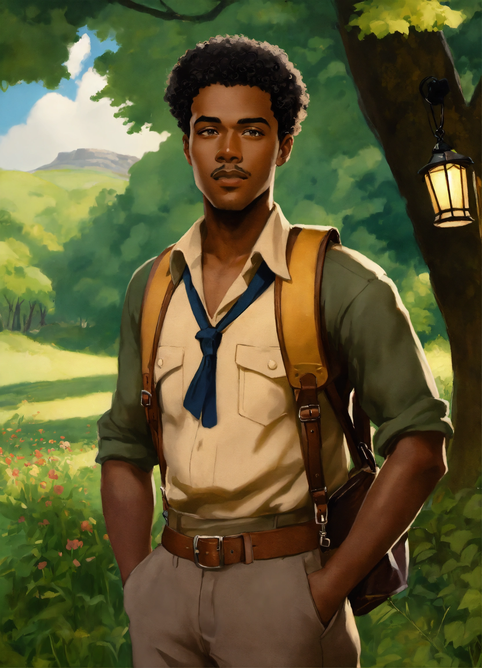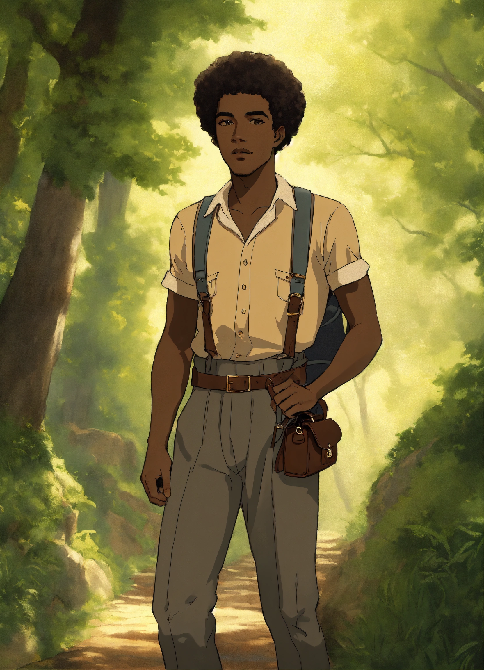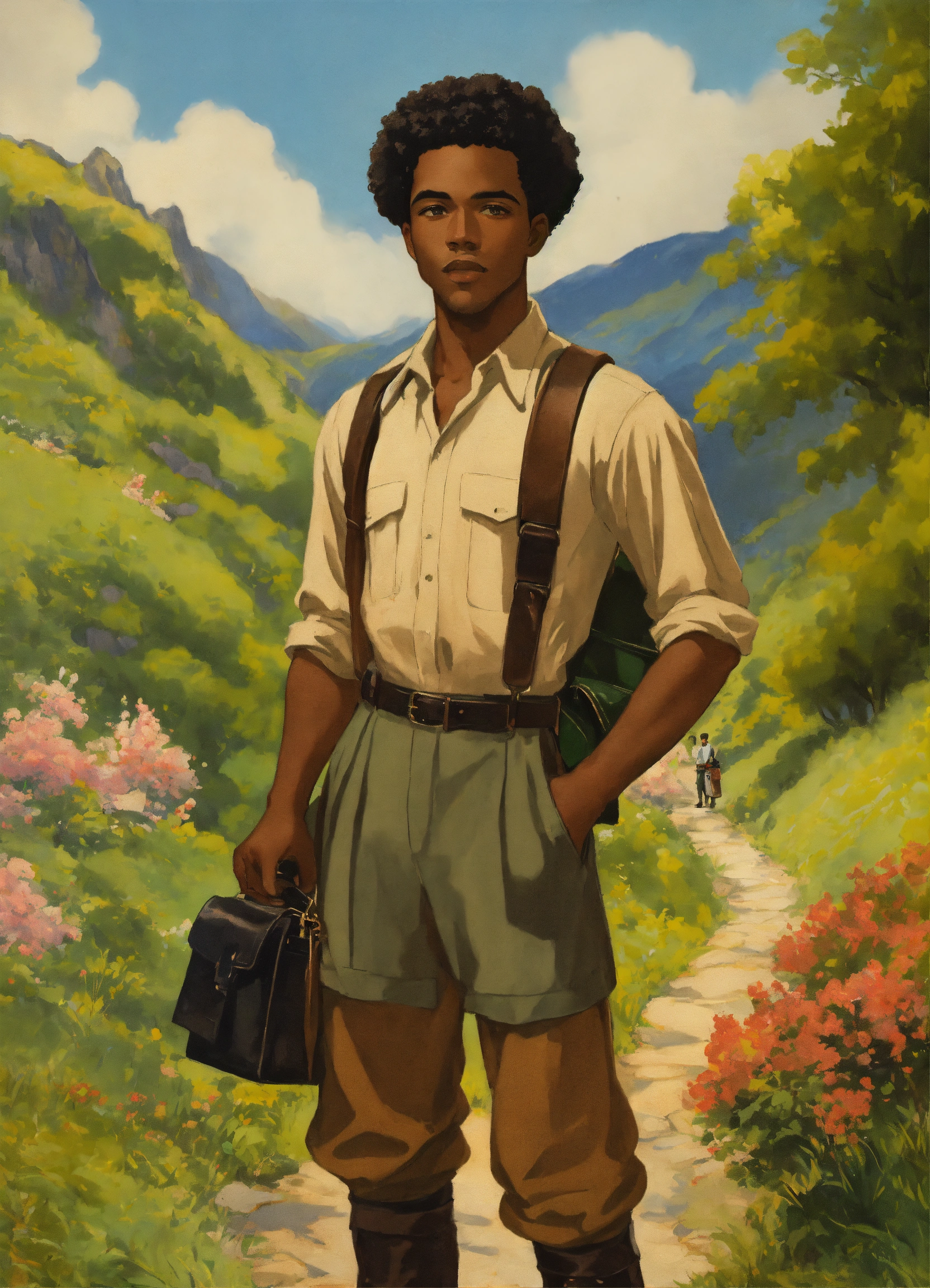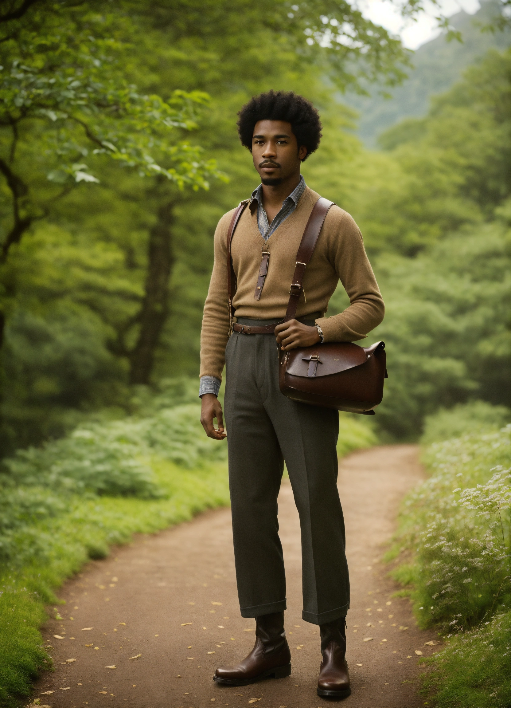 A 1930s portrait of an extremely handsome black man with short afro hair, hazel eyes standing in a glen with a satchel and boots by studio ghibli.