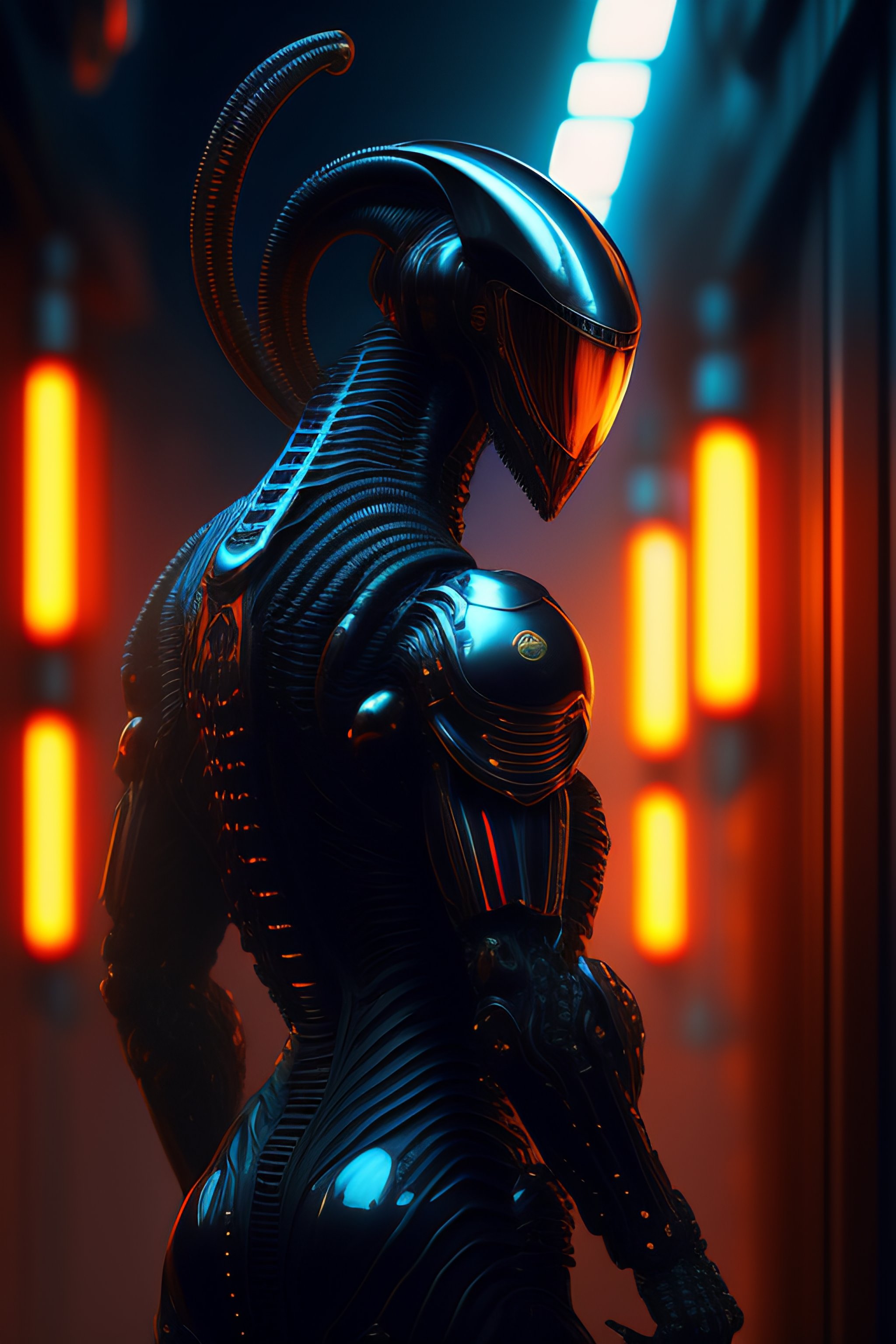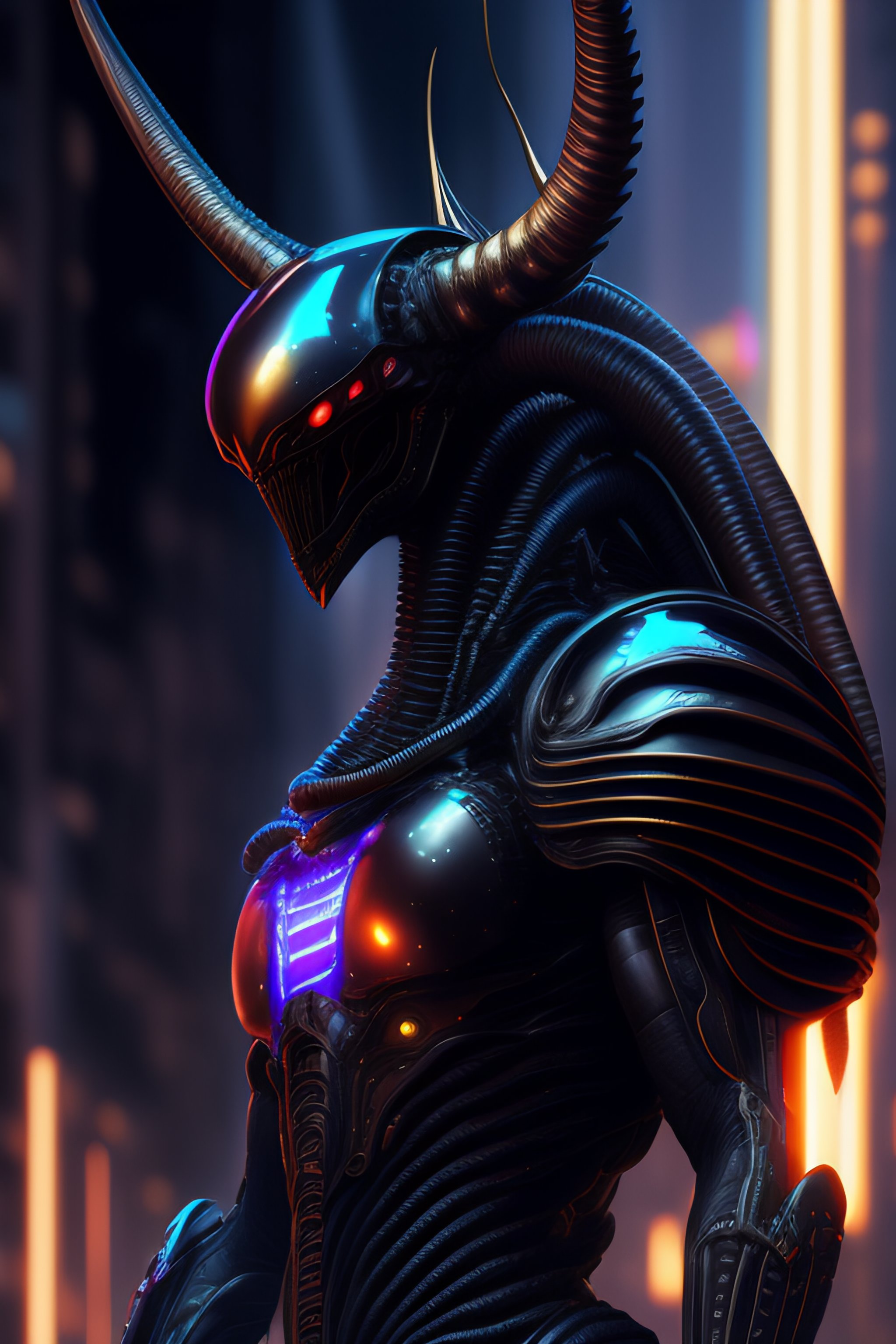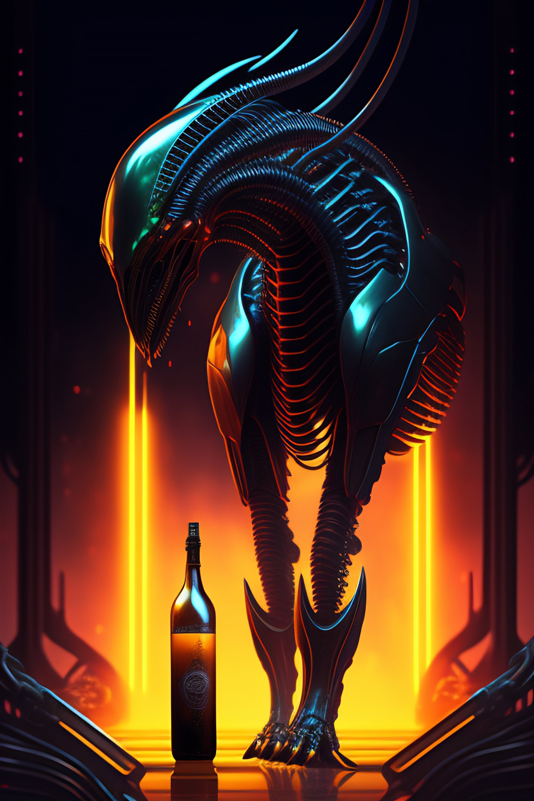 Alien xenomorph male biomechanical, full body cinematic style digital art render with mechanical and futuristic details in a cyberpunk underworld, (((drinking a bloody cocktail))), moody atmospheric lighting, bizarre, dangerous, art by yoshiyuki sadamoto and giger