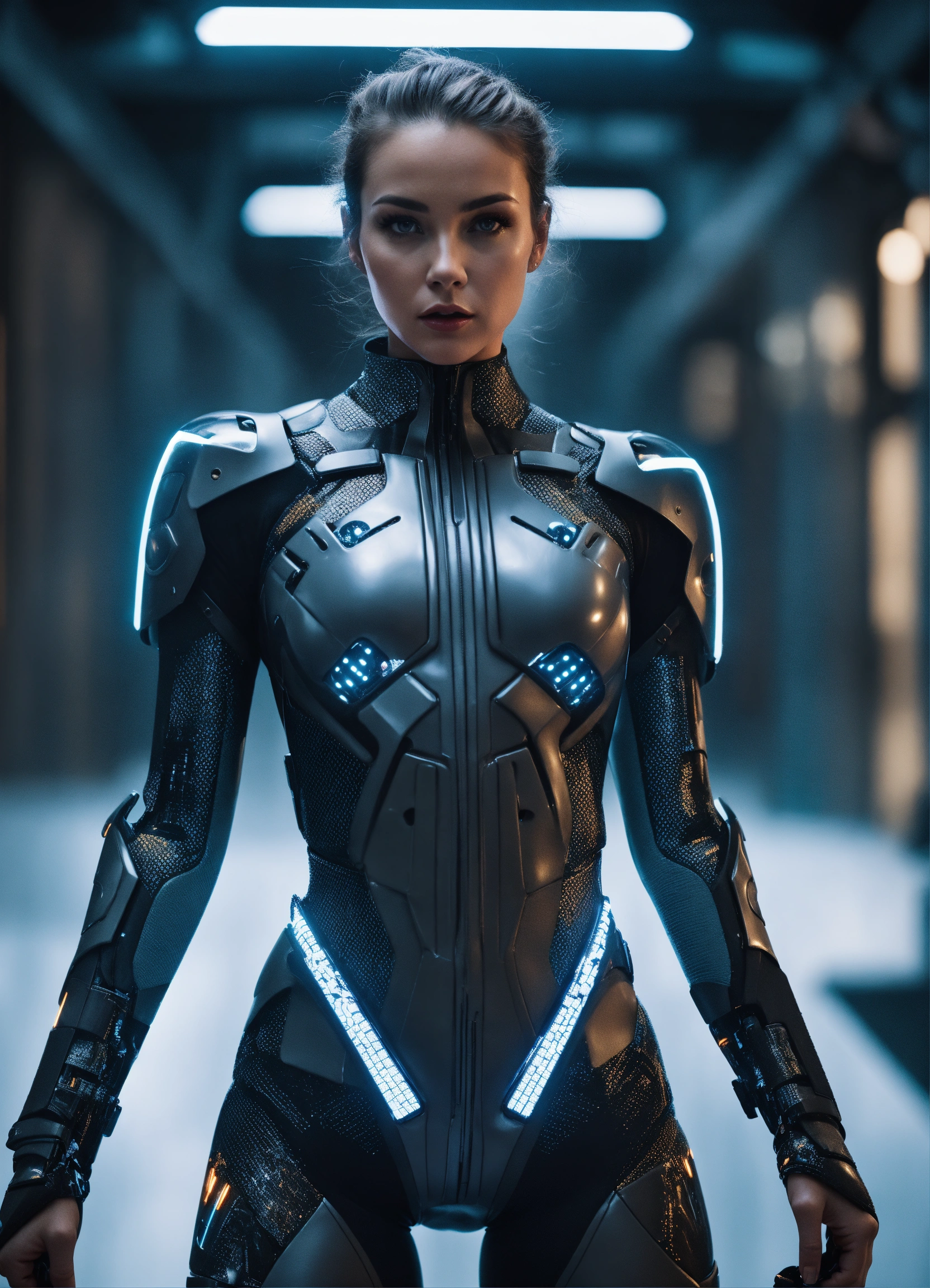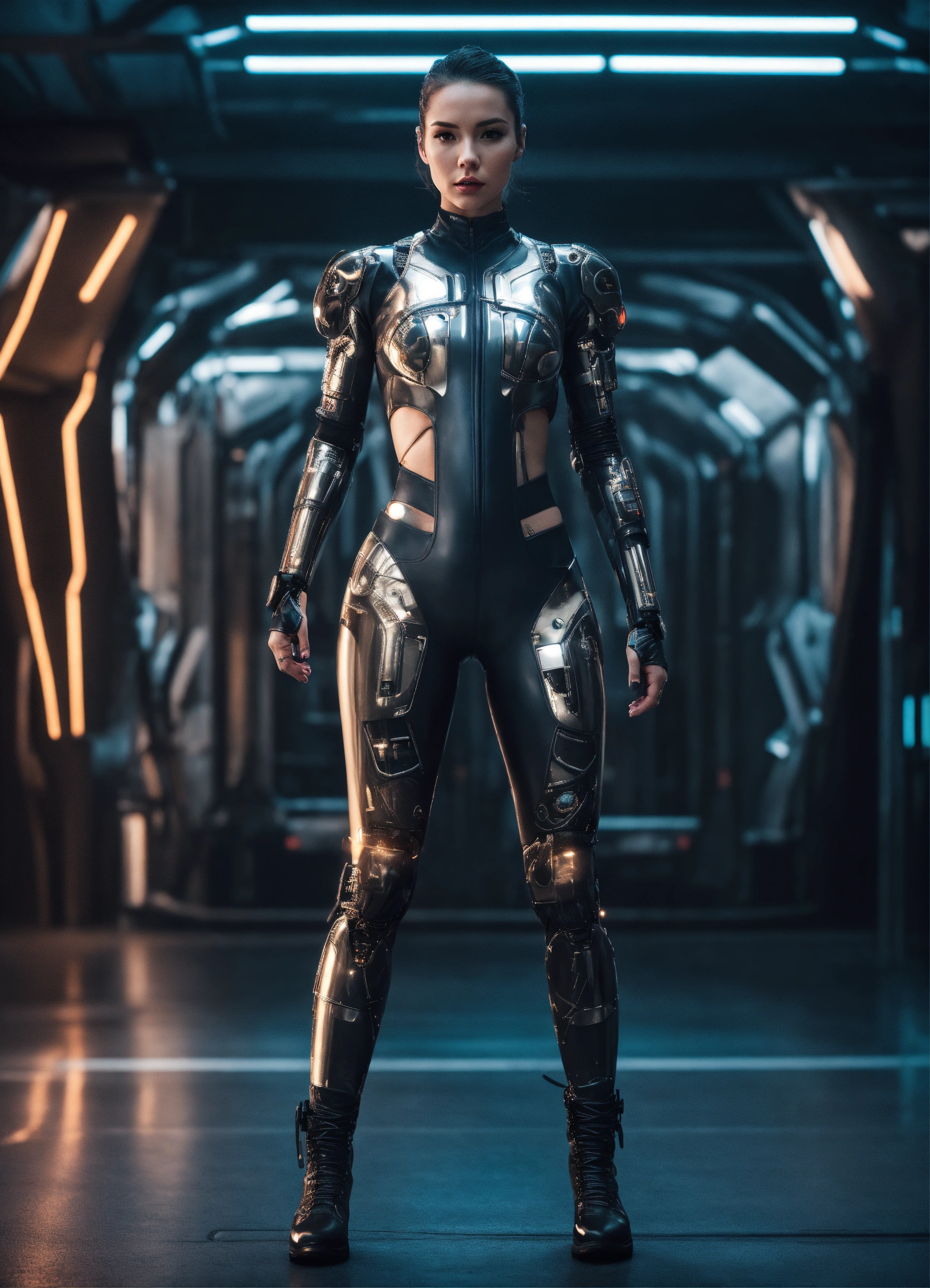 An ultrarealistic full body photograph of woman wearing futuristic suit, strong pose, making fist, tight sports top, electronic elements, hightech power suit made of latex, cyborg parts, showing belly and thighs, hyper realistic, leather, imposing, modern minimalism, elegant, dystopia, mysterious, godlike, scary, 8k