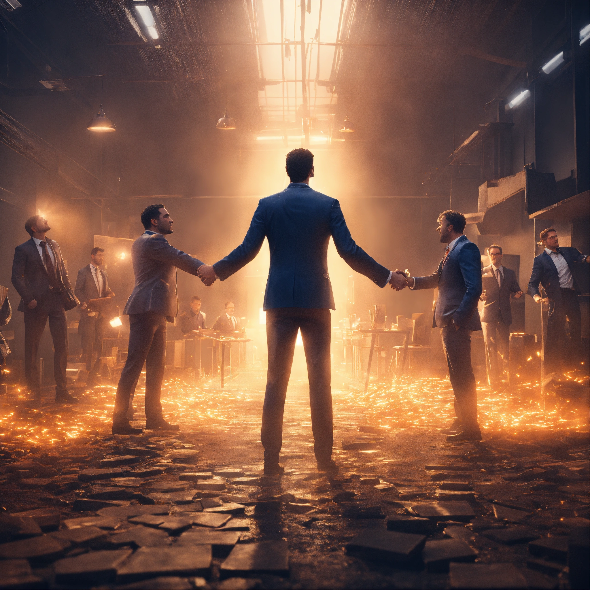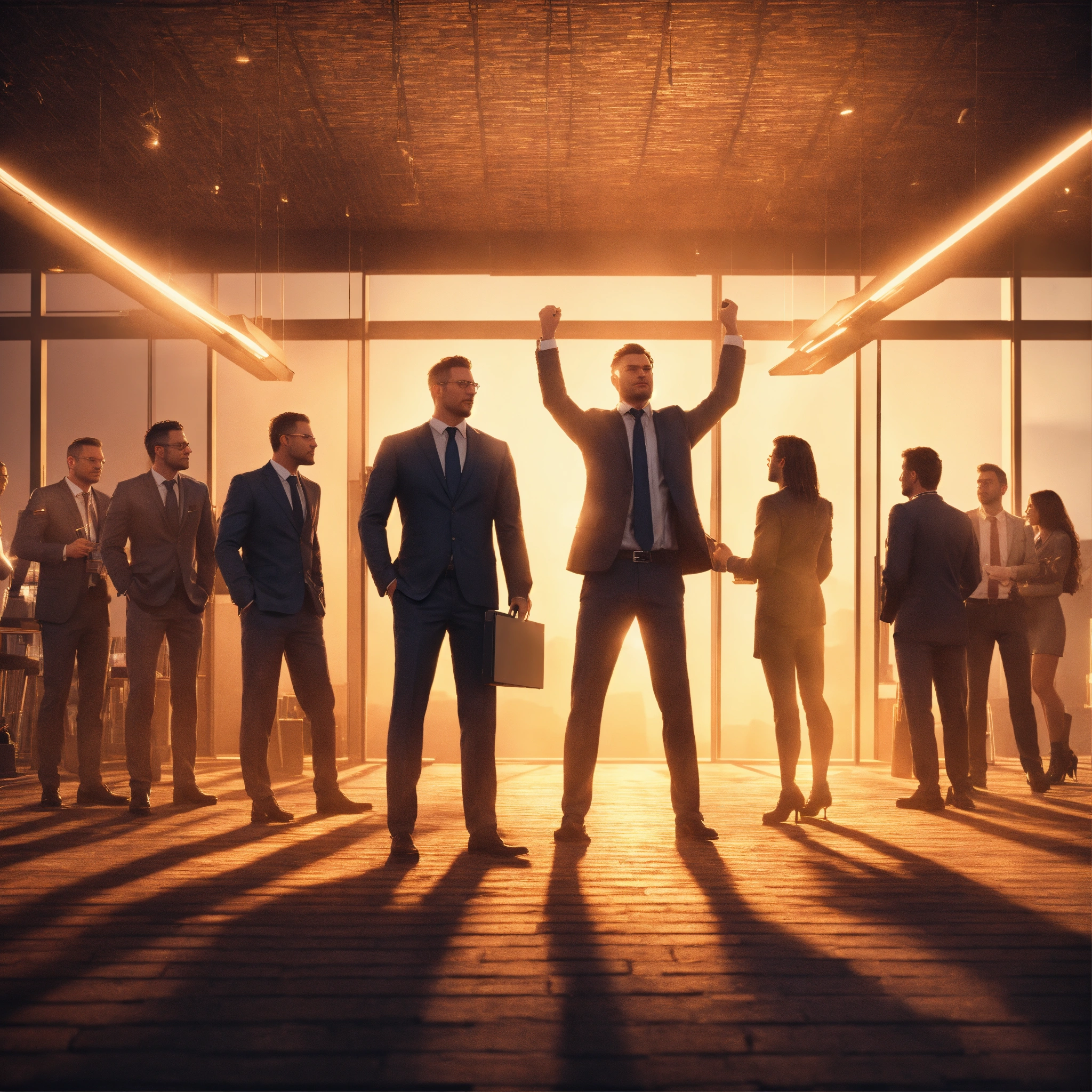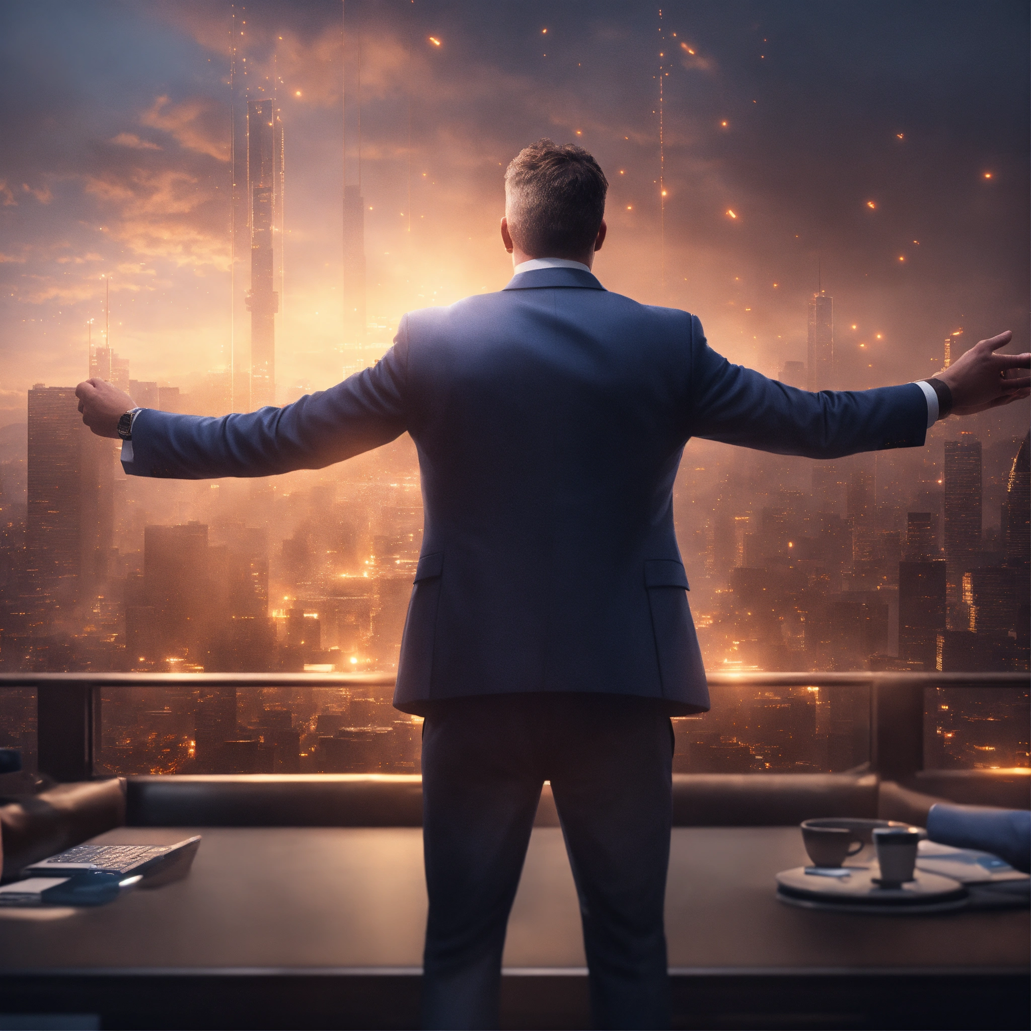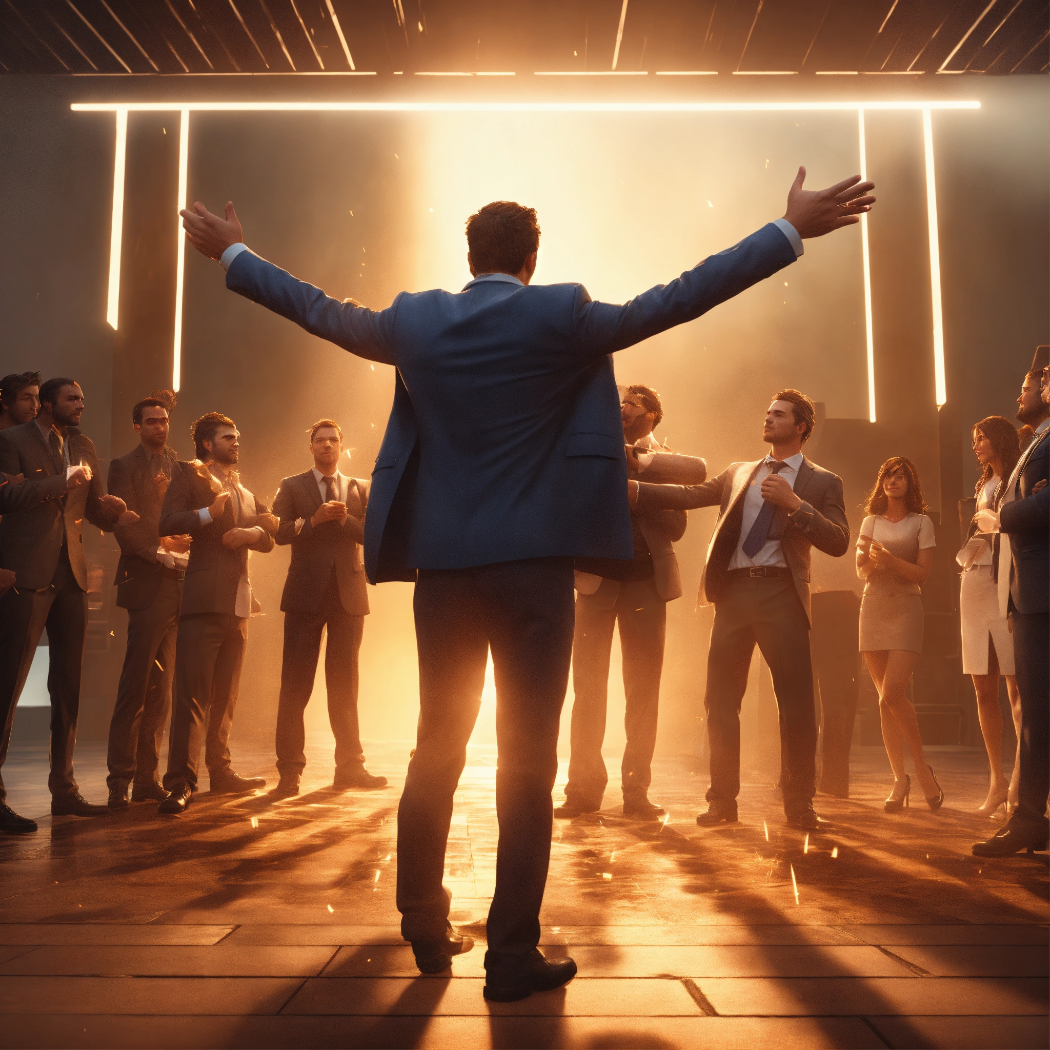 The end of the evolution in sales in the company, the victorious finale, the light behind the man, the sales manager opened his arms to him, unreal engine