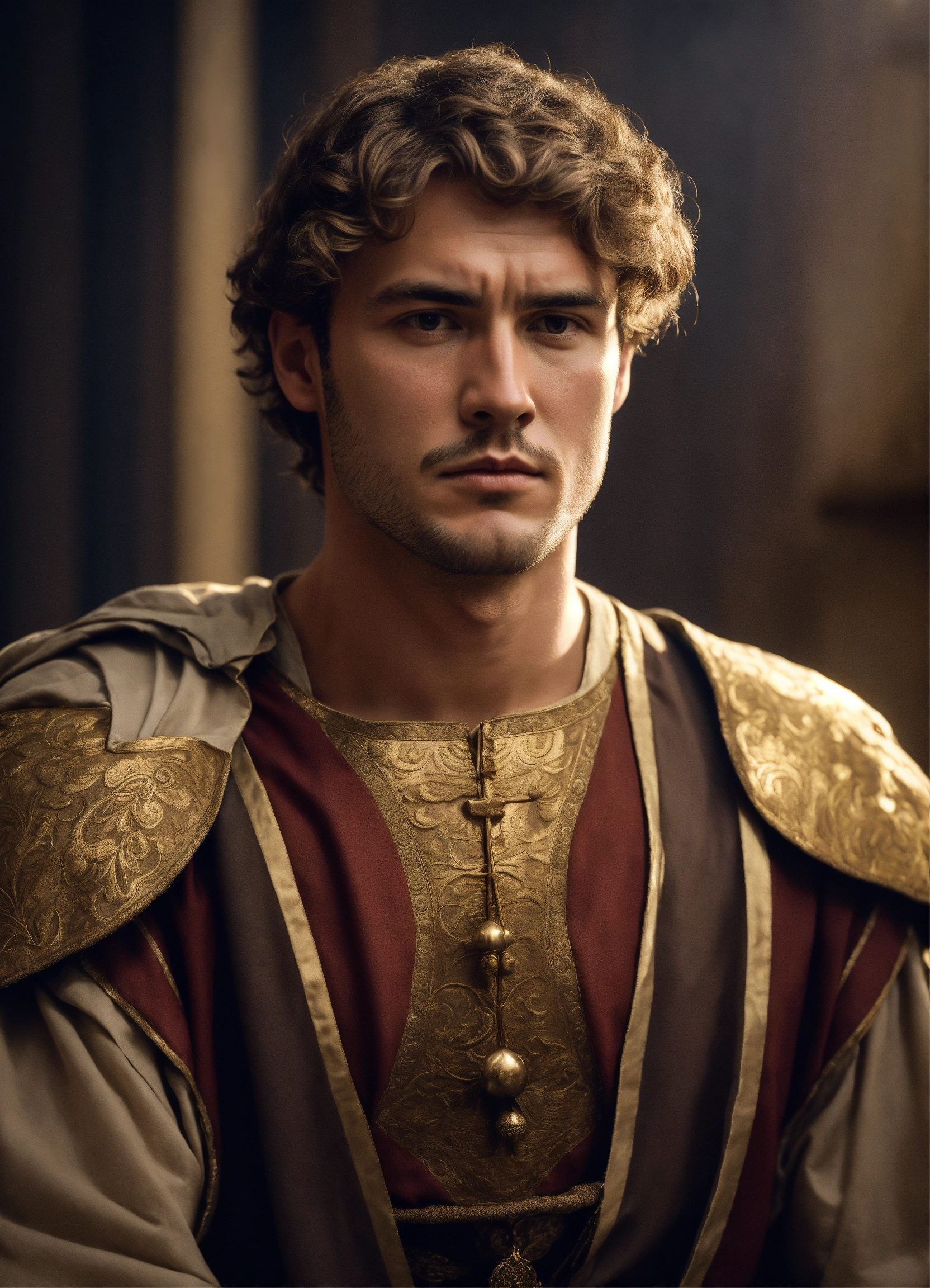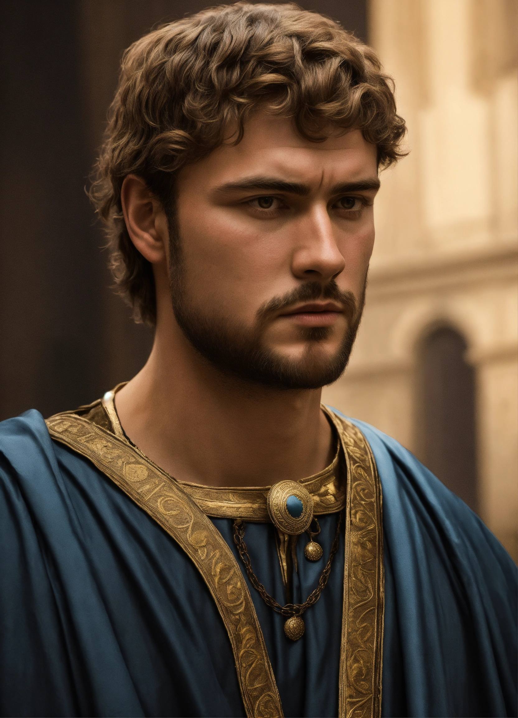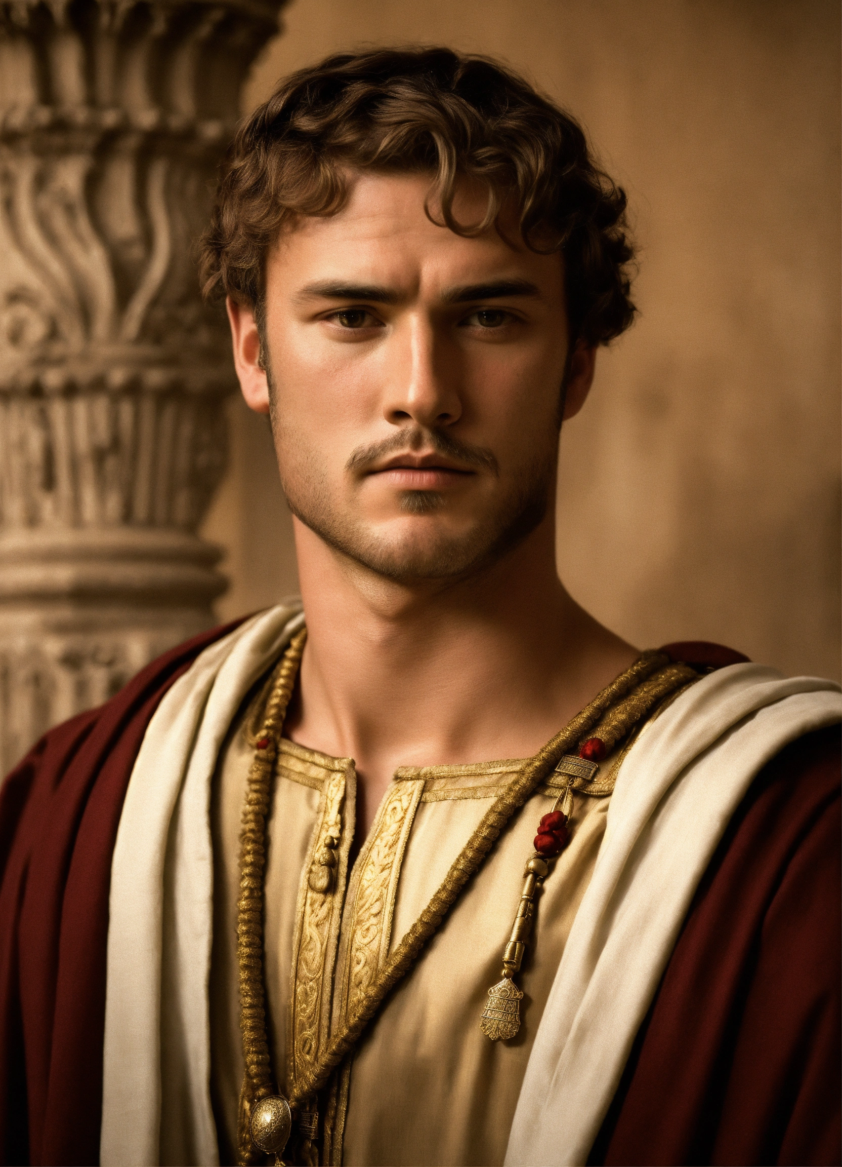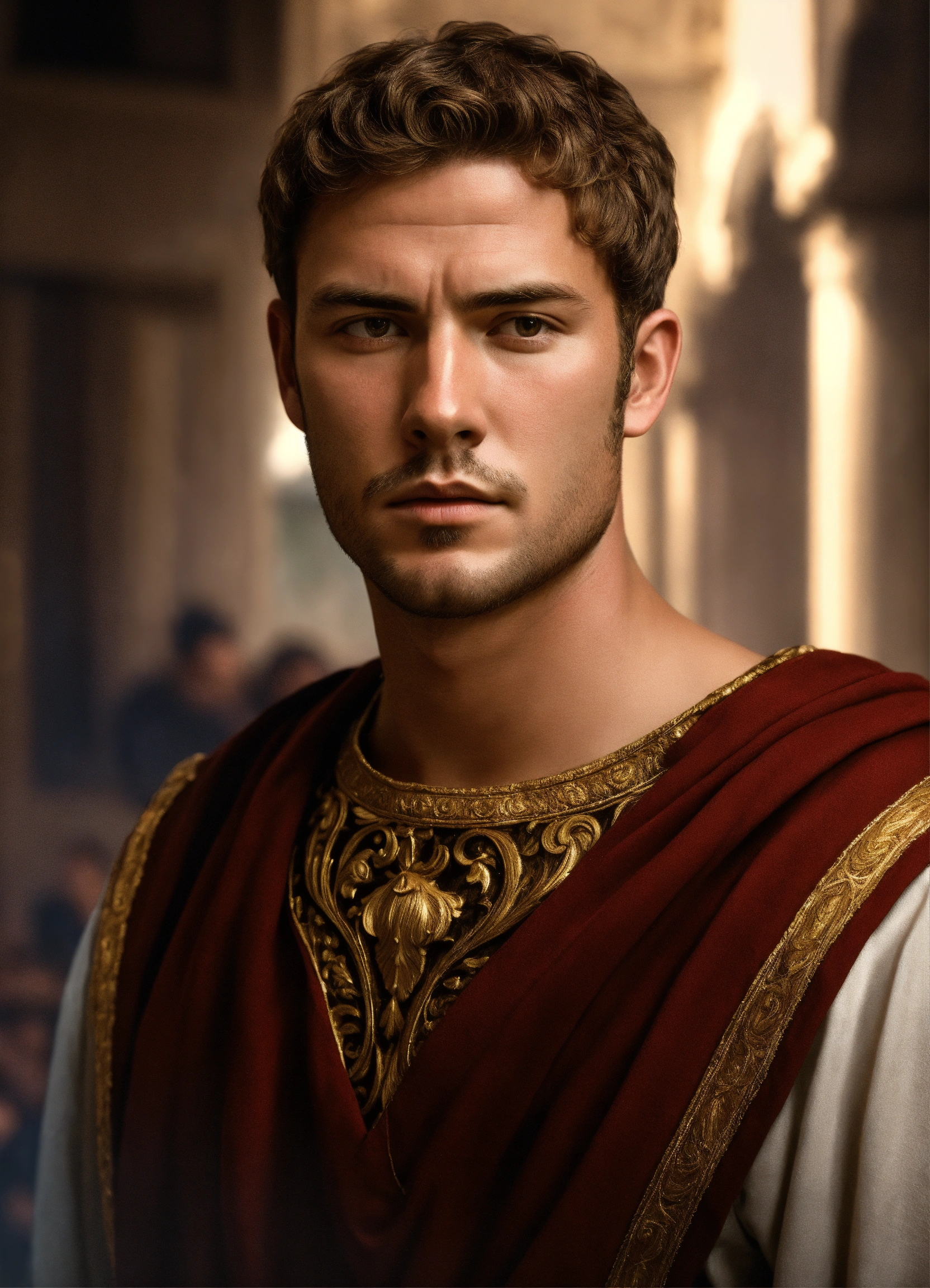 Realistic historically accurate noble man wearing a tunic from ancient rome, no smile, solemn, young, dark blonde