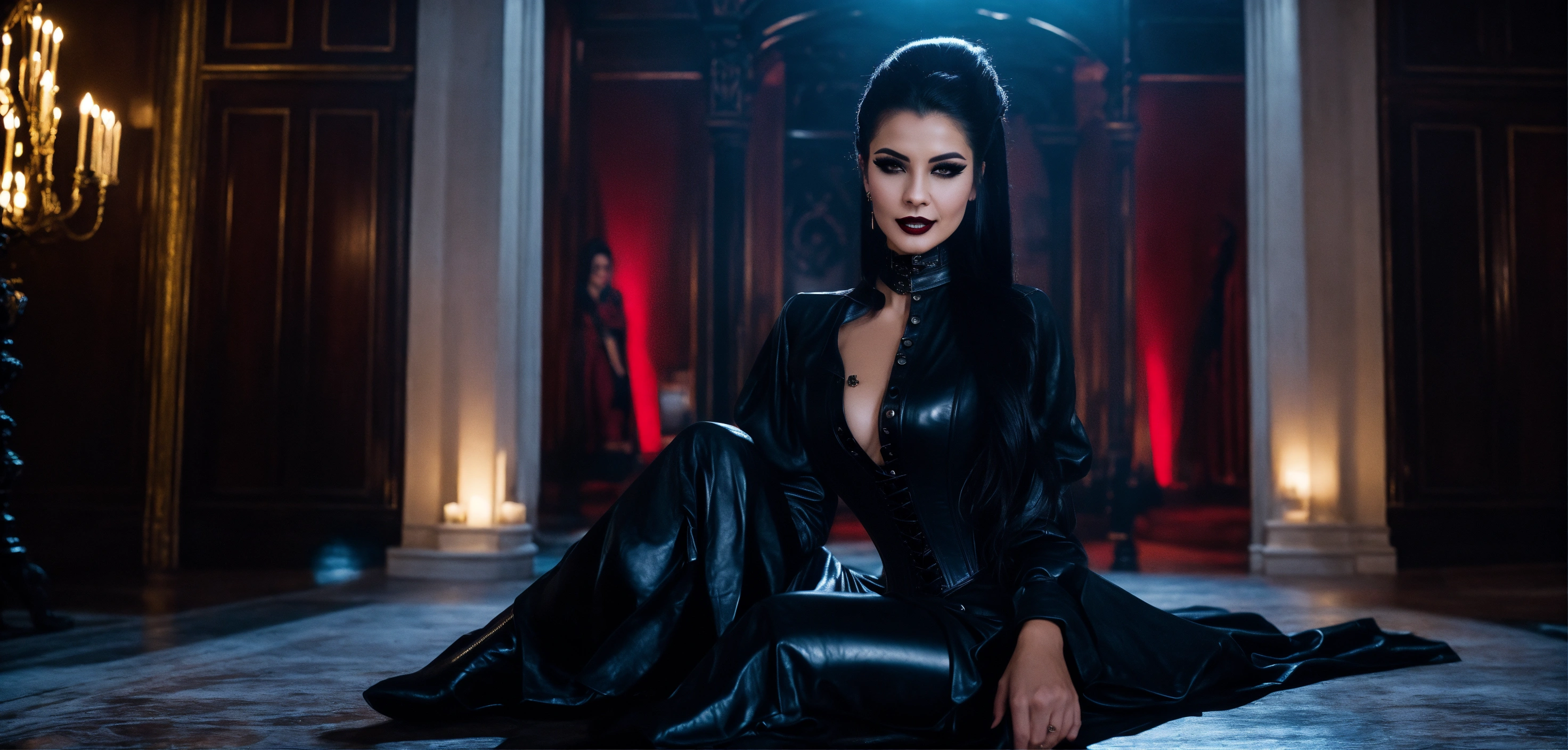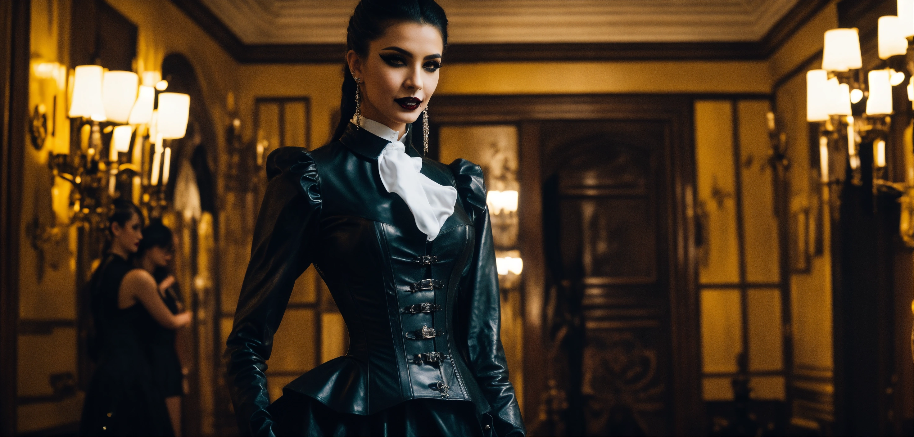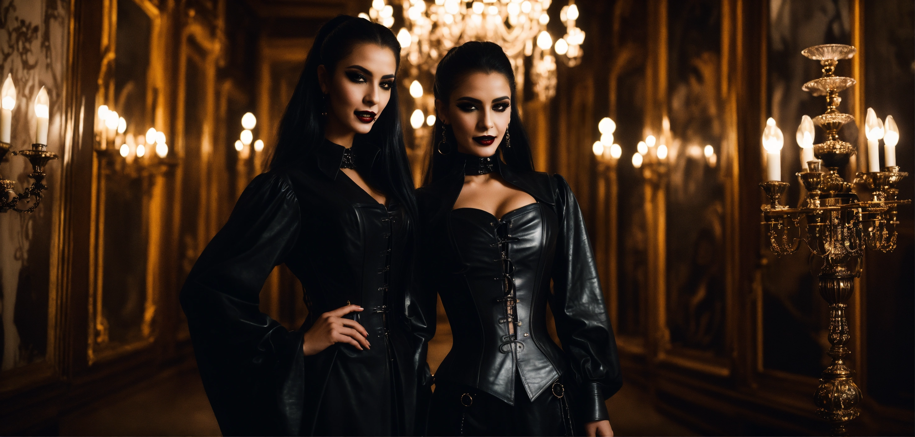 Cinematic look, two stunning arab seductress women fashion model, arrogant evil smile from above showing vampire teeth, black straight hair very high ponytail, black leather corset, long strict victorian governess wide black long leather shirt dress with long big puff sleeves and big buttons, mansion hall by night haze, white office shirt collar, eyeliner makeup, black leather boots, underworld vampire movie style