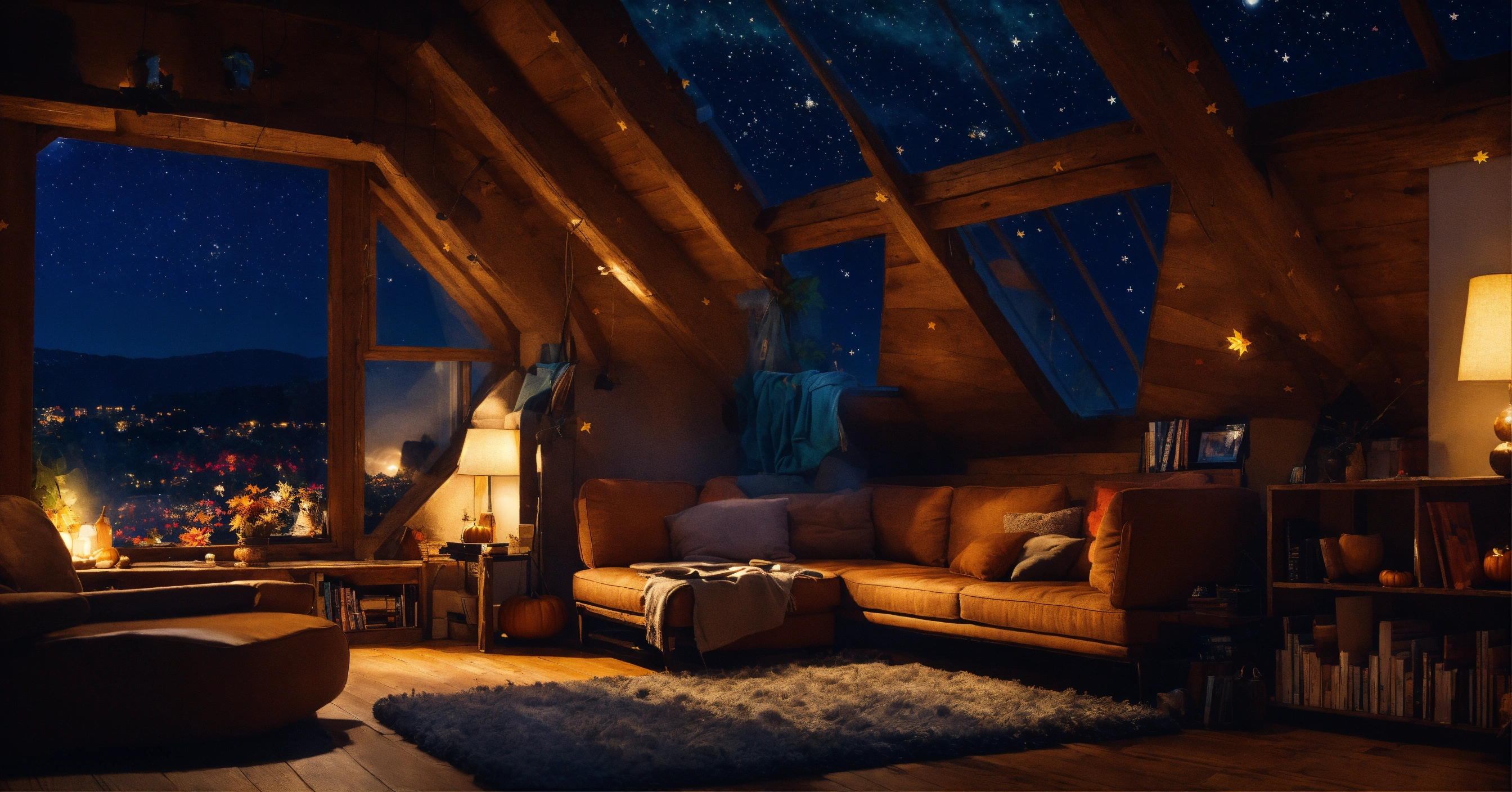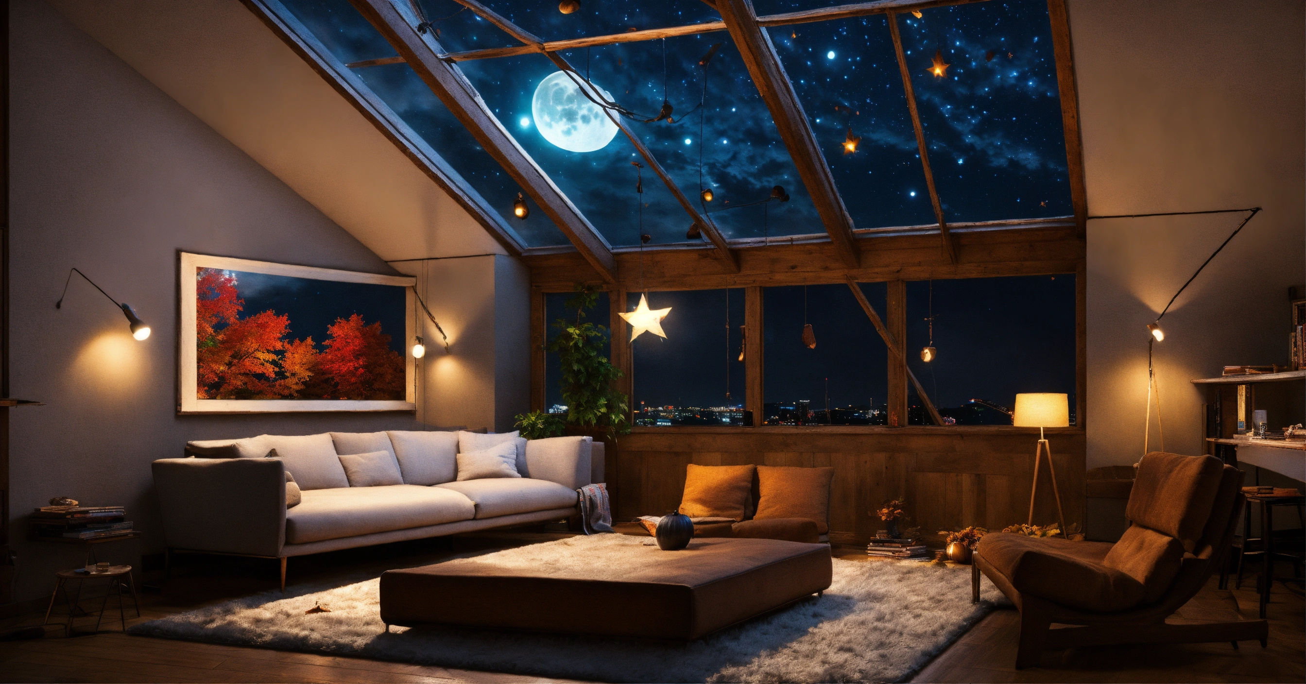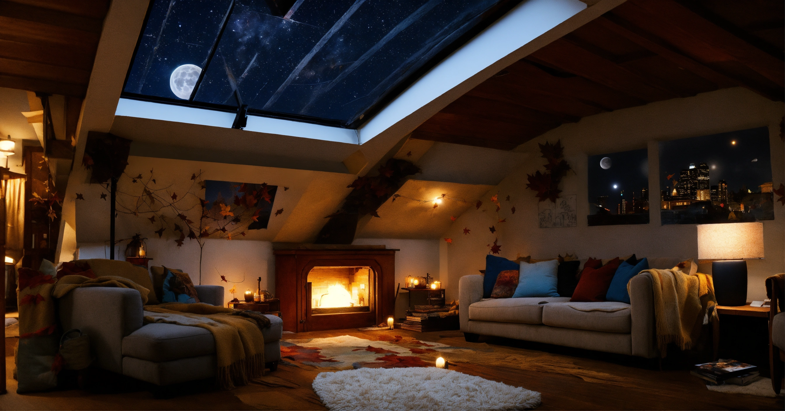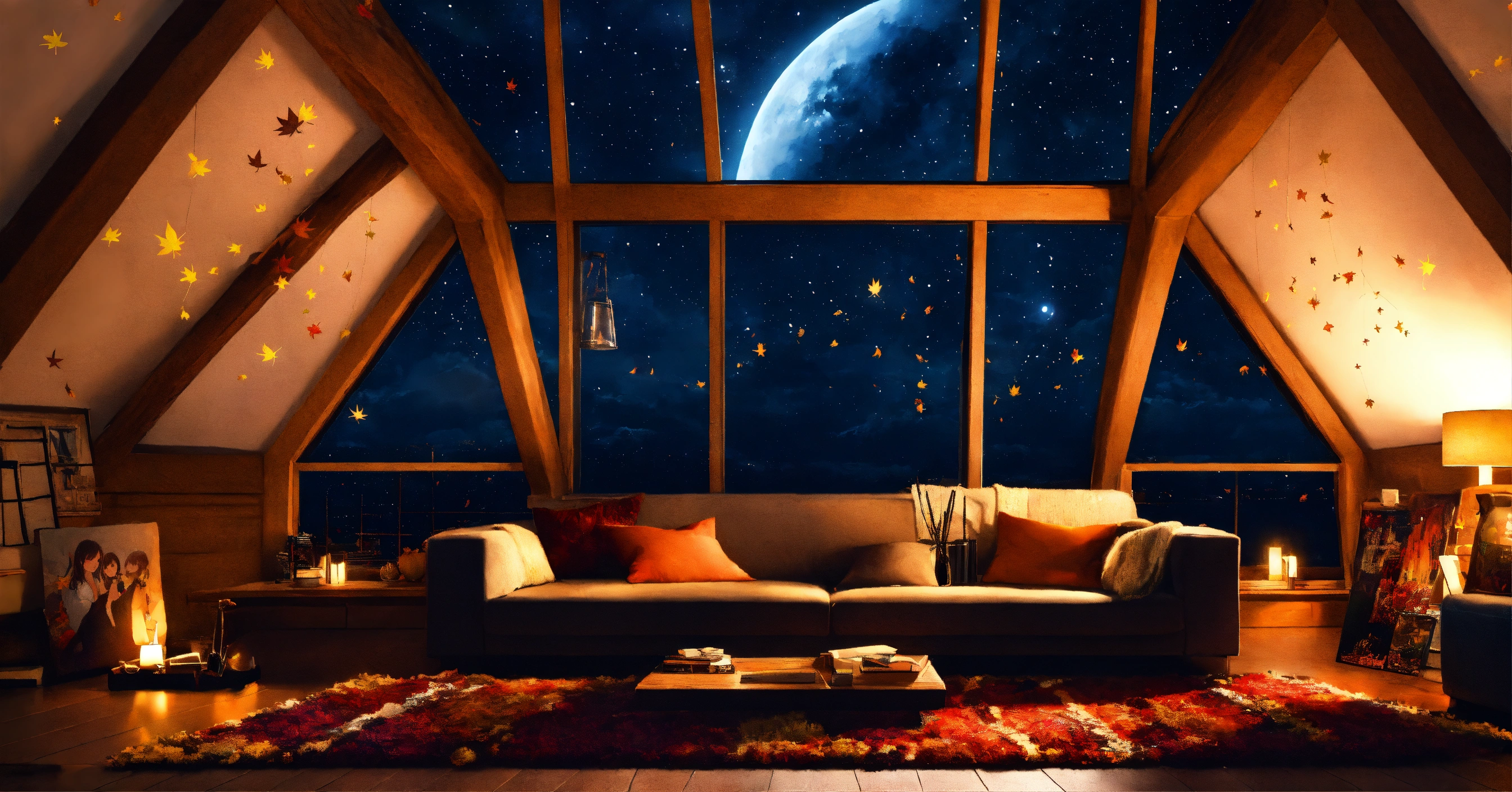 Night time attic, fall leaves, night window, fluffy rug, grafitti fall pics living room big couch dark wood, stars moon, sky ceiling