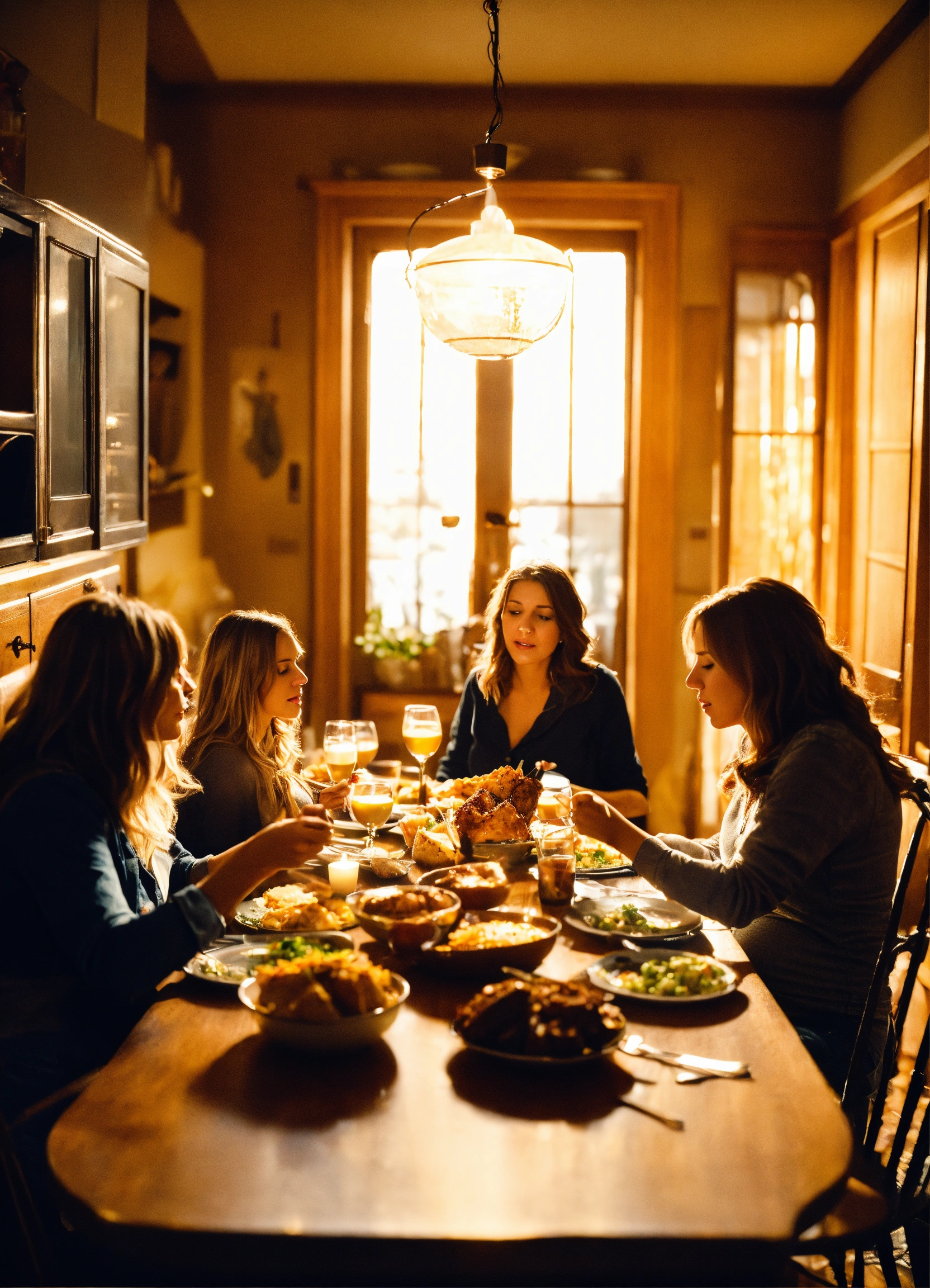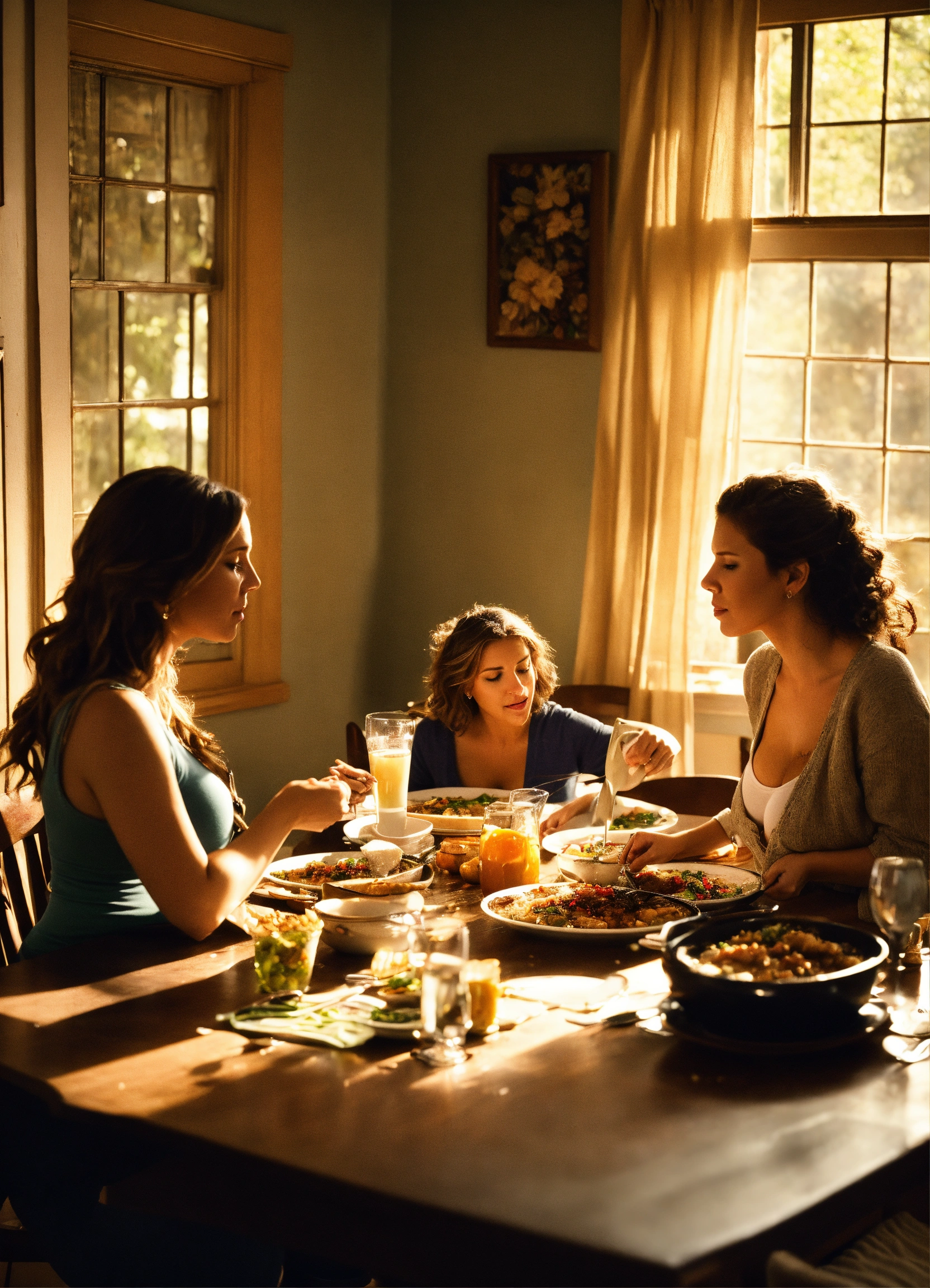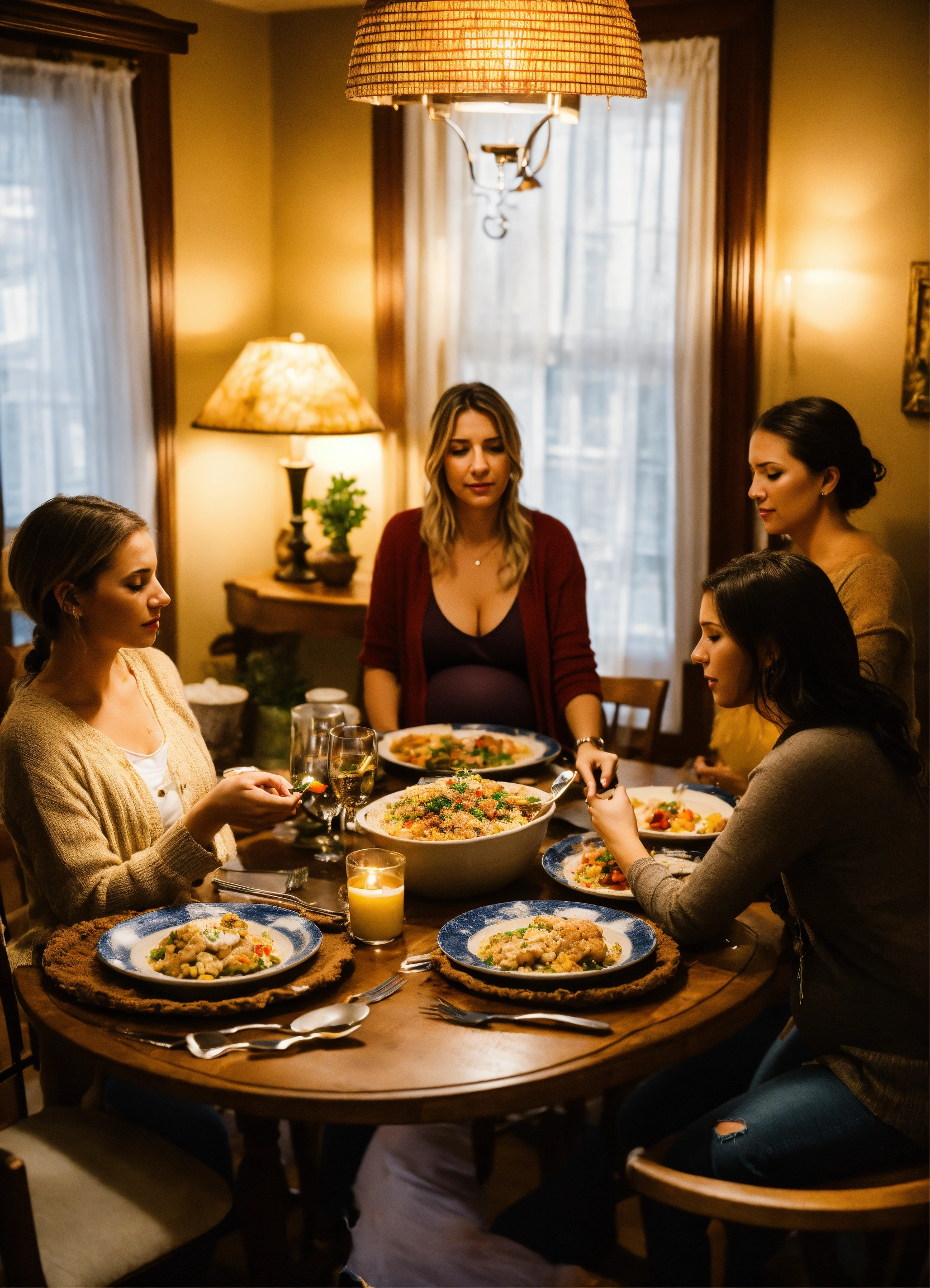 Three pregnant-looking caucasian women sitting back in their chairs at a dining room table, groaning with their hand on their chest. they wear i tops and casual unbuttoned jeans. the table is messy with dirty plates, scattered utensils, and a nearly finished turkey, encapsulating the typical post-thanksgiving dinner scene. the room has a warm, homely atmosphere with soft lighting.