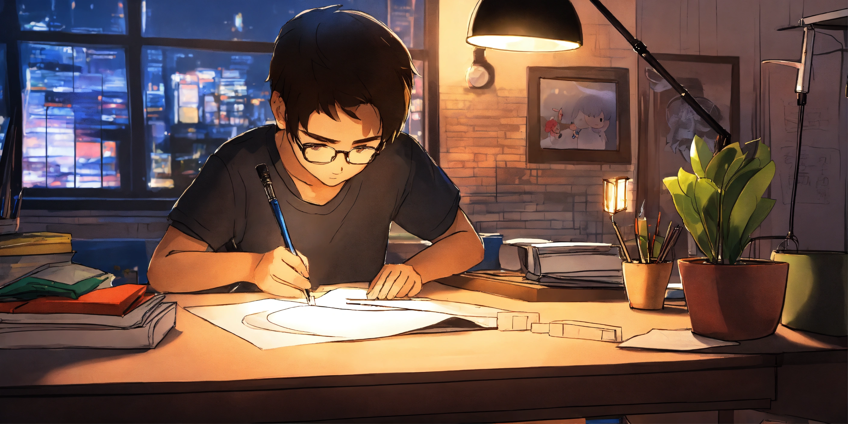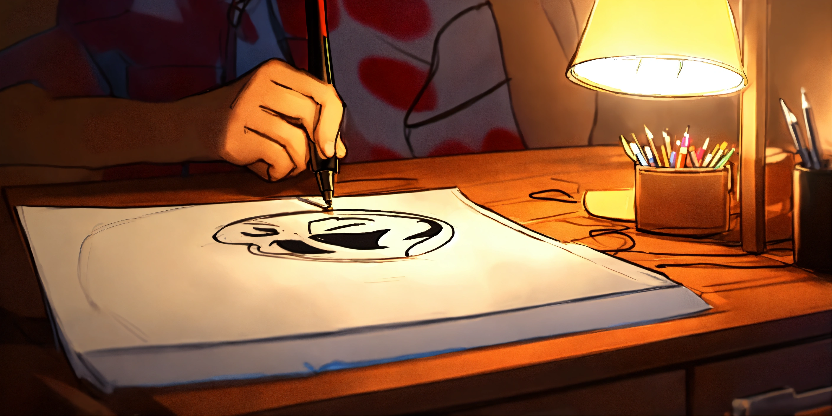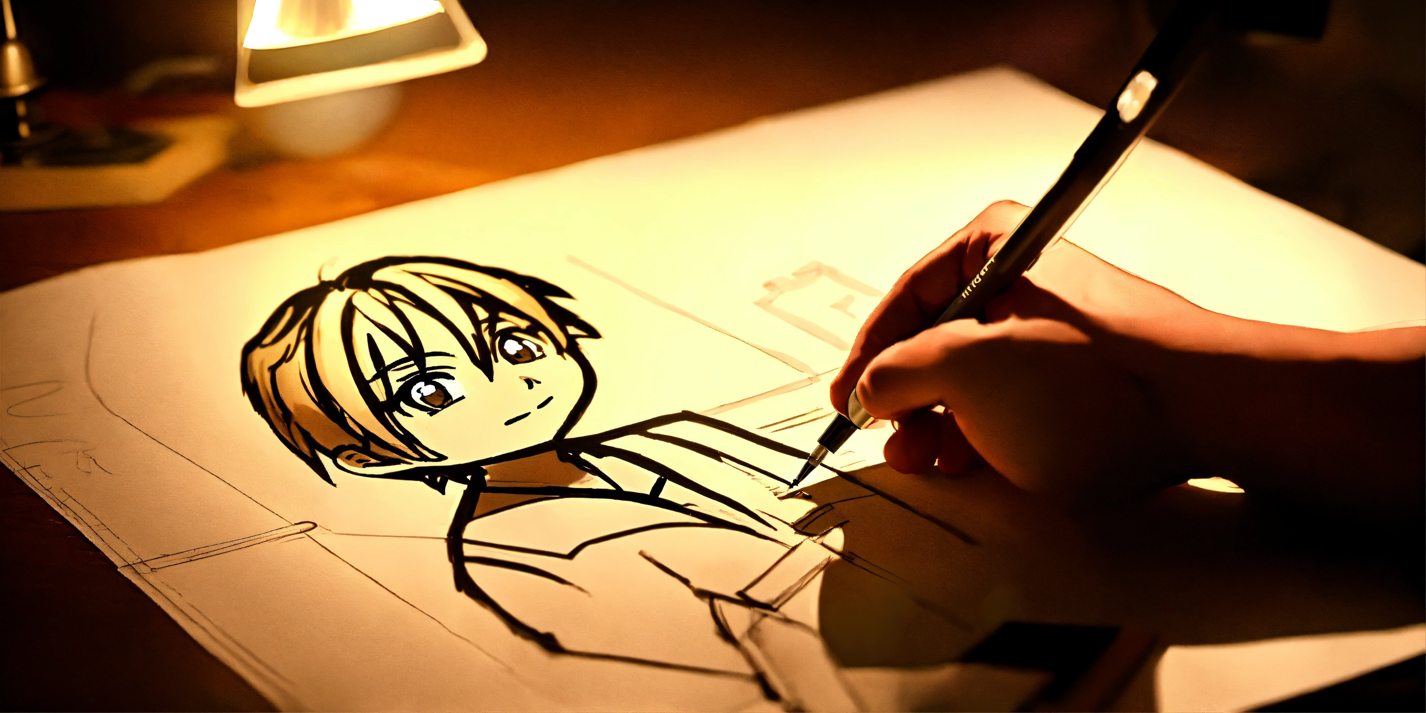 Man drawing an anime chibi paper sketch on a desk