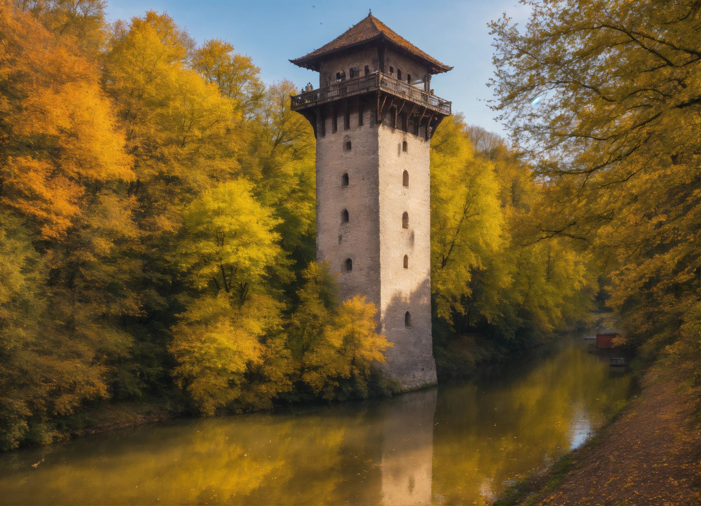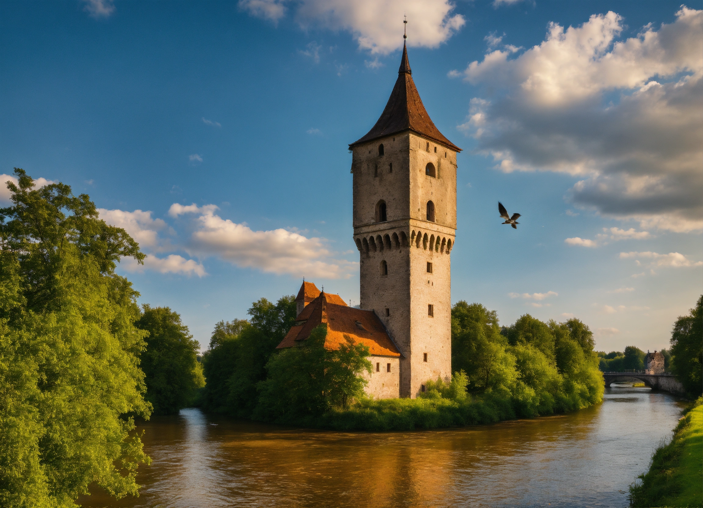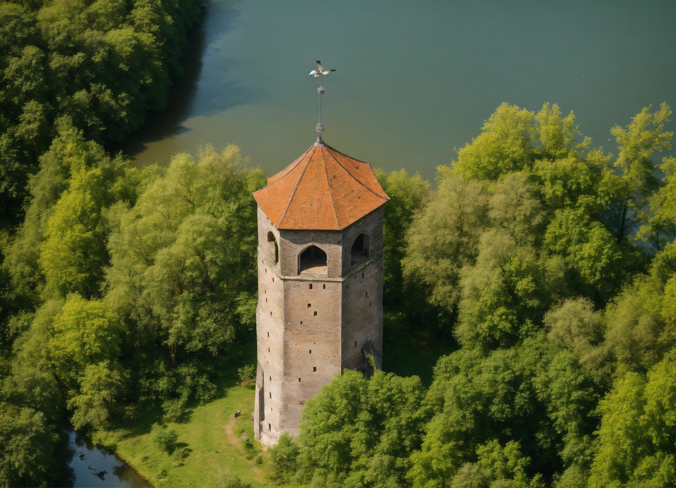 mittelalterlicher wachturm auf einem hügel an einer flussgabelung