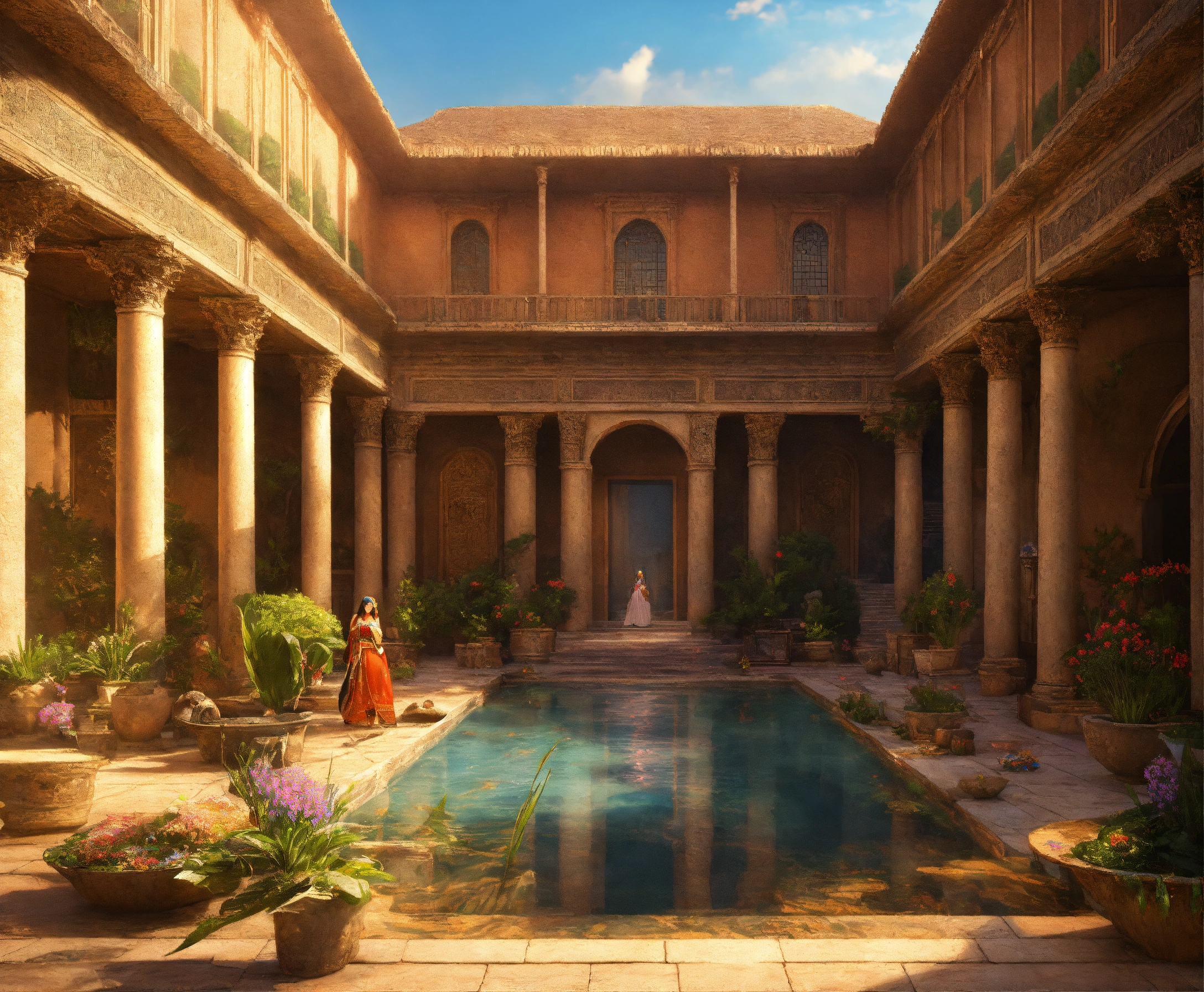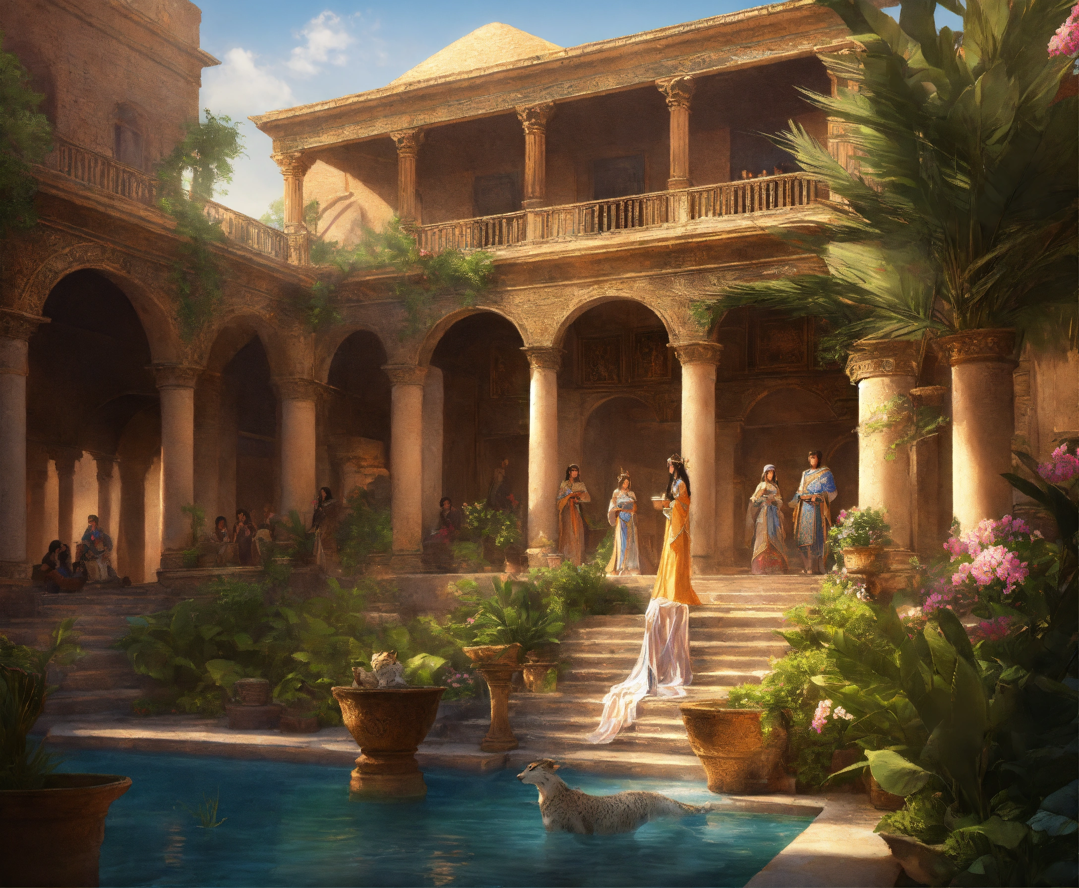 In 875 bc, there was a large group of beautiful assyrian princesses who wore colorful robes and veils and often meandered around the courtyard oasis pool at the imposing ancient palace with the handsome assyrian king of nineveh, but only because they were captives, and also in the courtyard are date palms and flowers and the occasional scampering cheetah, the princesses have anatomically correct features, look realistic and very human, natural, digital art, digital painting, sharp focus, sharp colors, 3d cinematic, imax, intricately detailed, stunning, oil painting, elegant, renaissance, symmetrical architecture, golden hour, unreal engine, frostbite engine, style of thomas kinkade, michaelangelo, can you please generate more than one princess for crying out loud