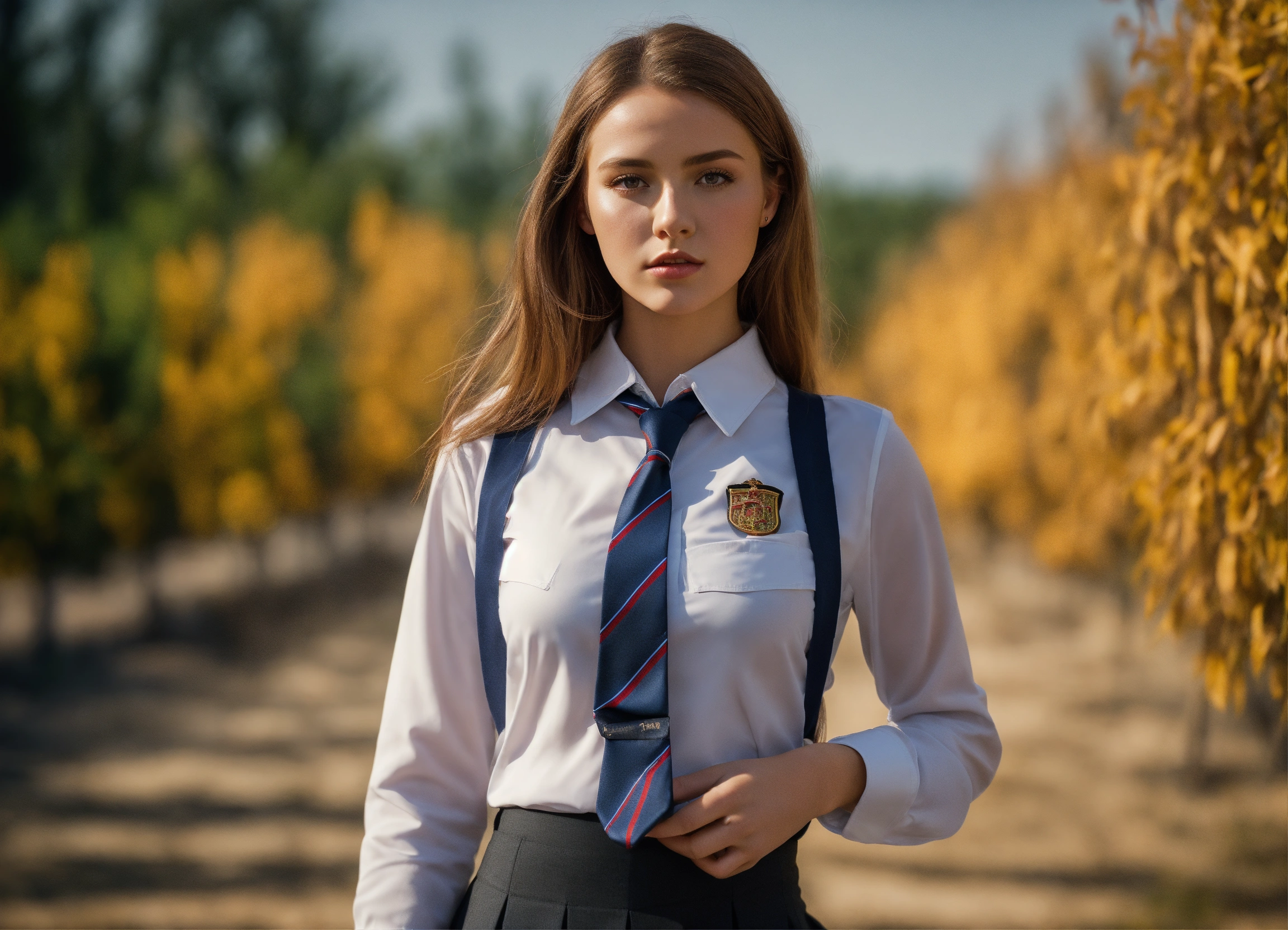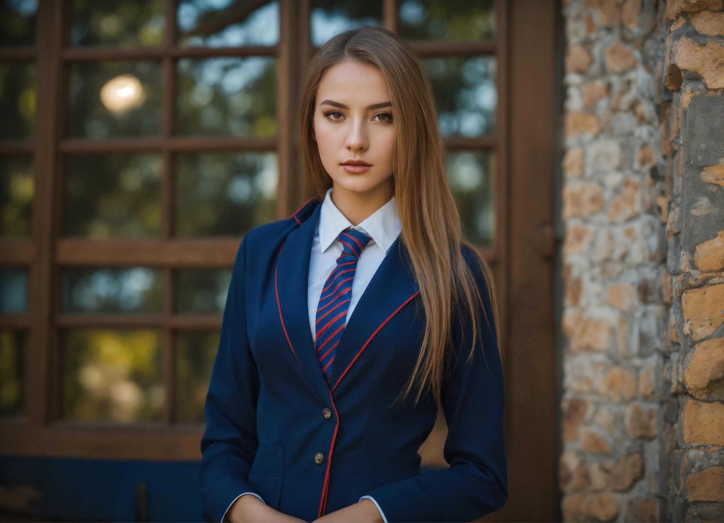Hot adult woman, spanish girl, spain, schoolgirls in uniform, private school uniform, jacket, tight shirt, skirt, tights, feminine, school scenes, aura of beauty, relaxation, released tie, wide bust, belarussian girl, in belarus, sharp focus, 8k high definition, clothes too small and thin, undersized shirt and prominent body, shot on medium format filmschool], cinematic, 8k, masterpiece, studio photography, eos r6, realistic, natural light, octane render, adobe lightroom, rule of thirds, symmetrical balance, depth layering, polarizing filter, sense of depth, ai enhanced, tailored shirt, tight-fitting