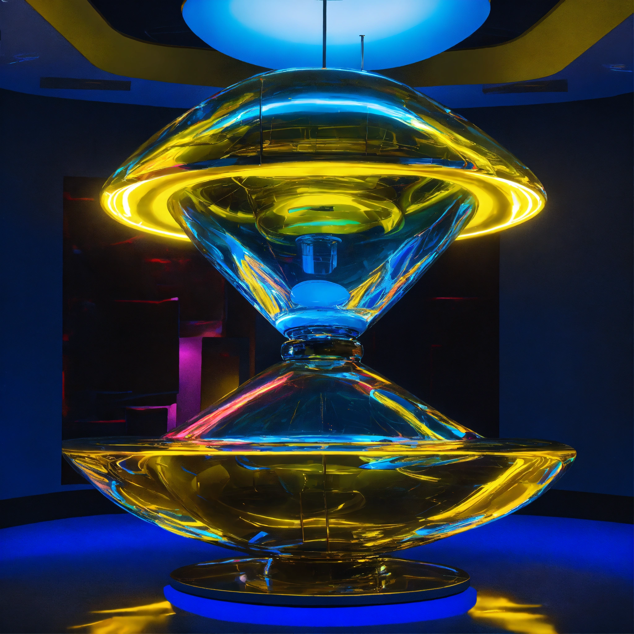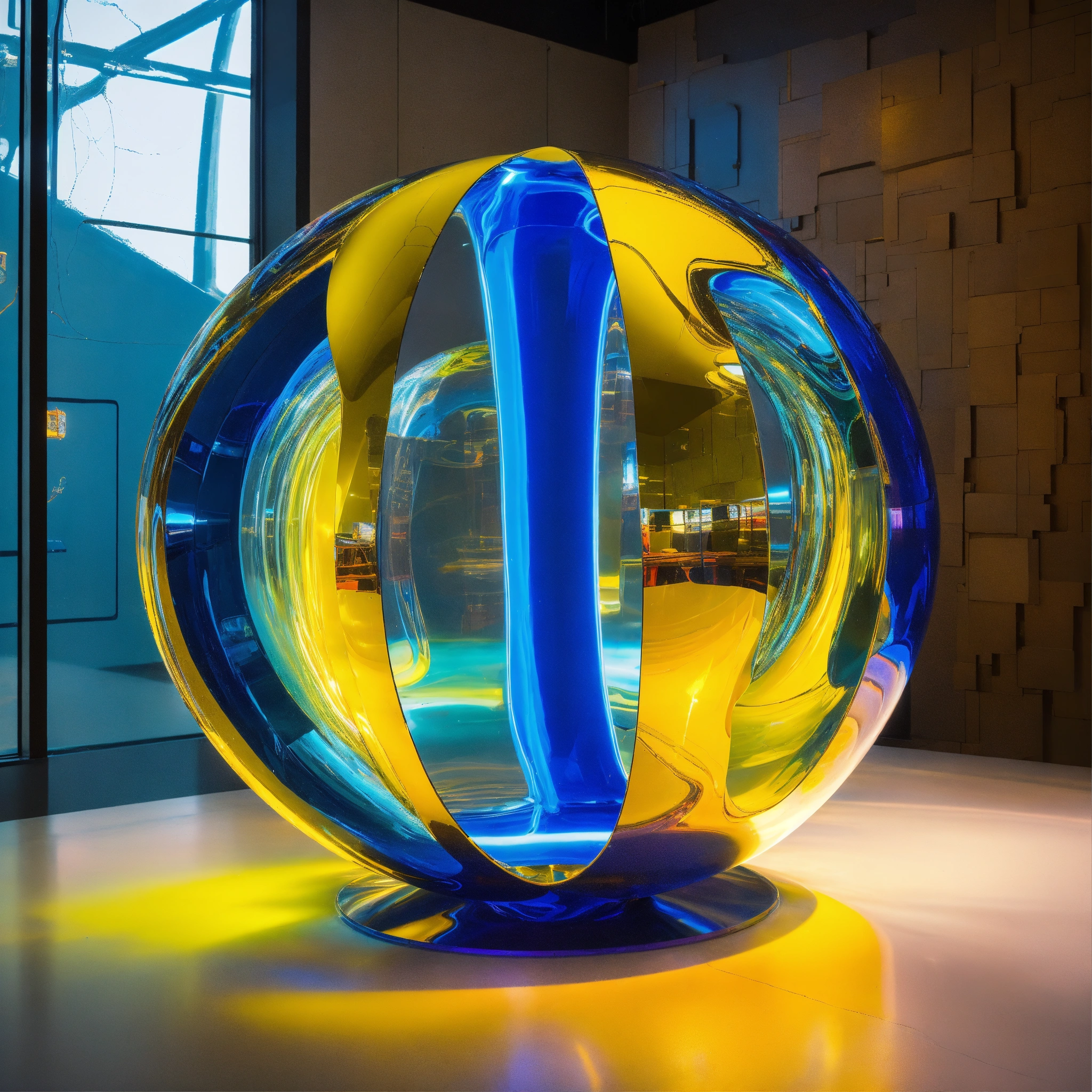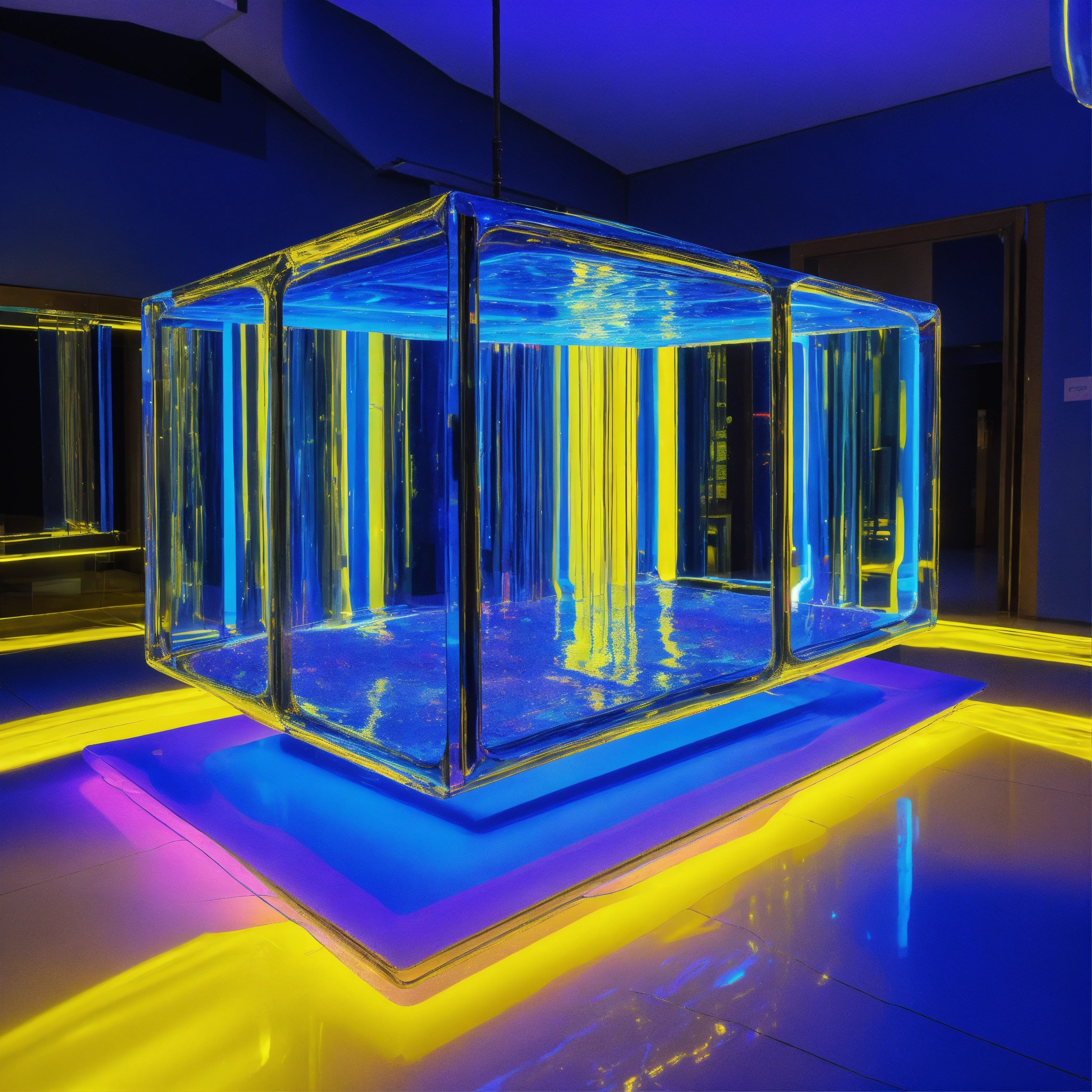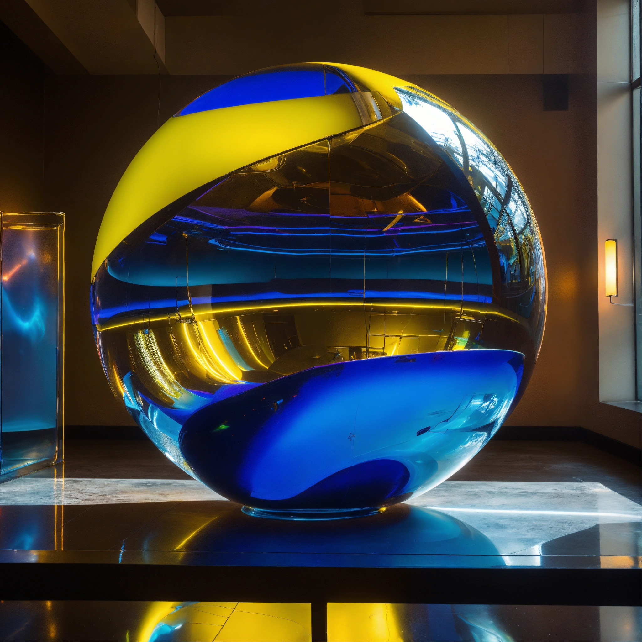 Metallic and glassy surface, vivid tones of blue and yellow, surreal futuristic neat object, heavenly light, intense neon lights, a glass installation that fills the room. one abstract representative object floating --ar 169 --s 1000 --c 15