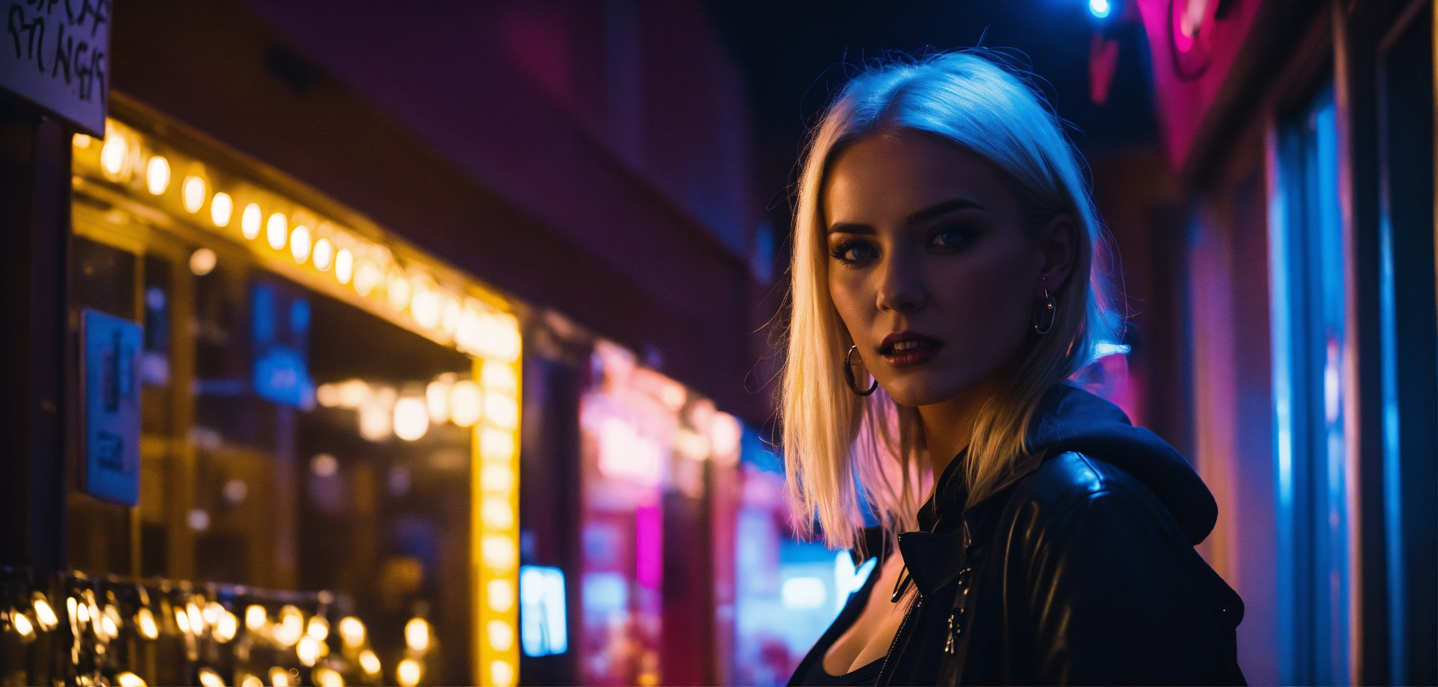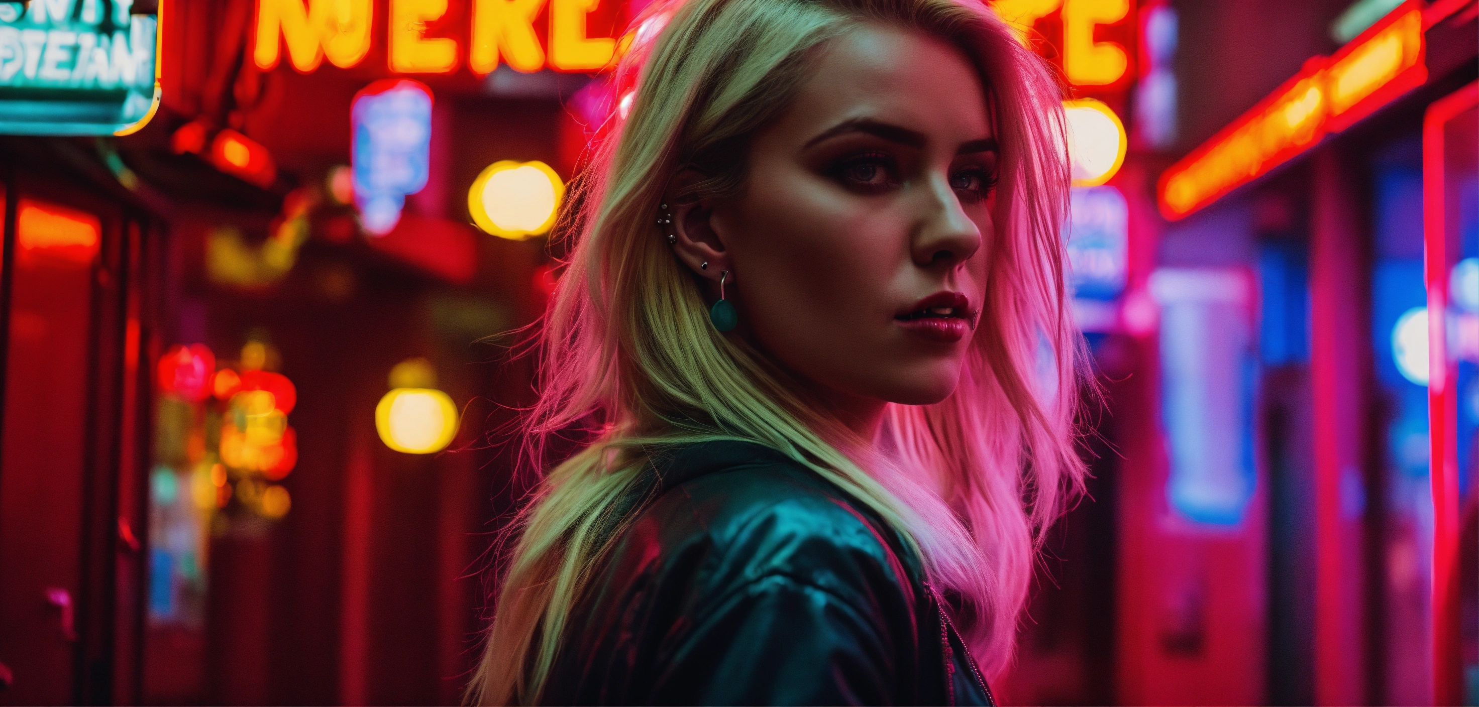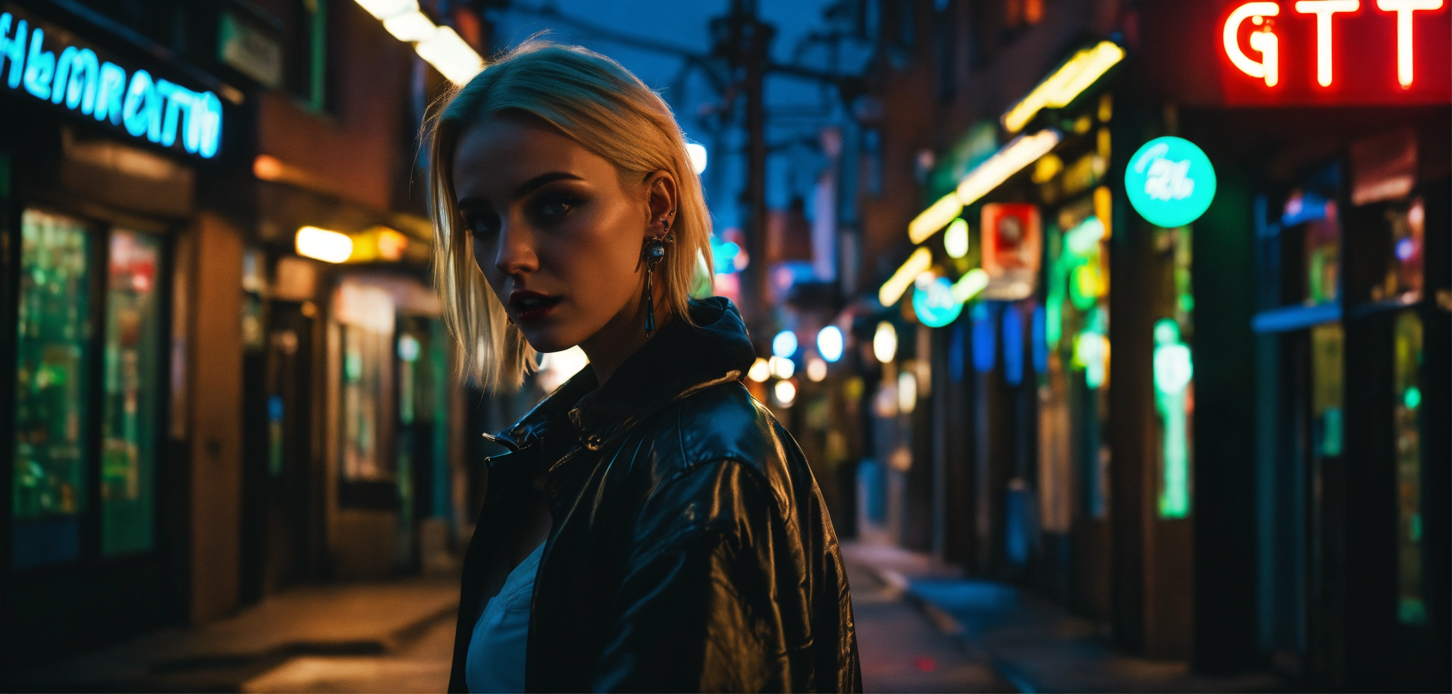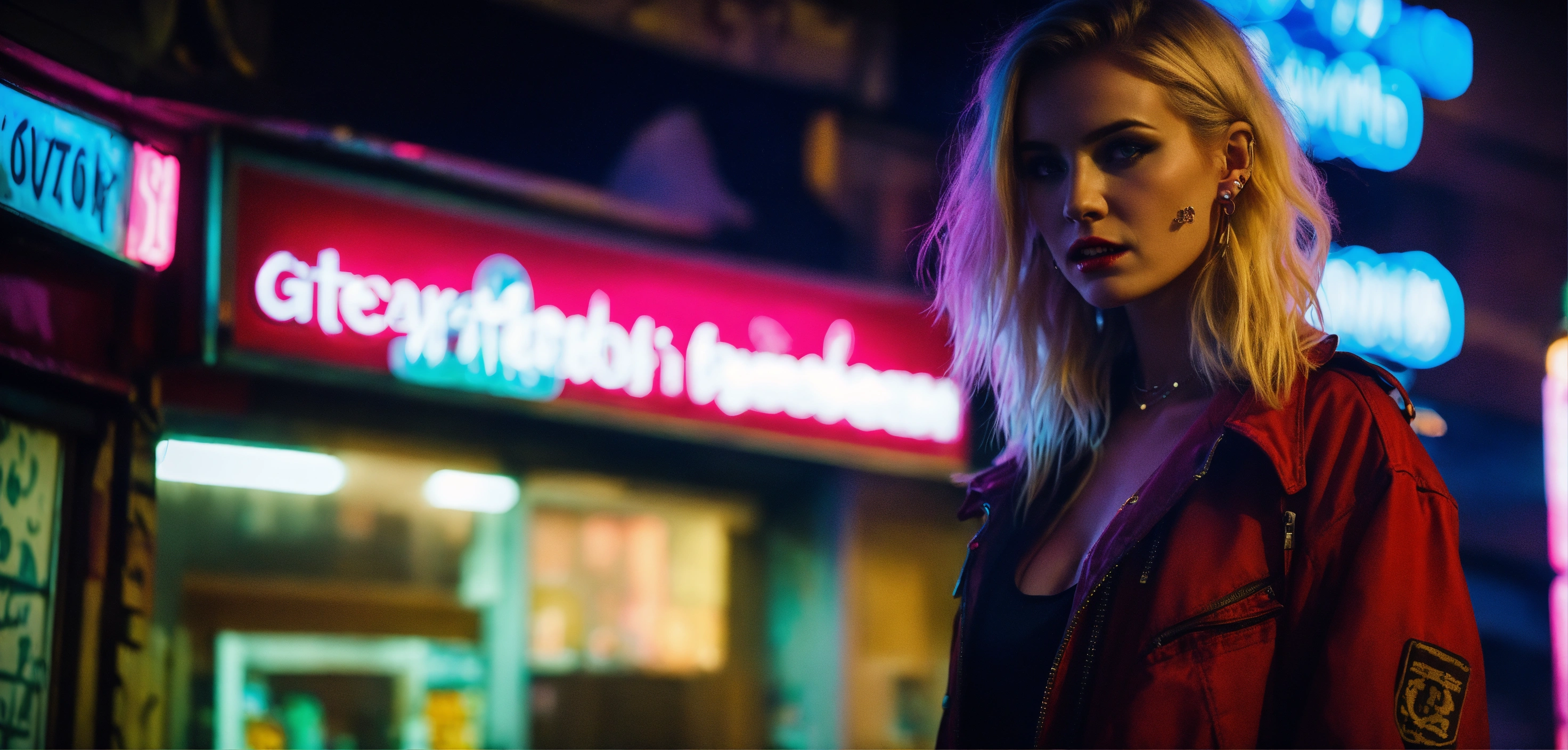 Cinematic look, urban city side street by night, stunning blonde woman, looking crazy, ear and nose piercings, wearing getto streetwear, underworld vampire movie style, dark atmosphere, ceiling light dimmed light, pharmacy neon sign