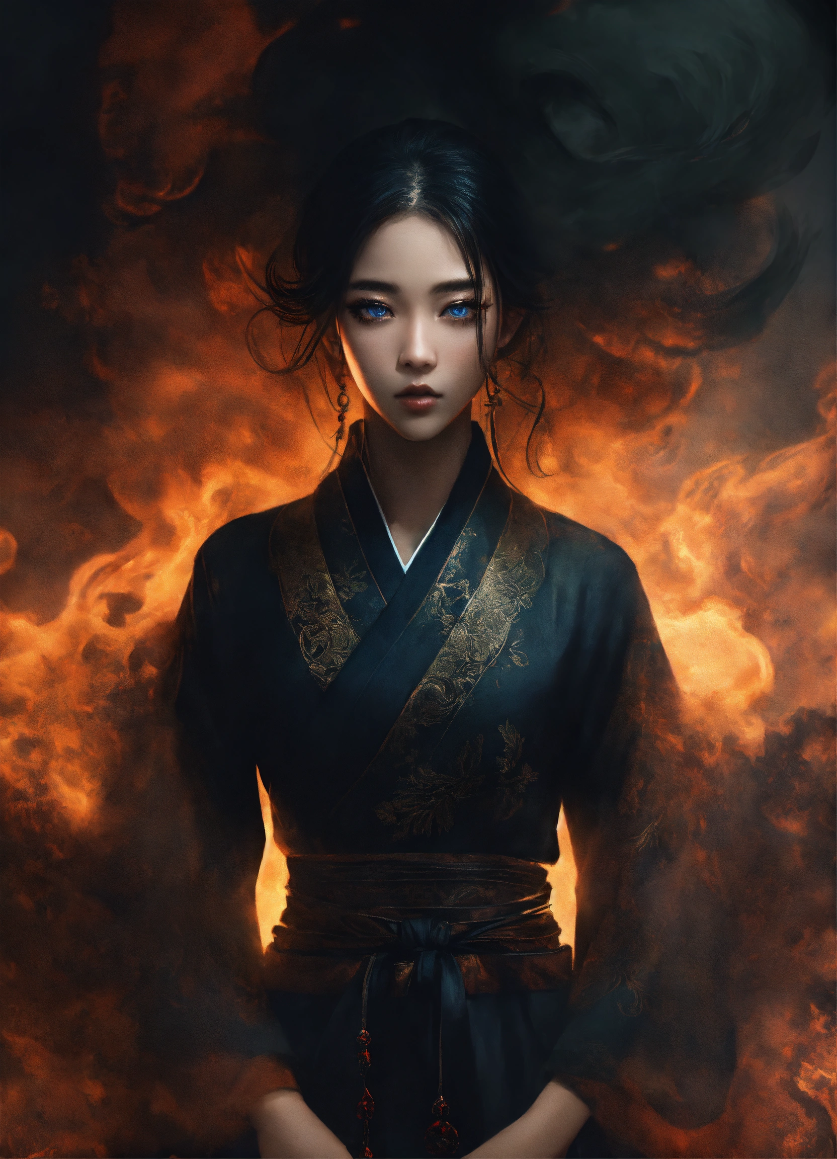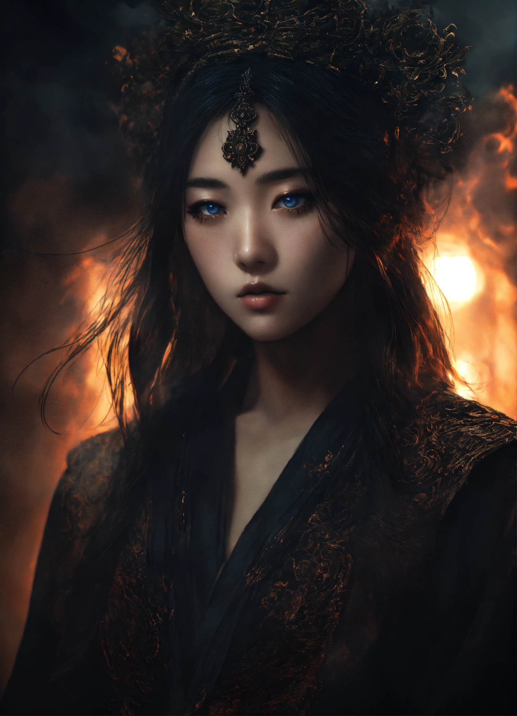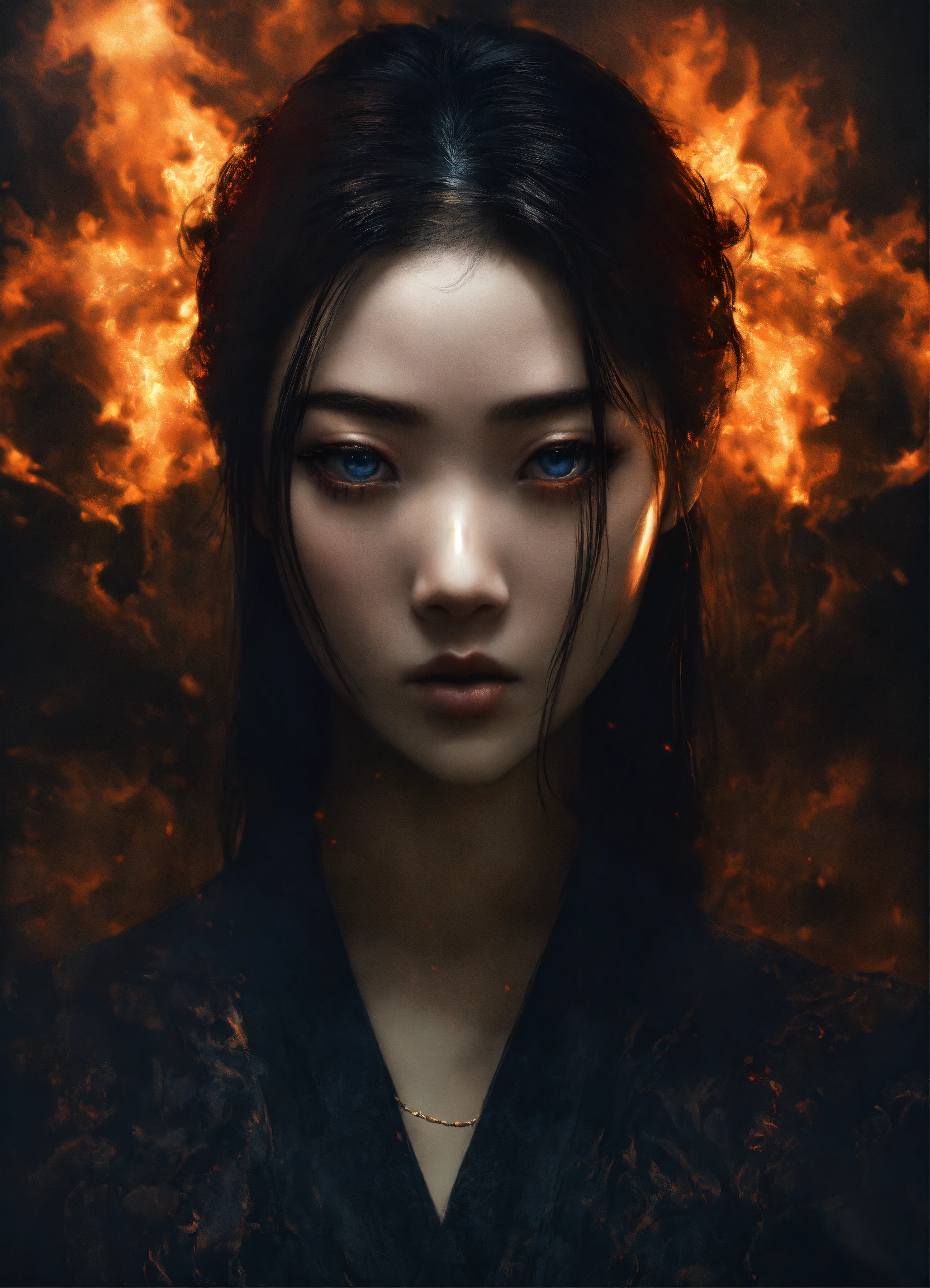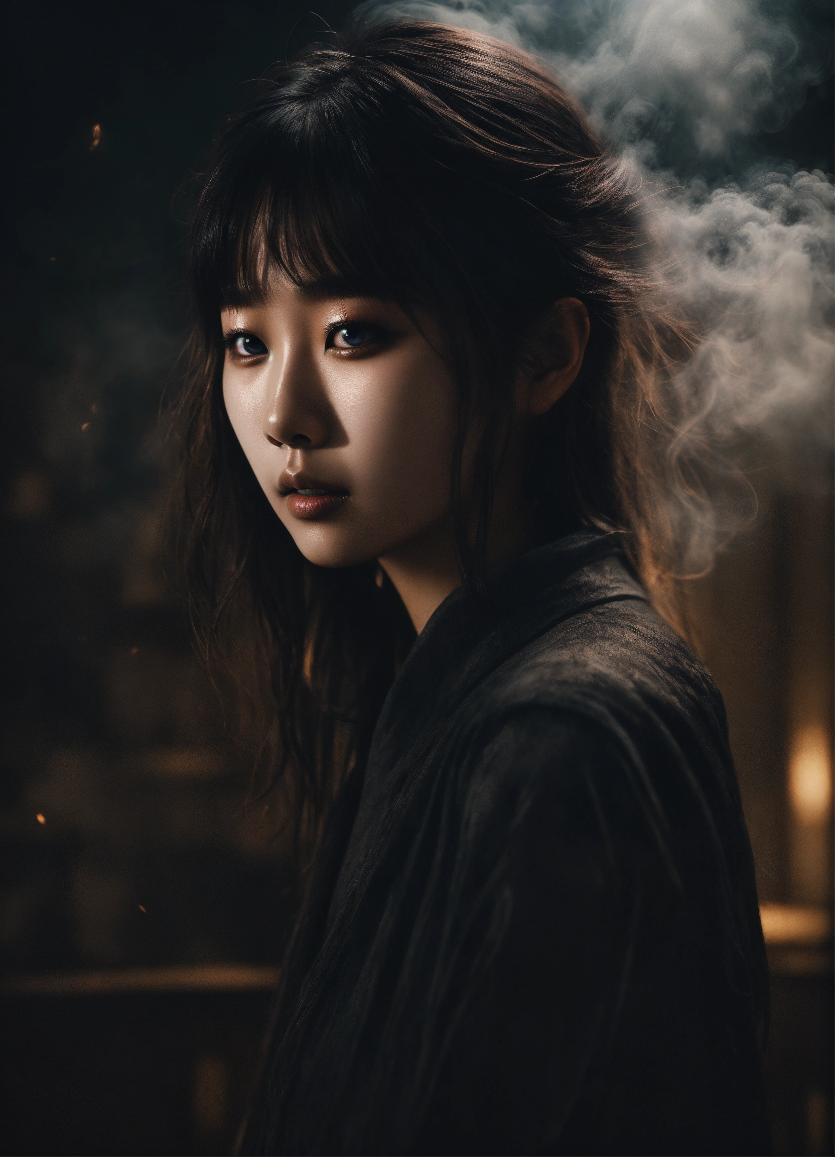 Beautiful korean girl evaporating into black smoke, shadow background, ominous, concept art, fantasy, cinematic, hyperdetailed eyes