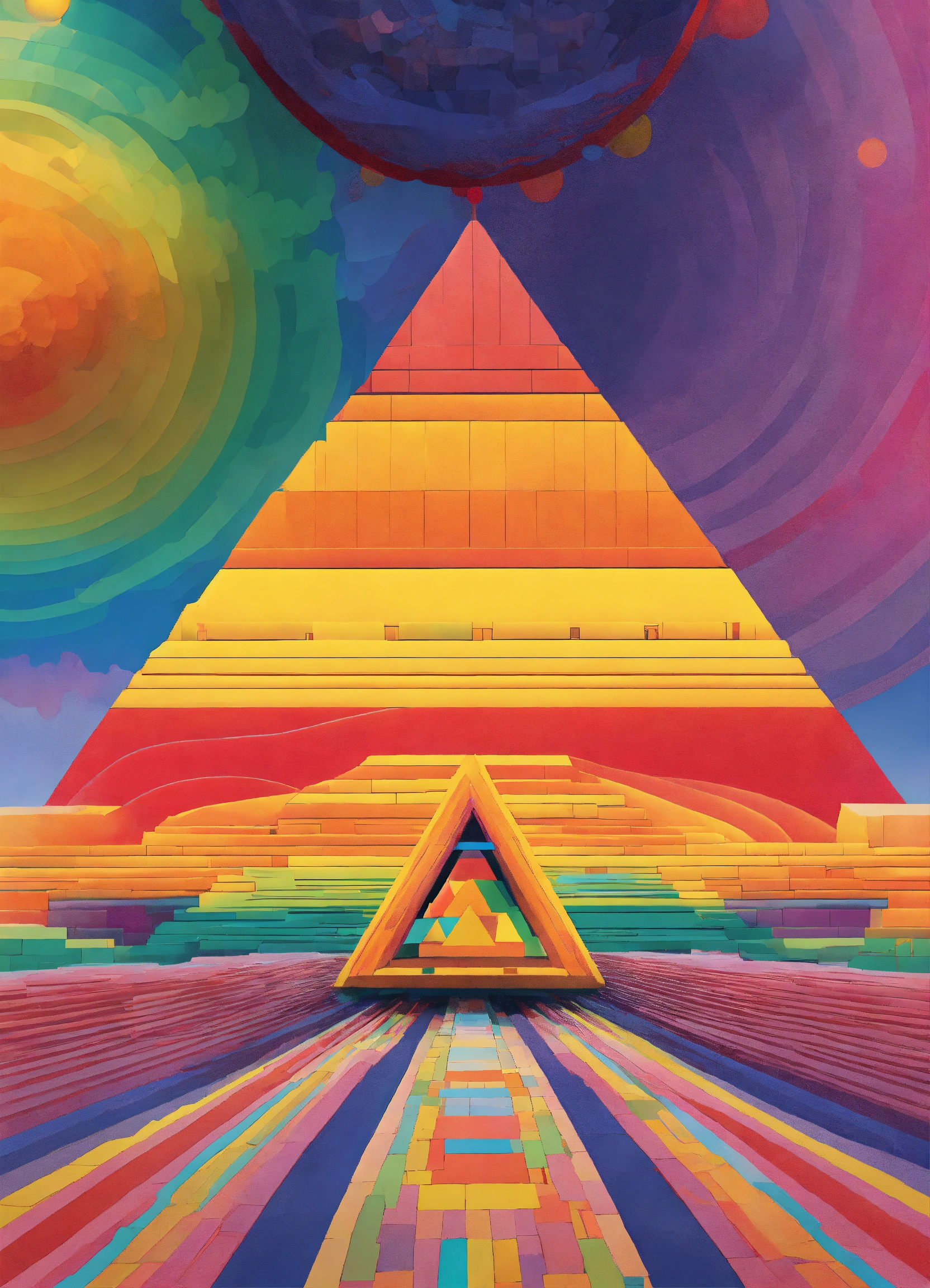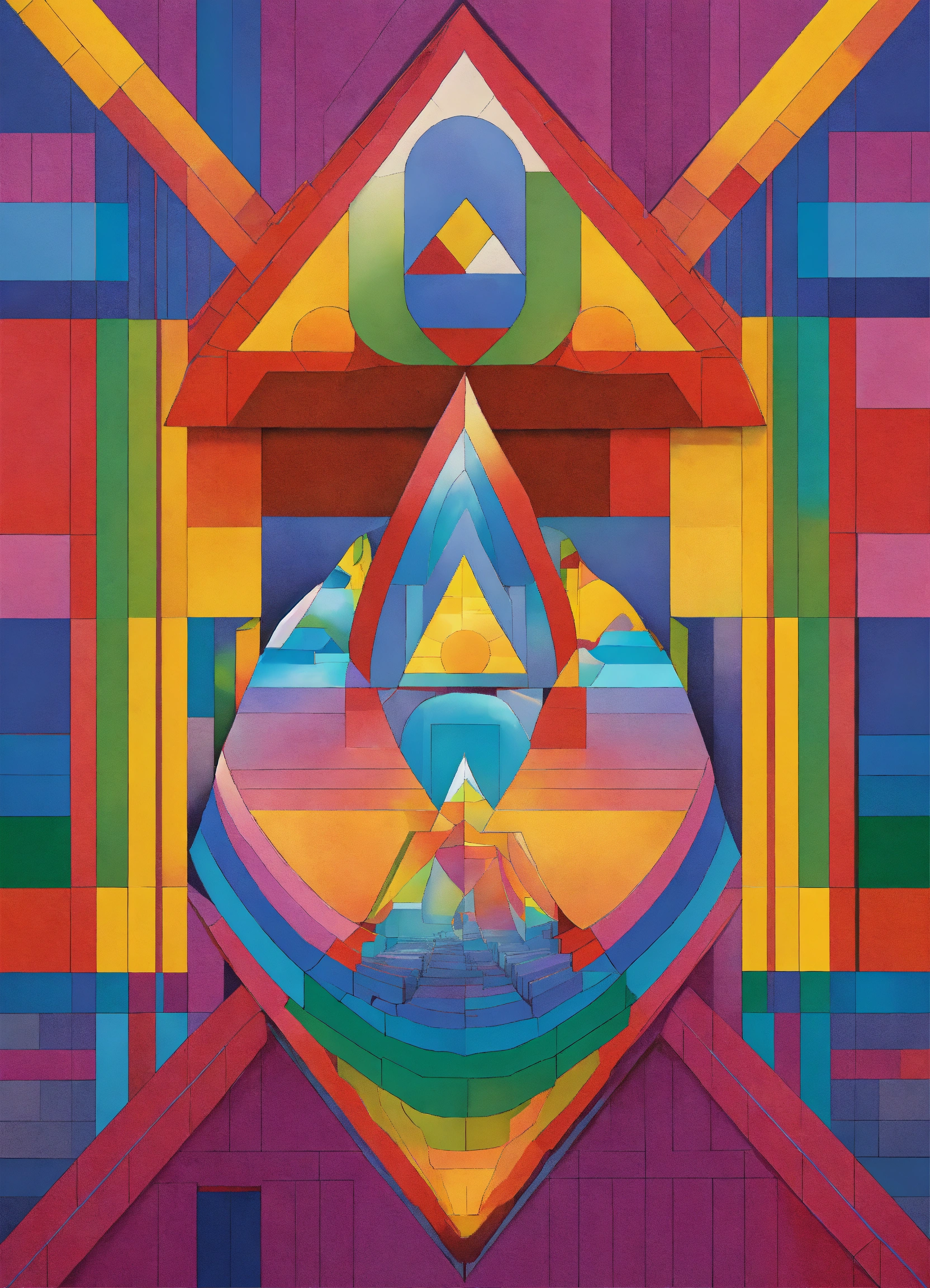 Tibet geometric abstraction, rainbow colours, digital illustration by shusei nagaoka, galactic harmony.
