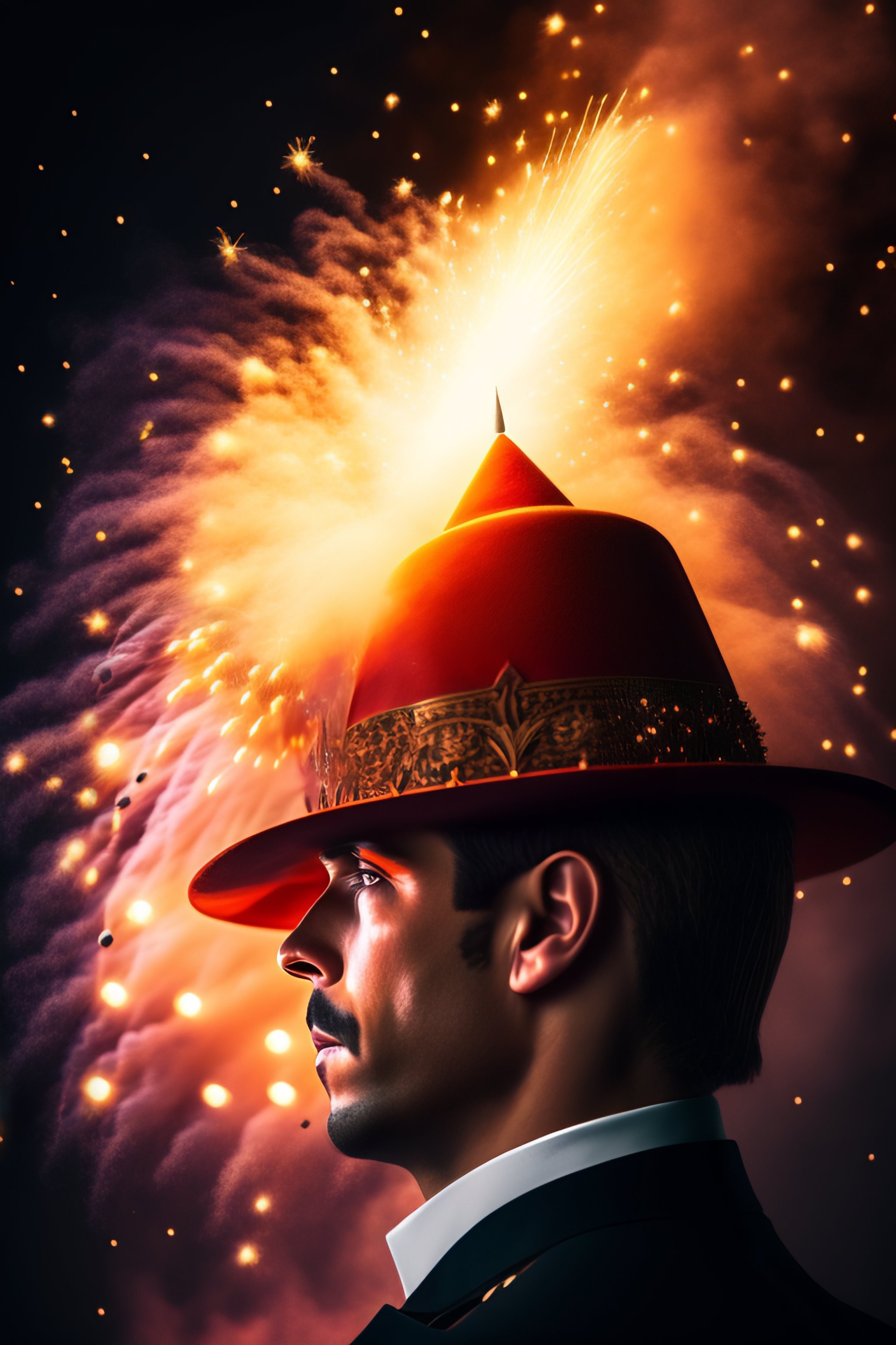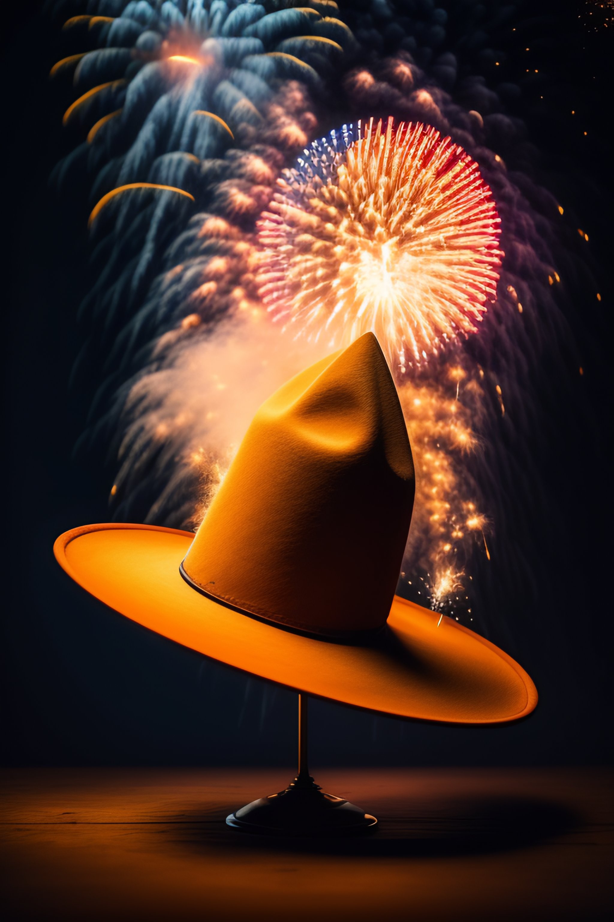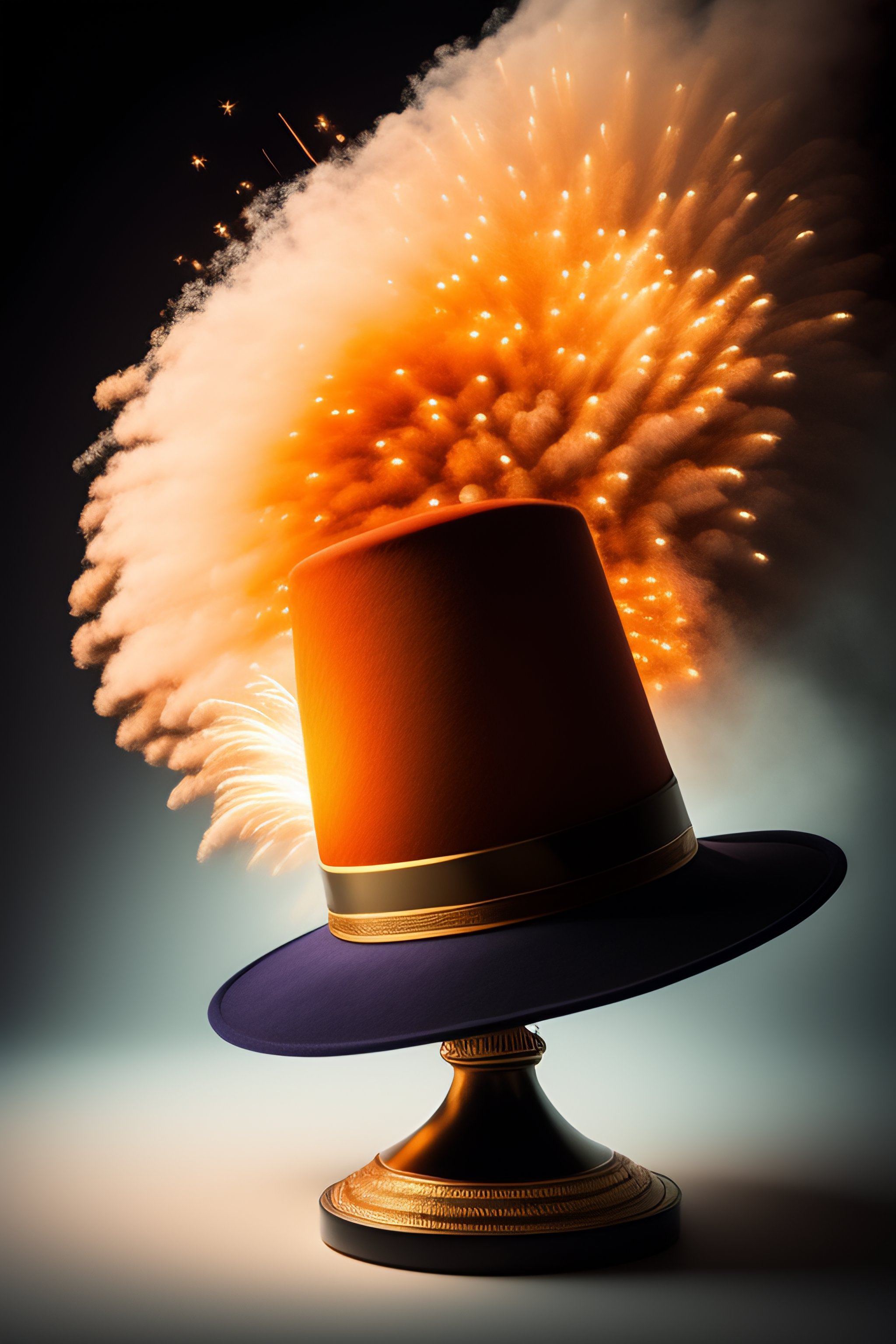 A magician's hat with fireworks exploding from it, one of the explosives is a ball that contains a raffle ticket