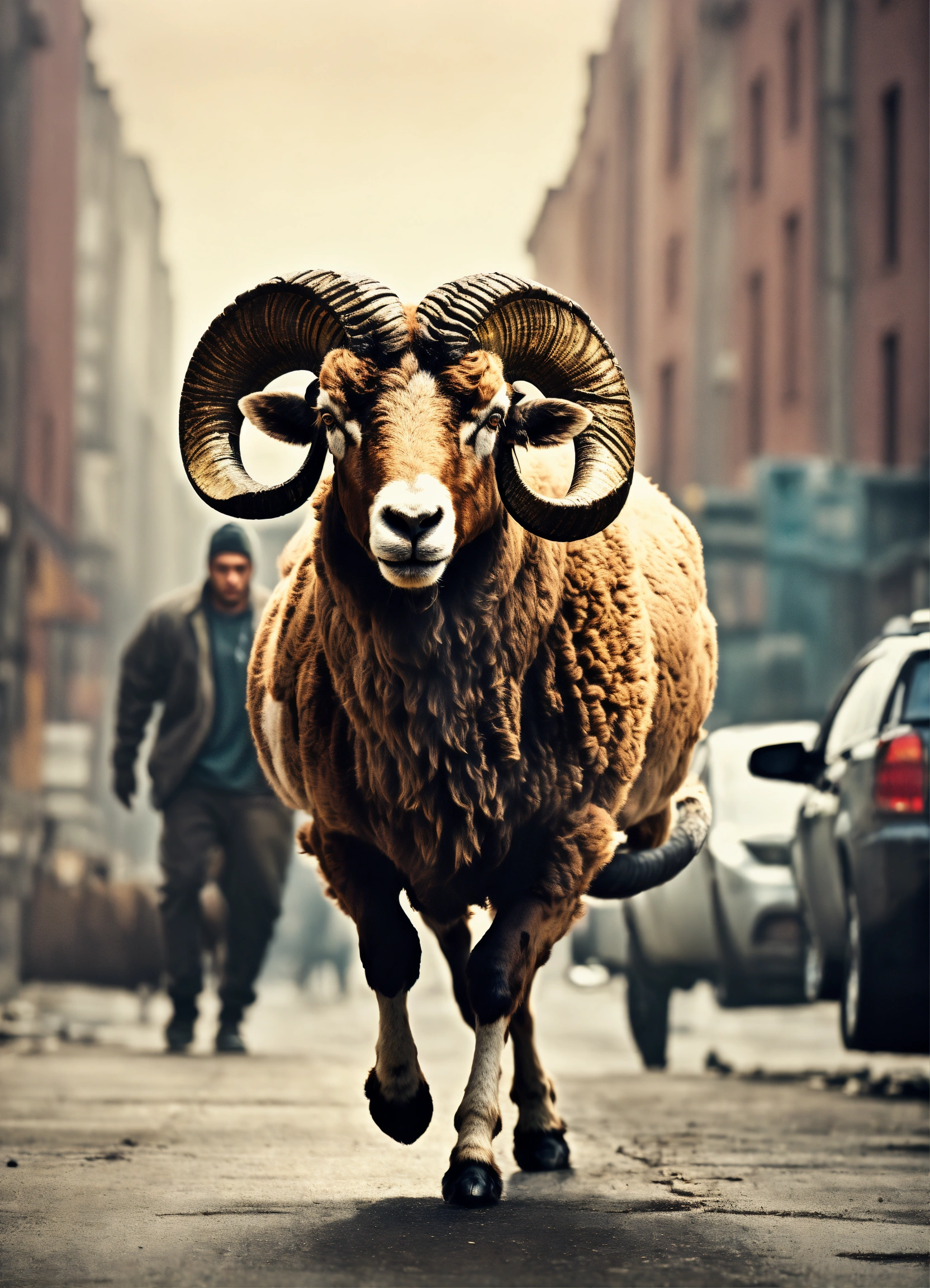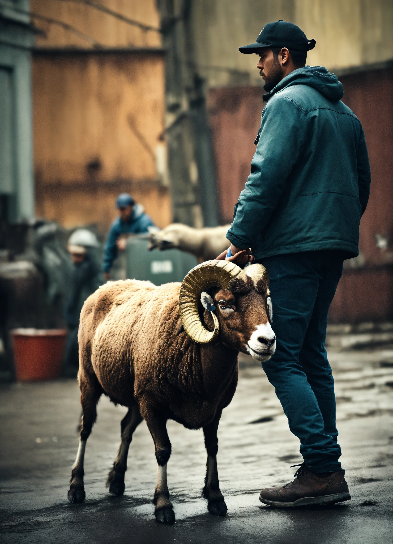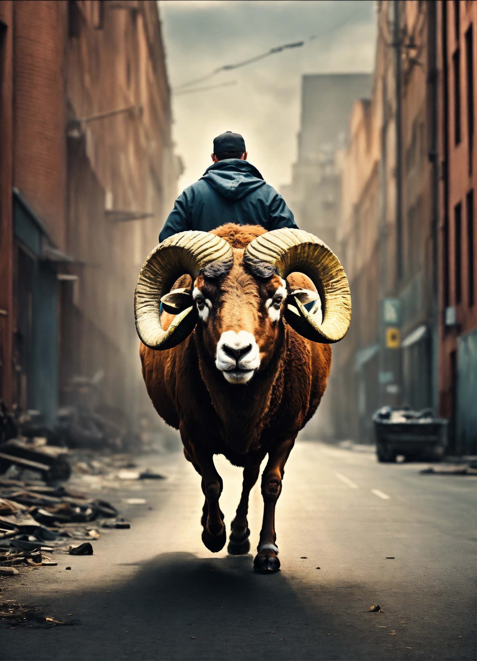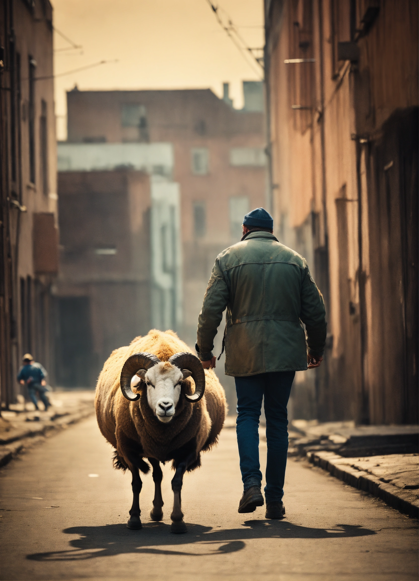 A man is pulling a ram behind him, a gritty and urban style, muted colors, factured, short focus, vanishing point, vignetting, light in contrast, highly detailed, hyper realistic, footage