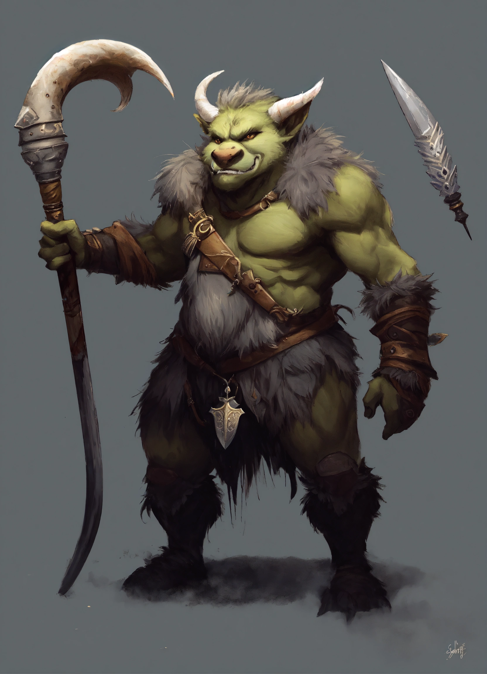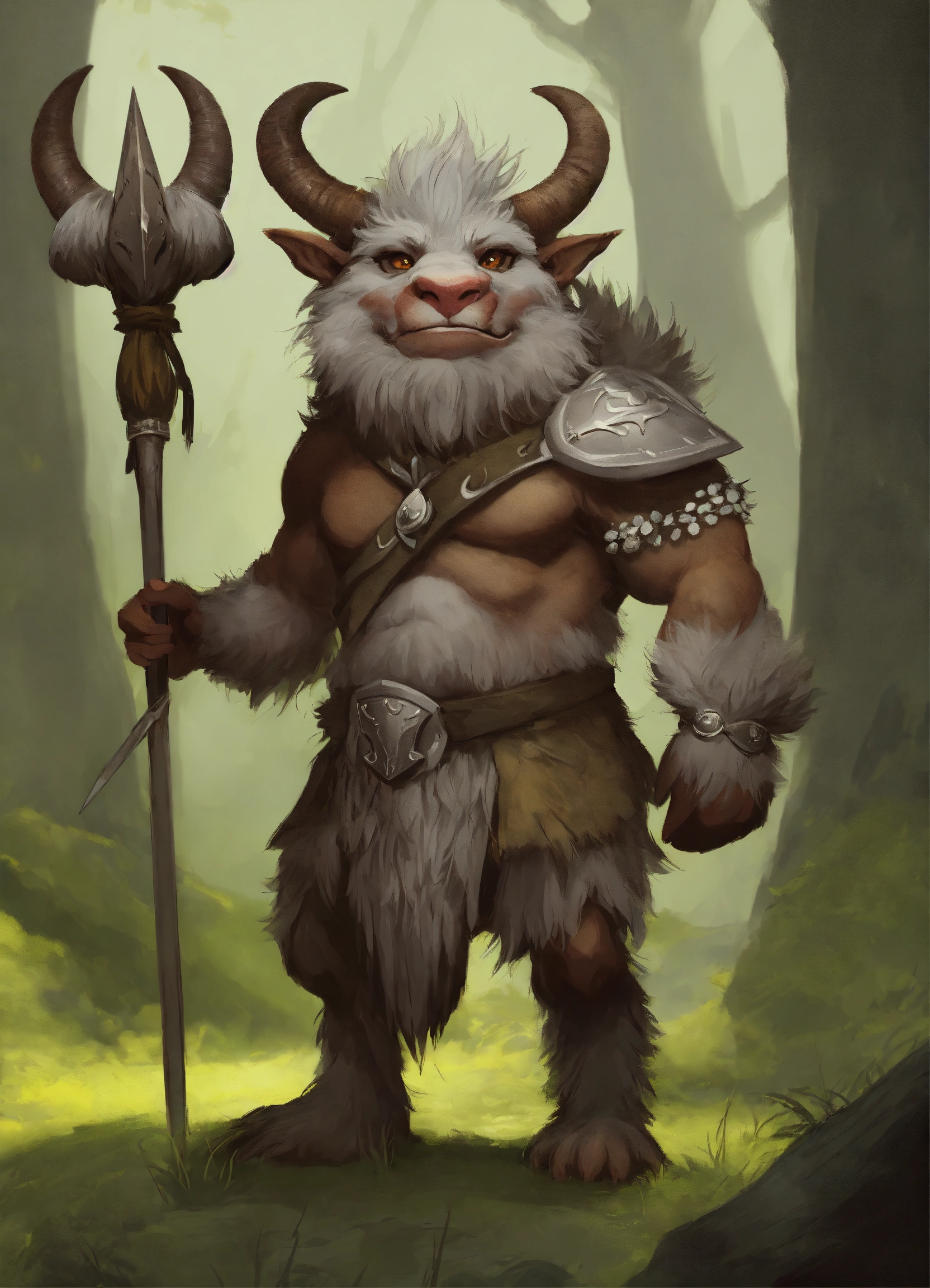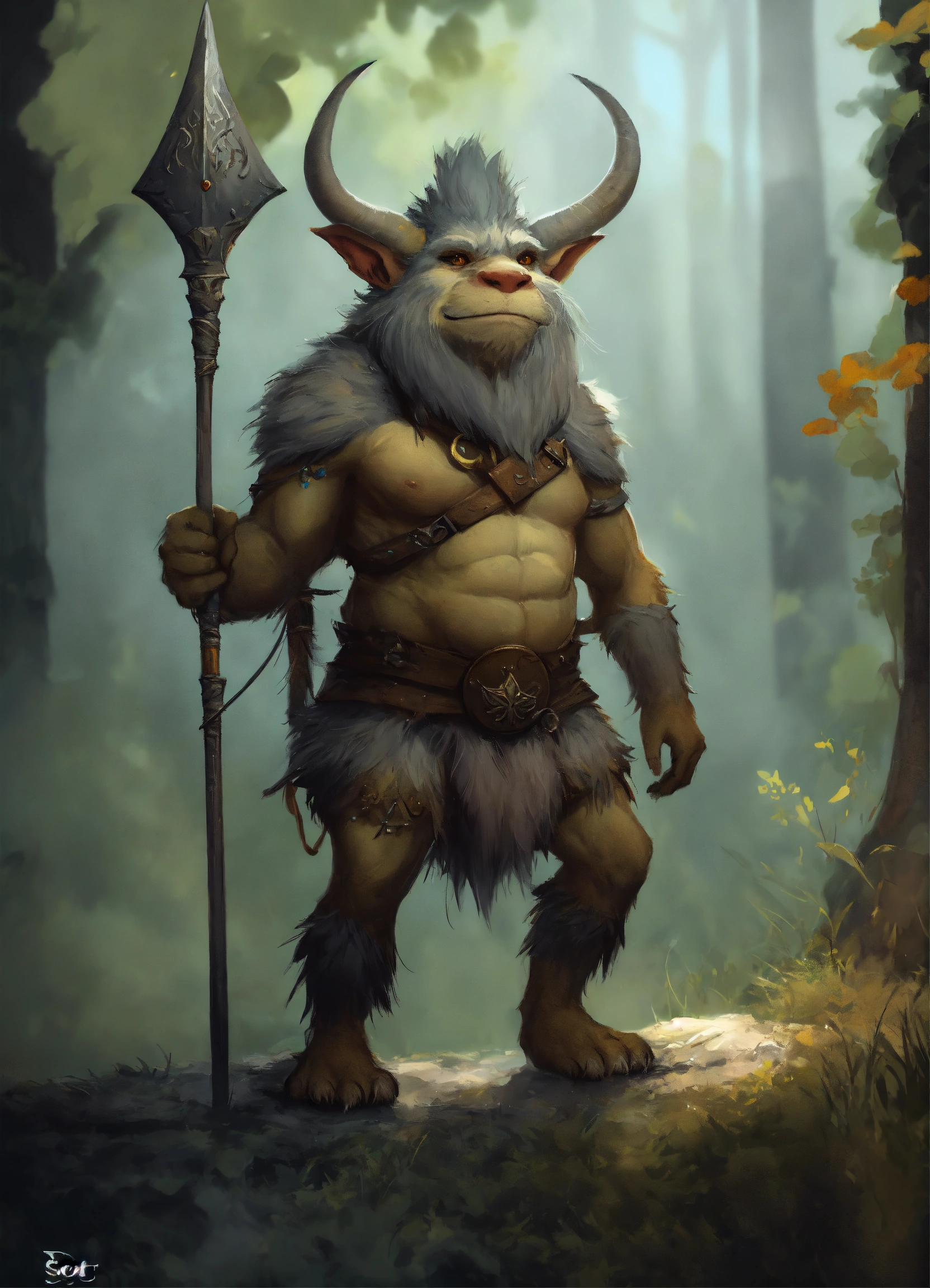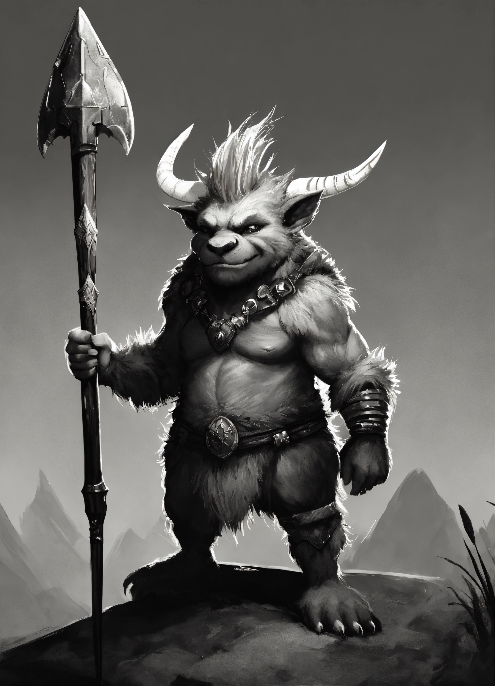 Digital painting, illustration, creature concept art, a kind troll, furry, small horns, graphic grey scale, whimsical, warrior, spear, style of scott flanders