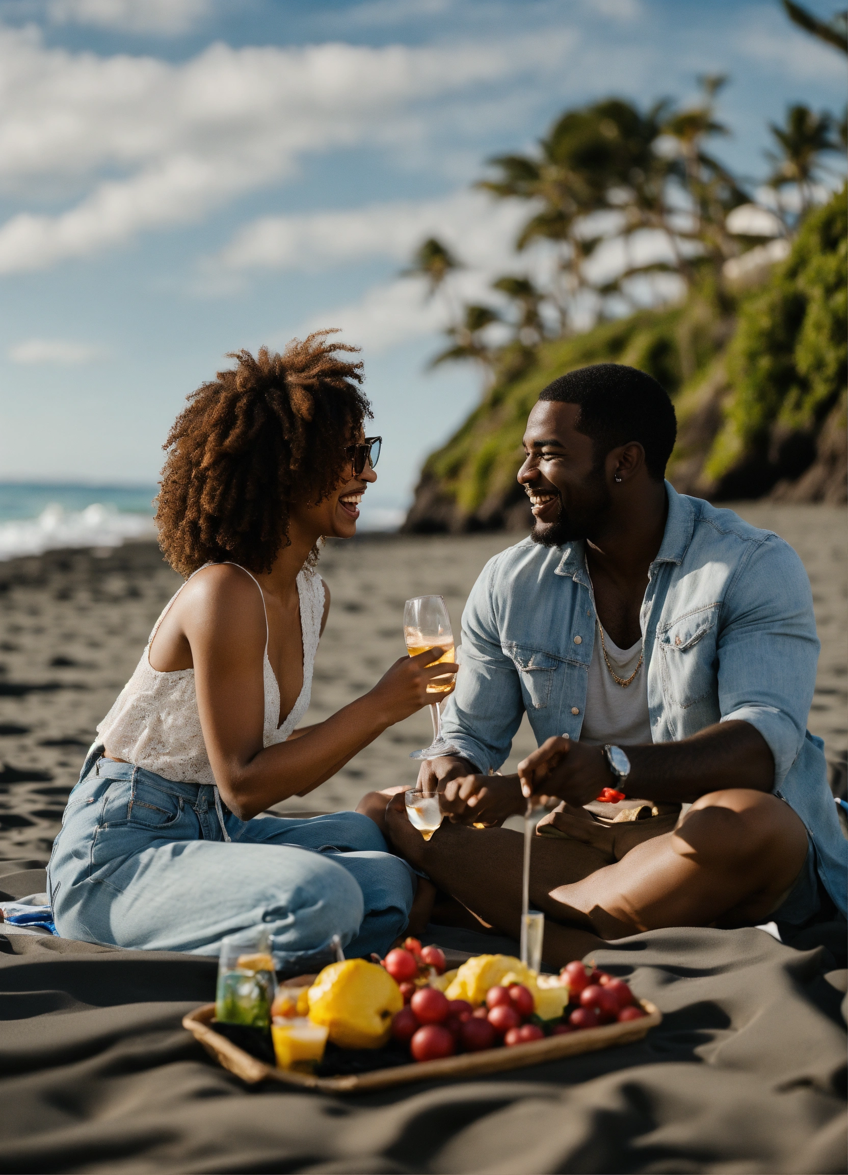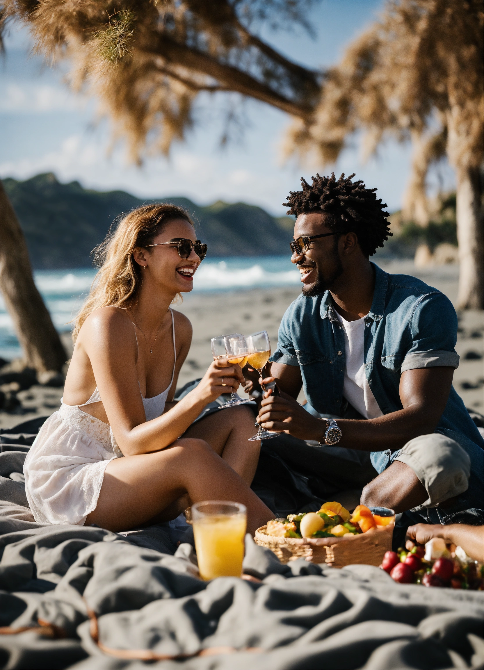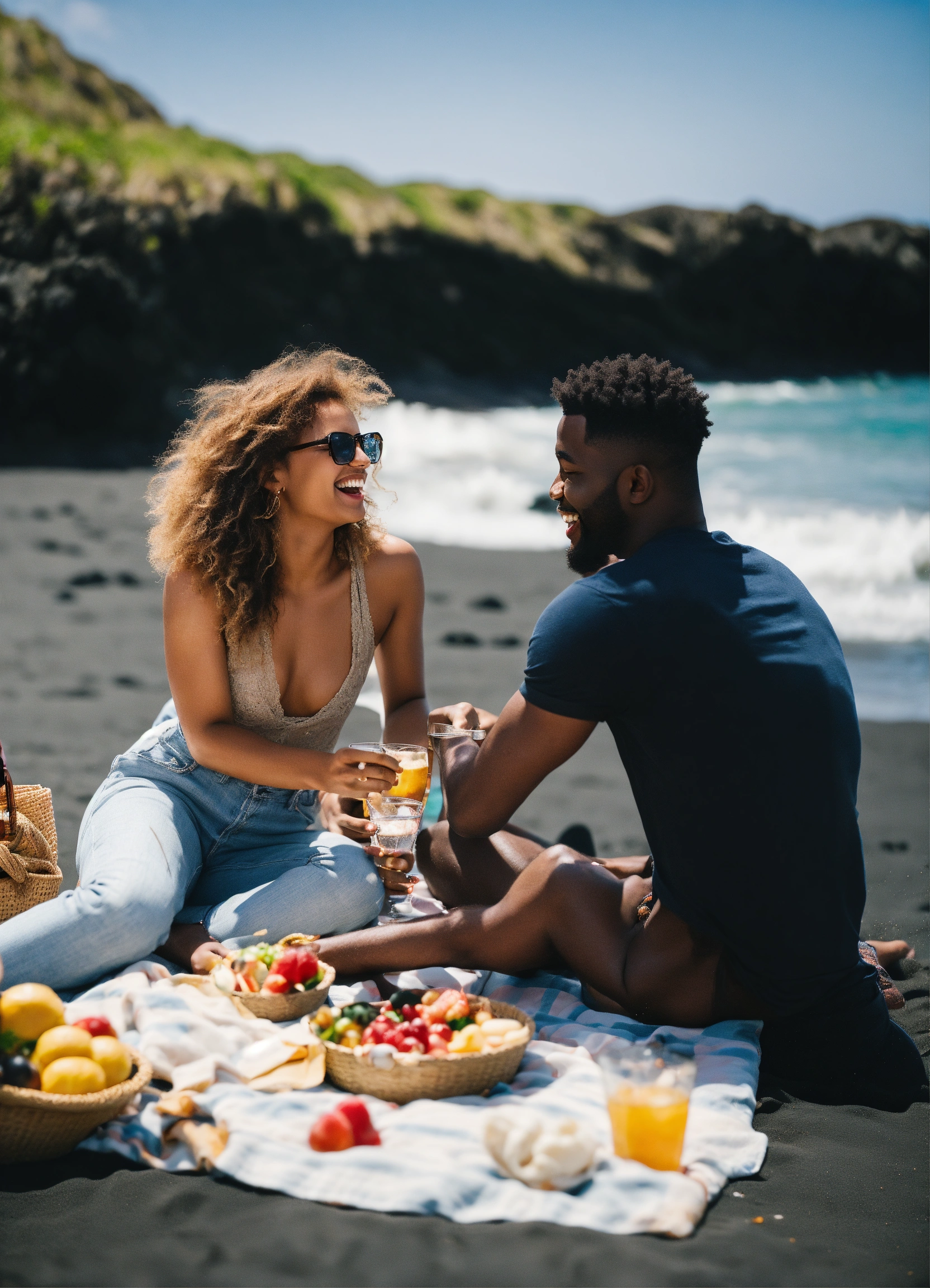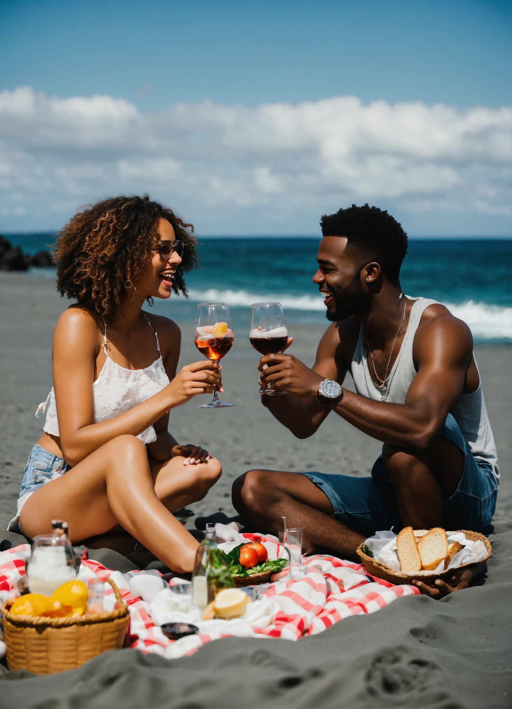 They are two people picnicking outside on a black sand beach, a white woman and a black man. both of them are twenty years old. they are lauging and looking at each other, raising they glasses in a toast.