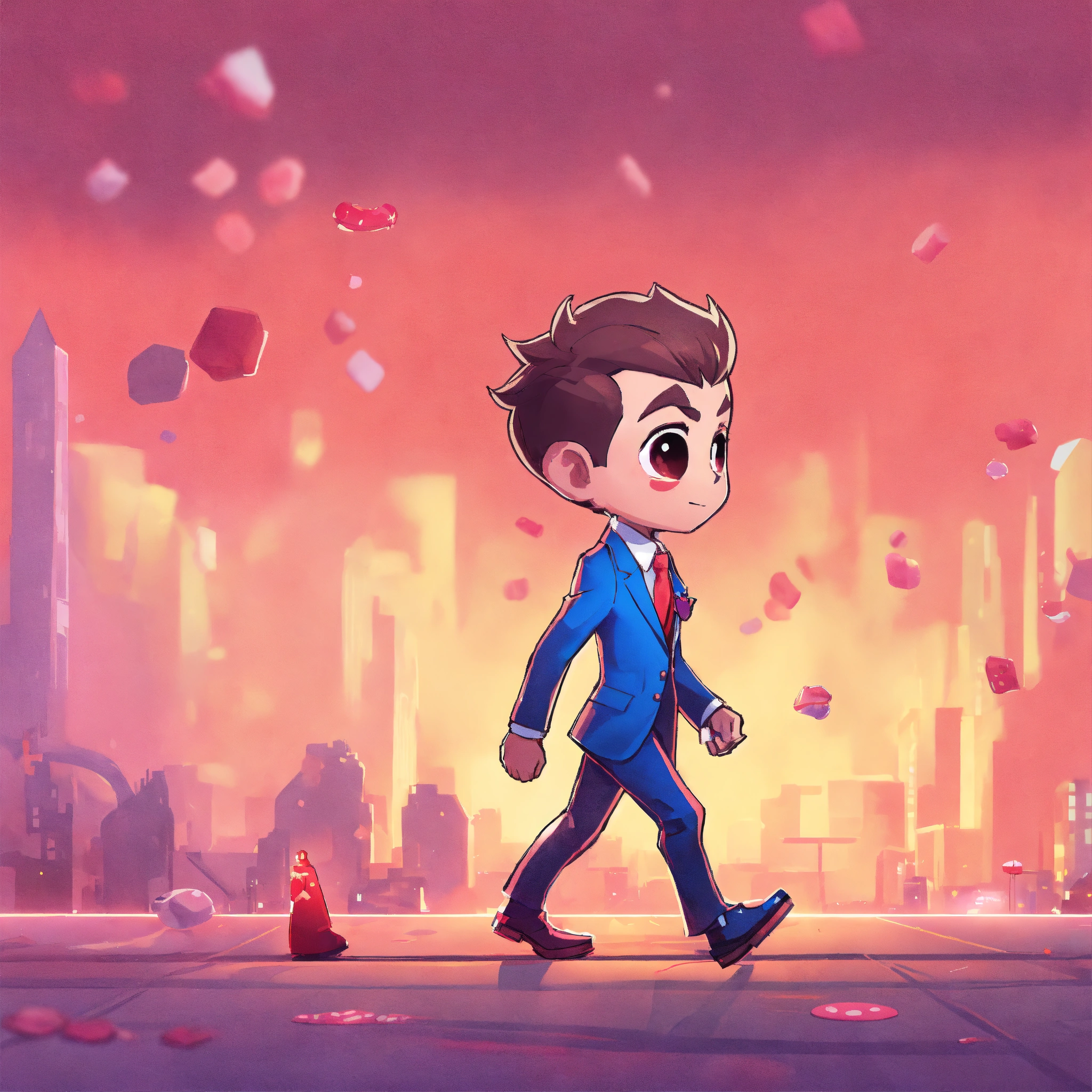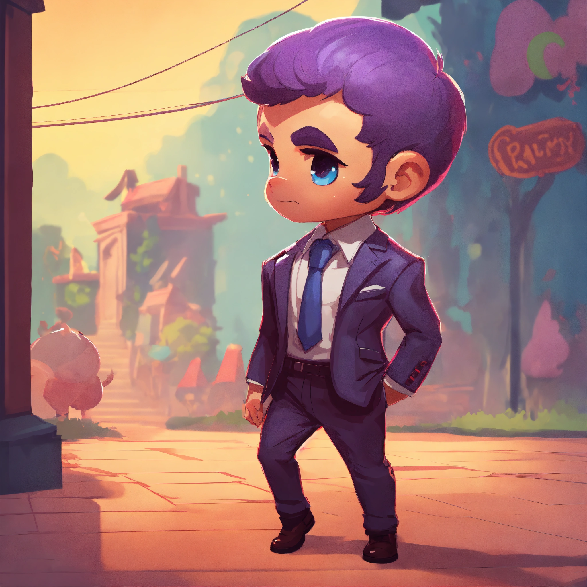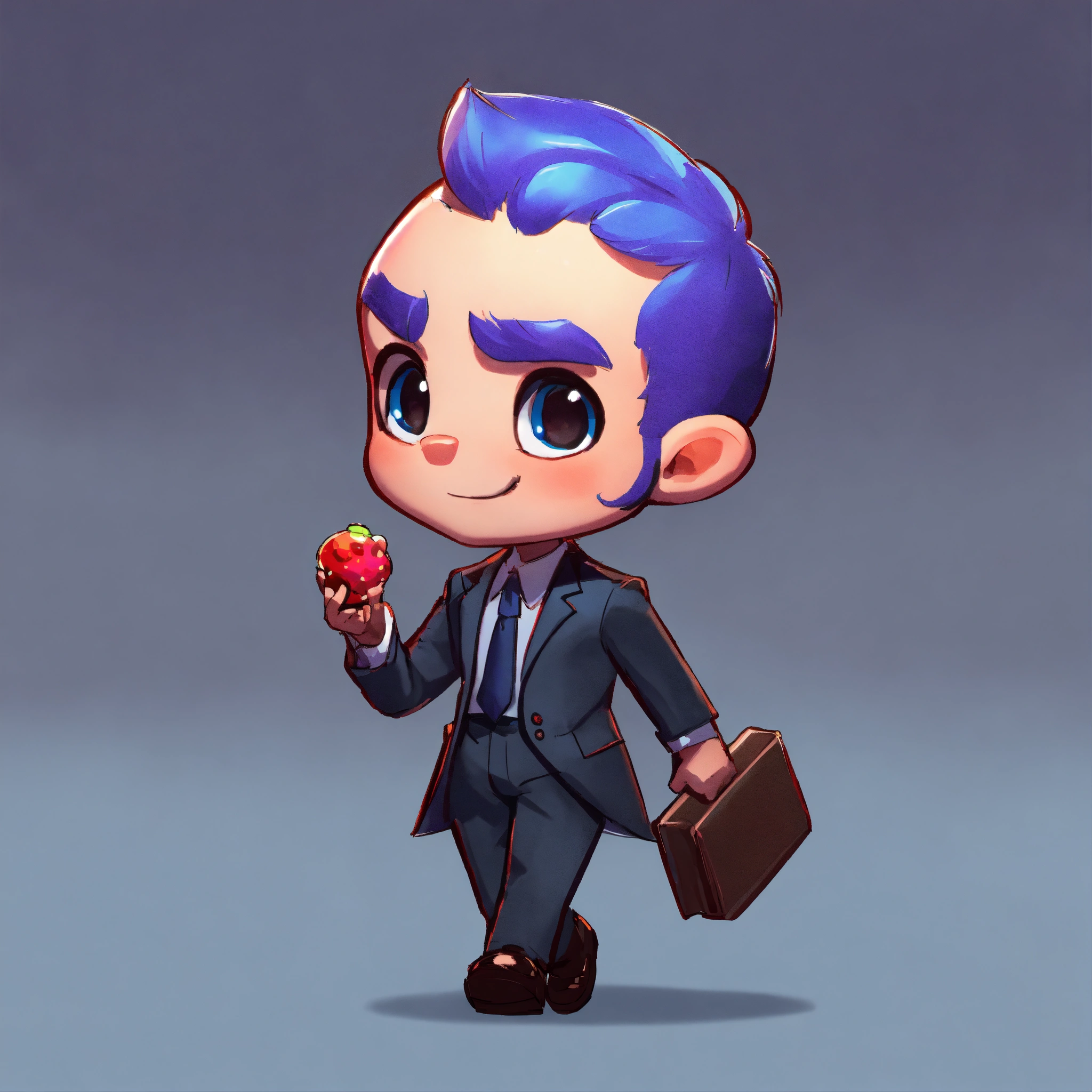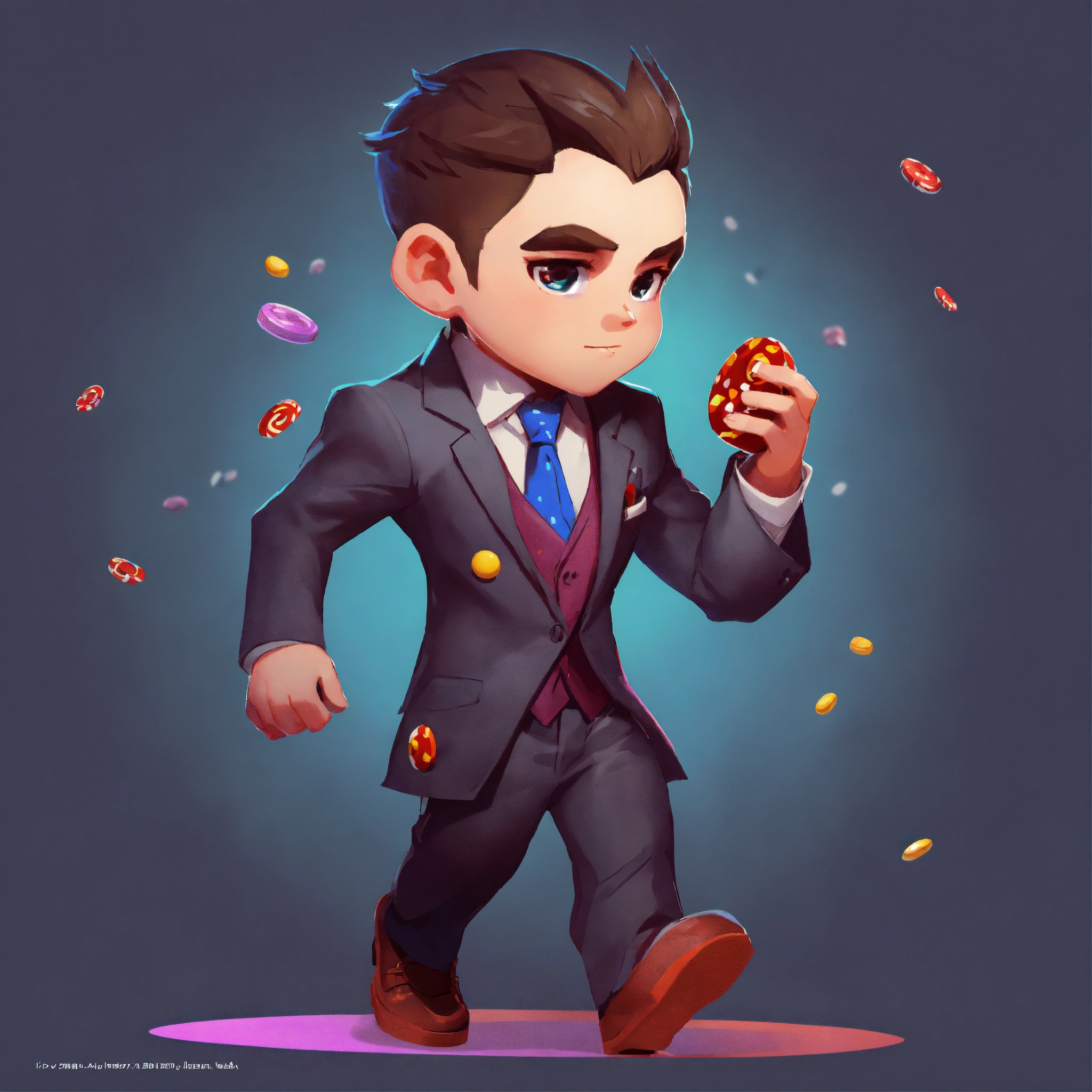 Game art, concept art, boy, suit, evil, walking, sideview, full body view, blank background, chibi proportions, artstyle from candy crush