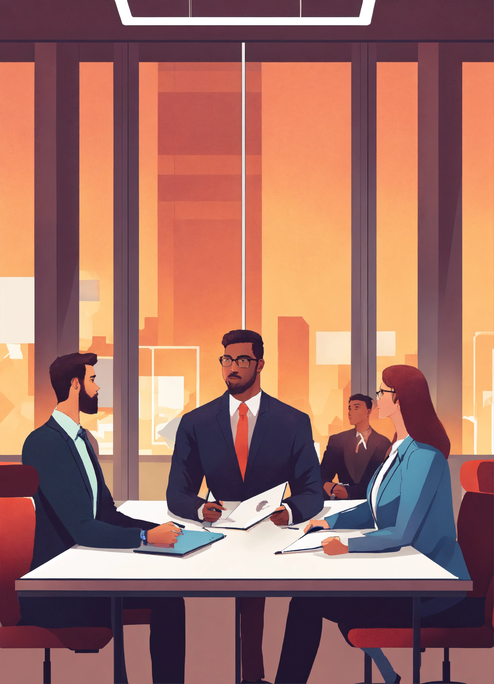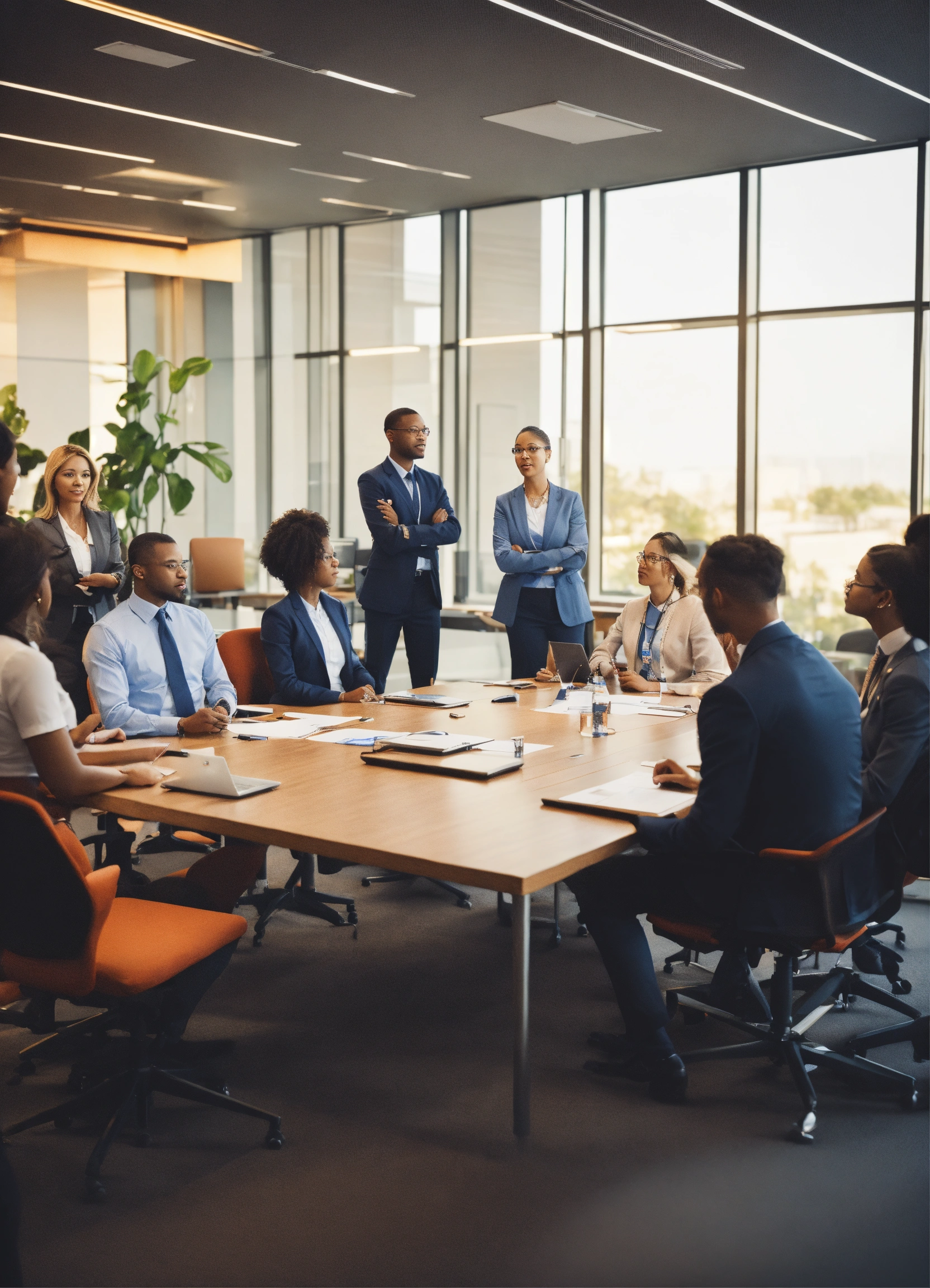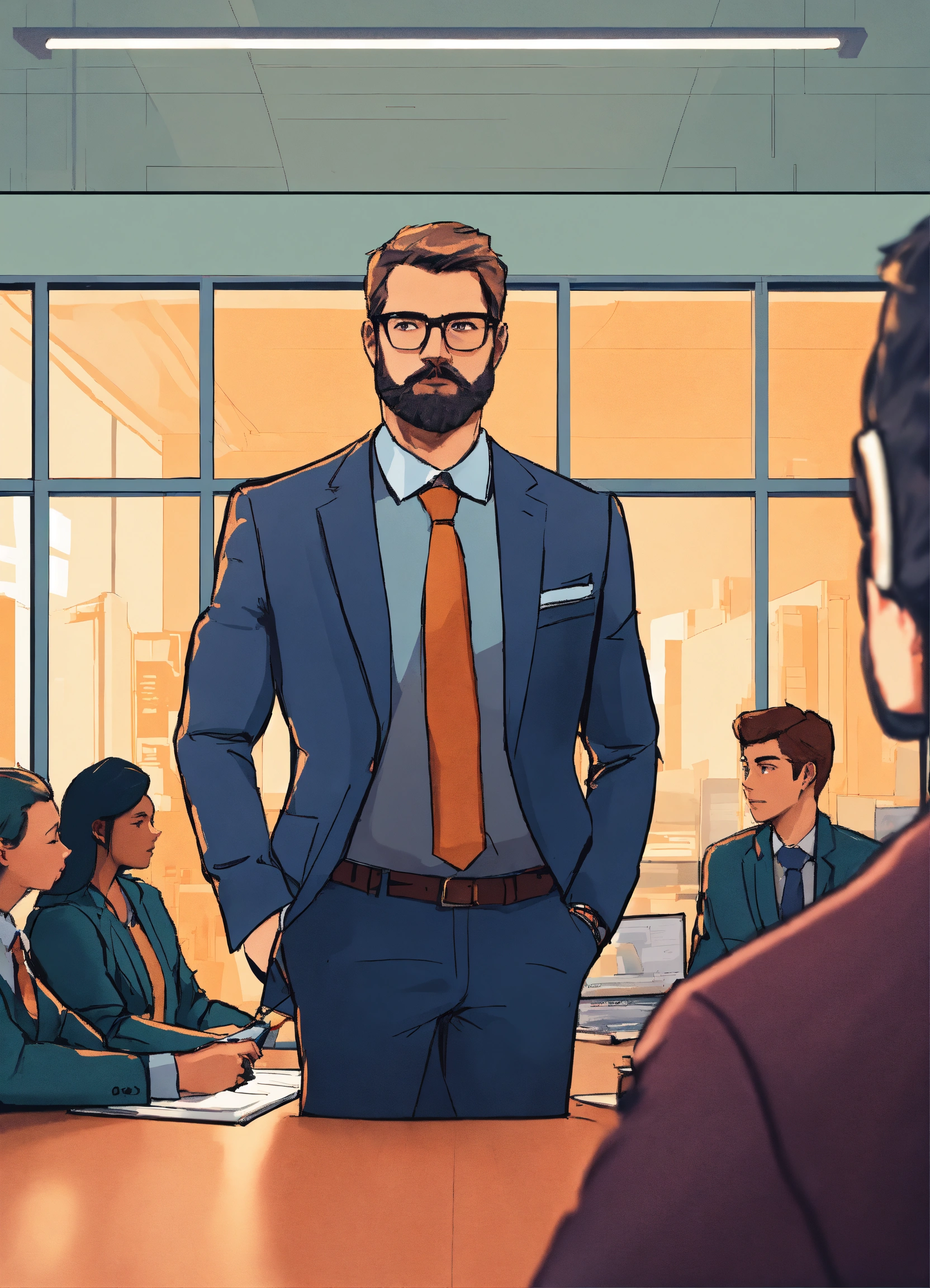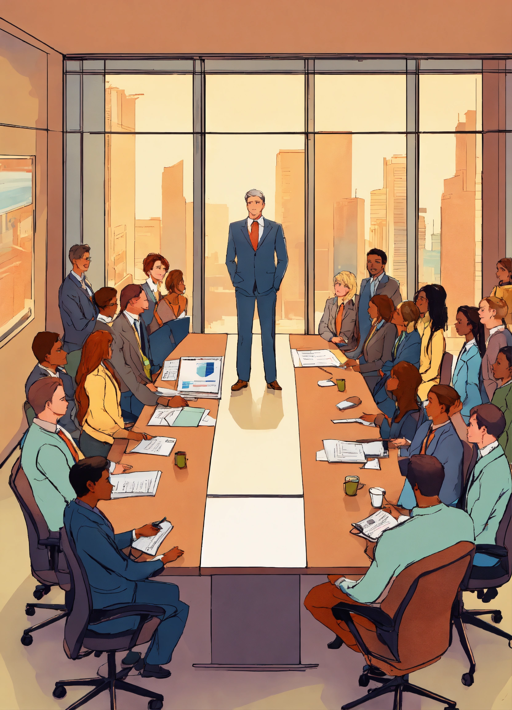 “generate an image of a wise and composed leader standing in a modern office setting, addressing a diverse team of professionals seated around a conference table. the leader should exude confidence and wisdom, perhaps holding notes or pointing towards a presentation. the team members should be engaged, leaning forward attentively, reflecting trust and respect. the overall environment should evoke a sense of mentorship, knowledge sharing, and collaboration.”