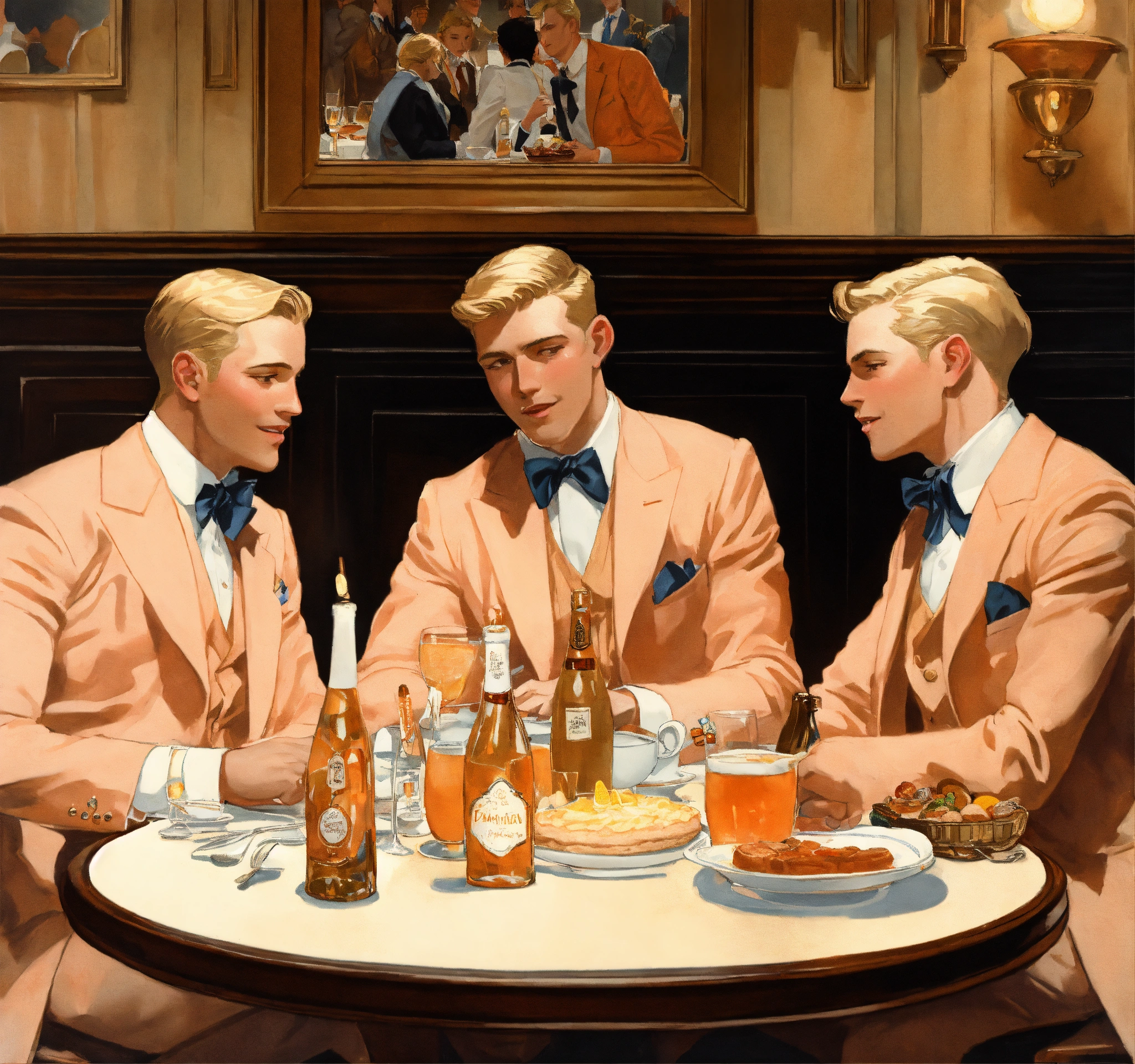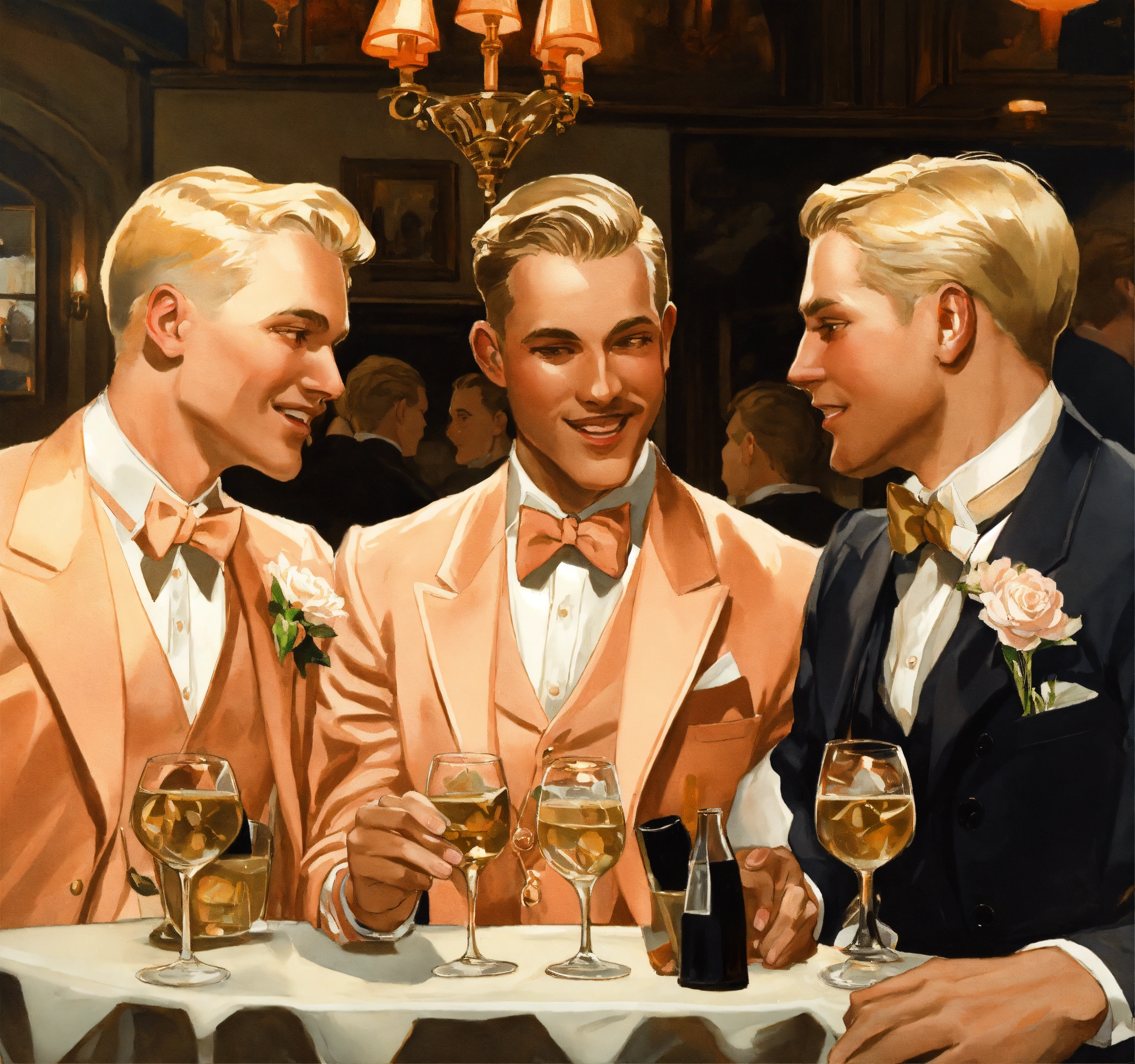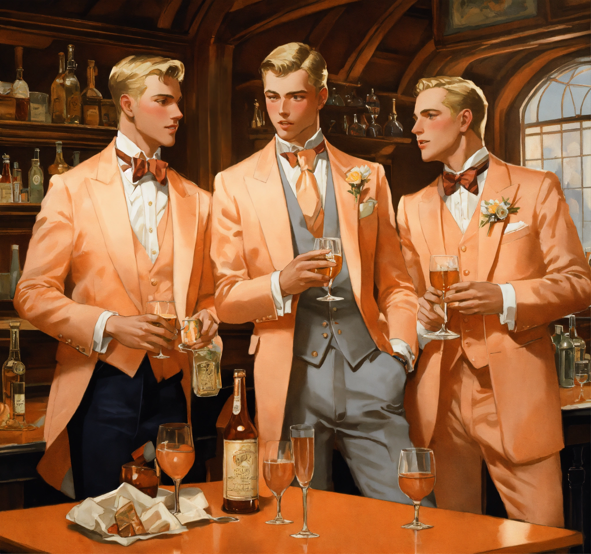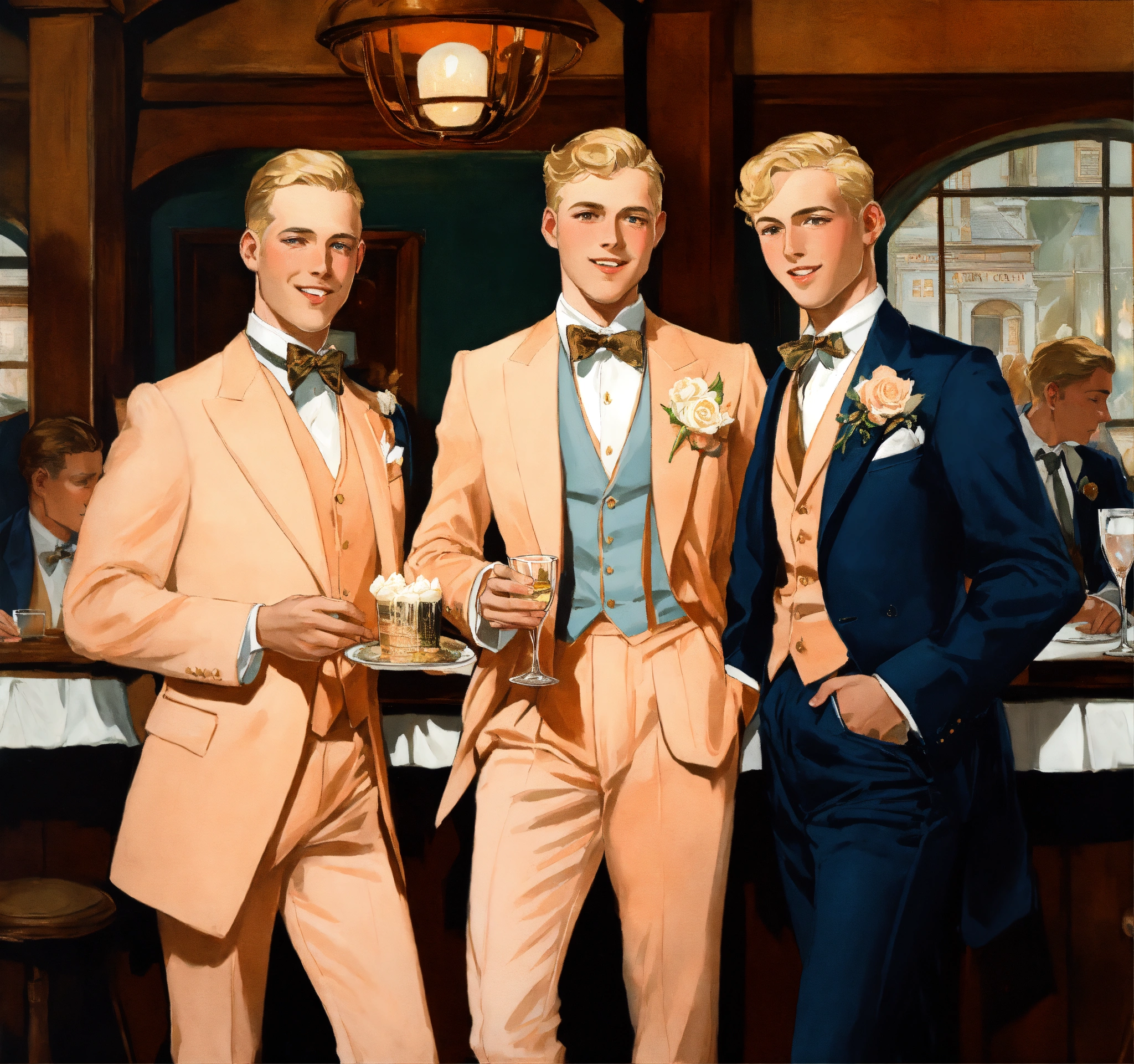 Three blonde gentlemen in peach vested suit and club tie, celebrating a birthday in a tavern hall, leyendecker style