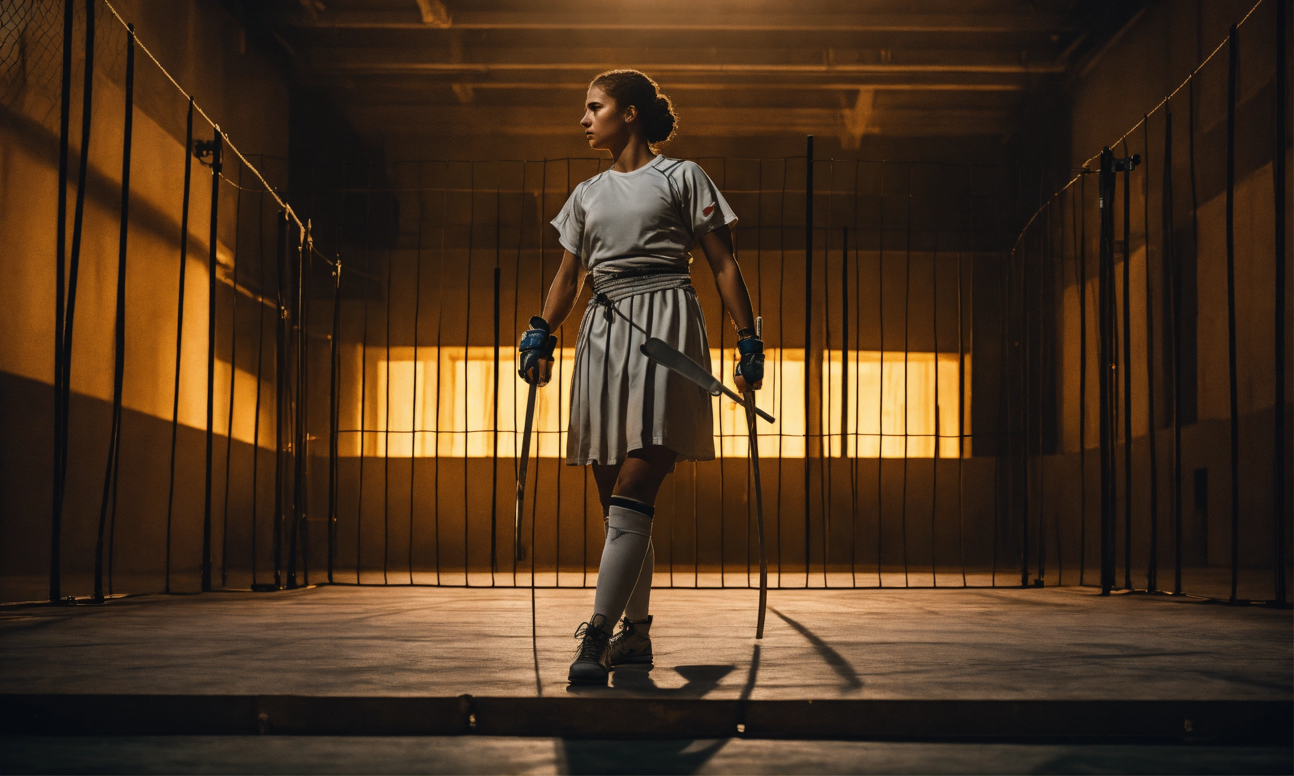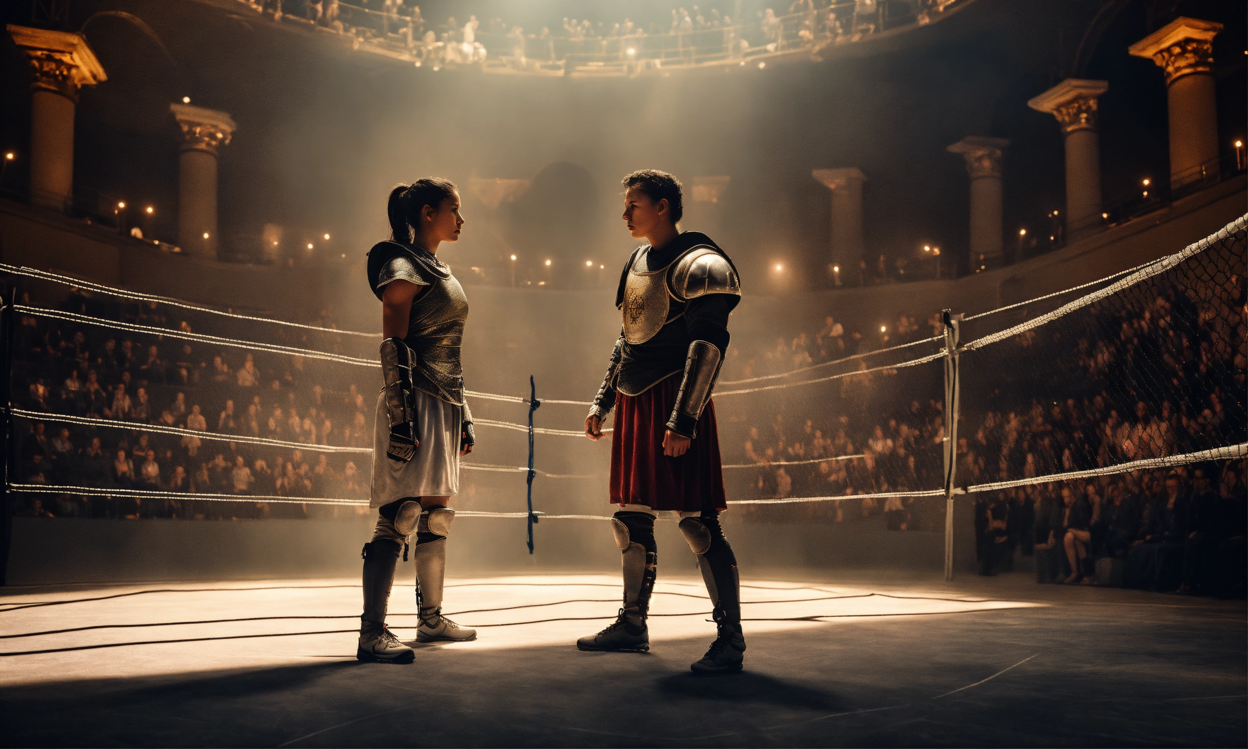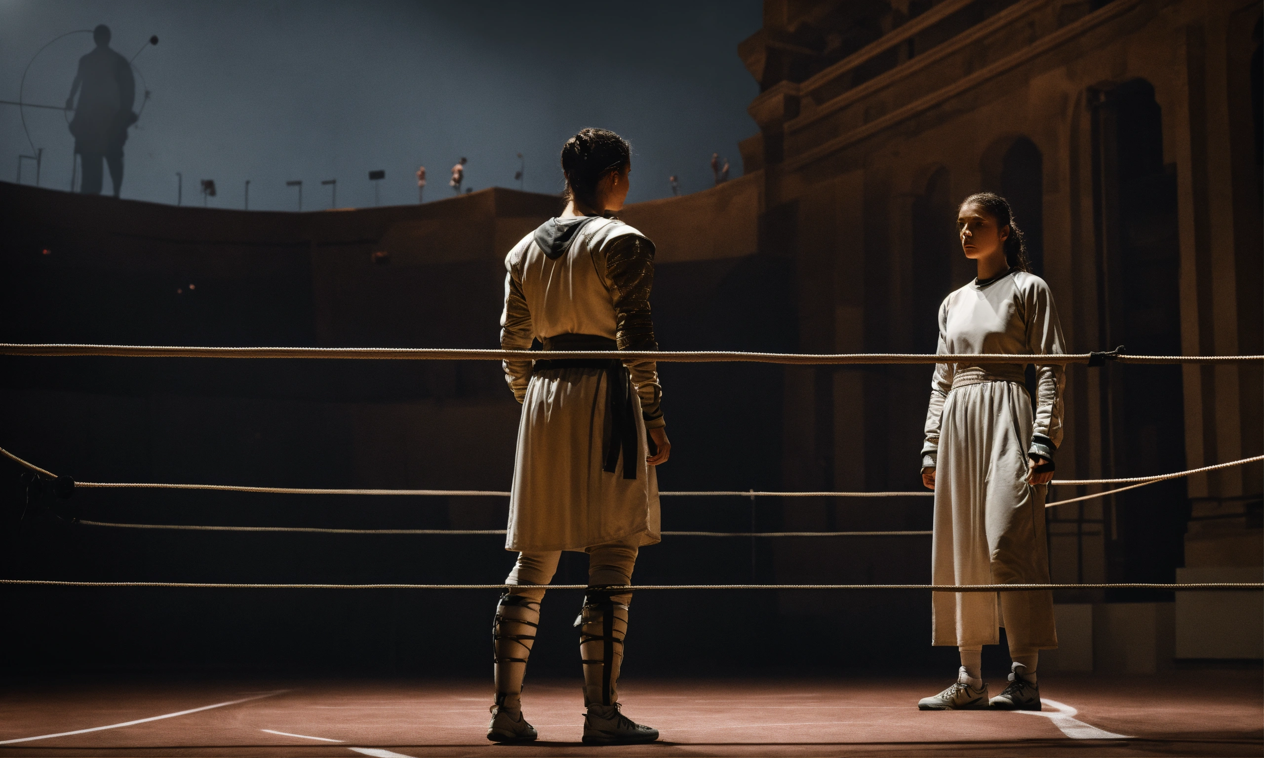 Create an image of a female athlete and julius caesar standing face to face in a fencing arena, darken the surroundings to emphasize the sense of existential exhaustion, the composition should convey the image of a person struggling under the weight of the monotony of life