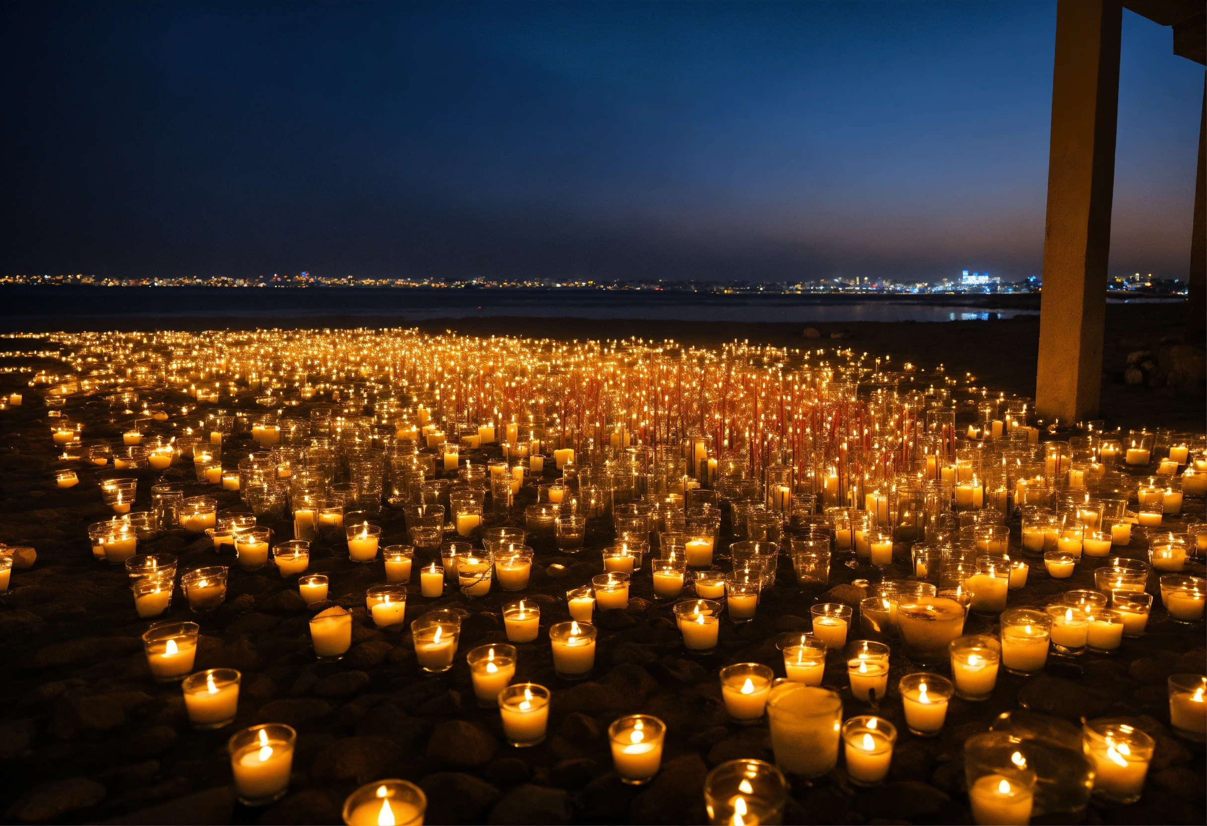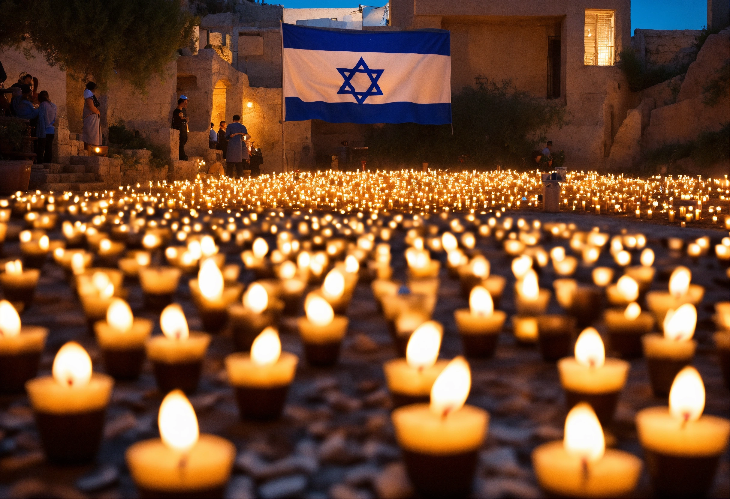 A photorealistic image of a night lit with hundreds candles in glass cups and the israeli flag resting on the ground
