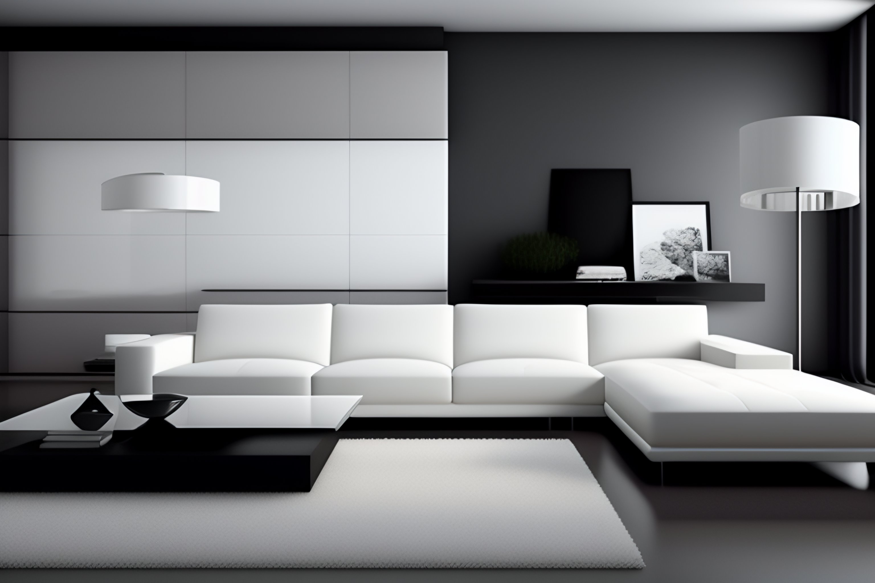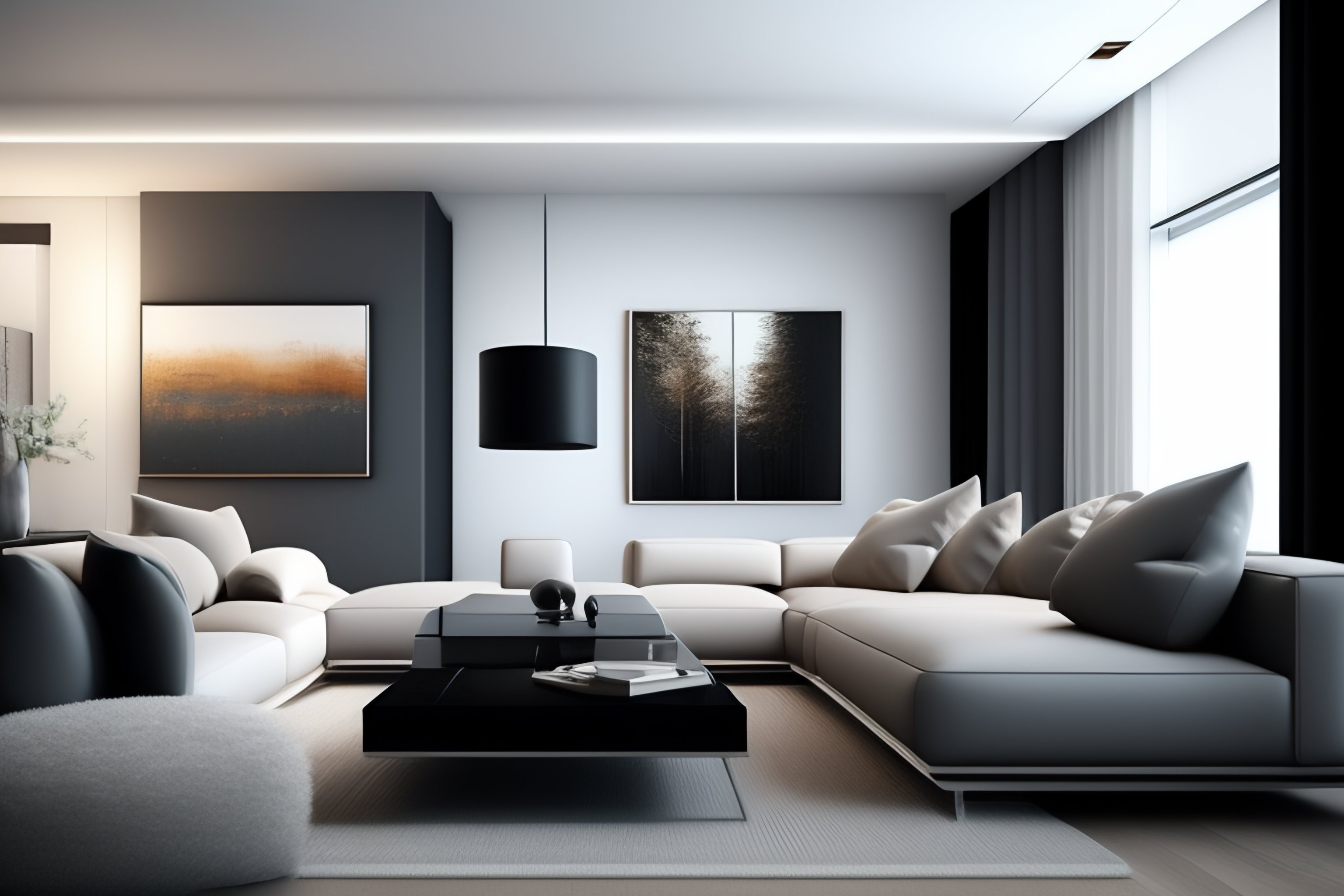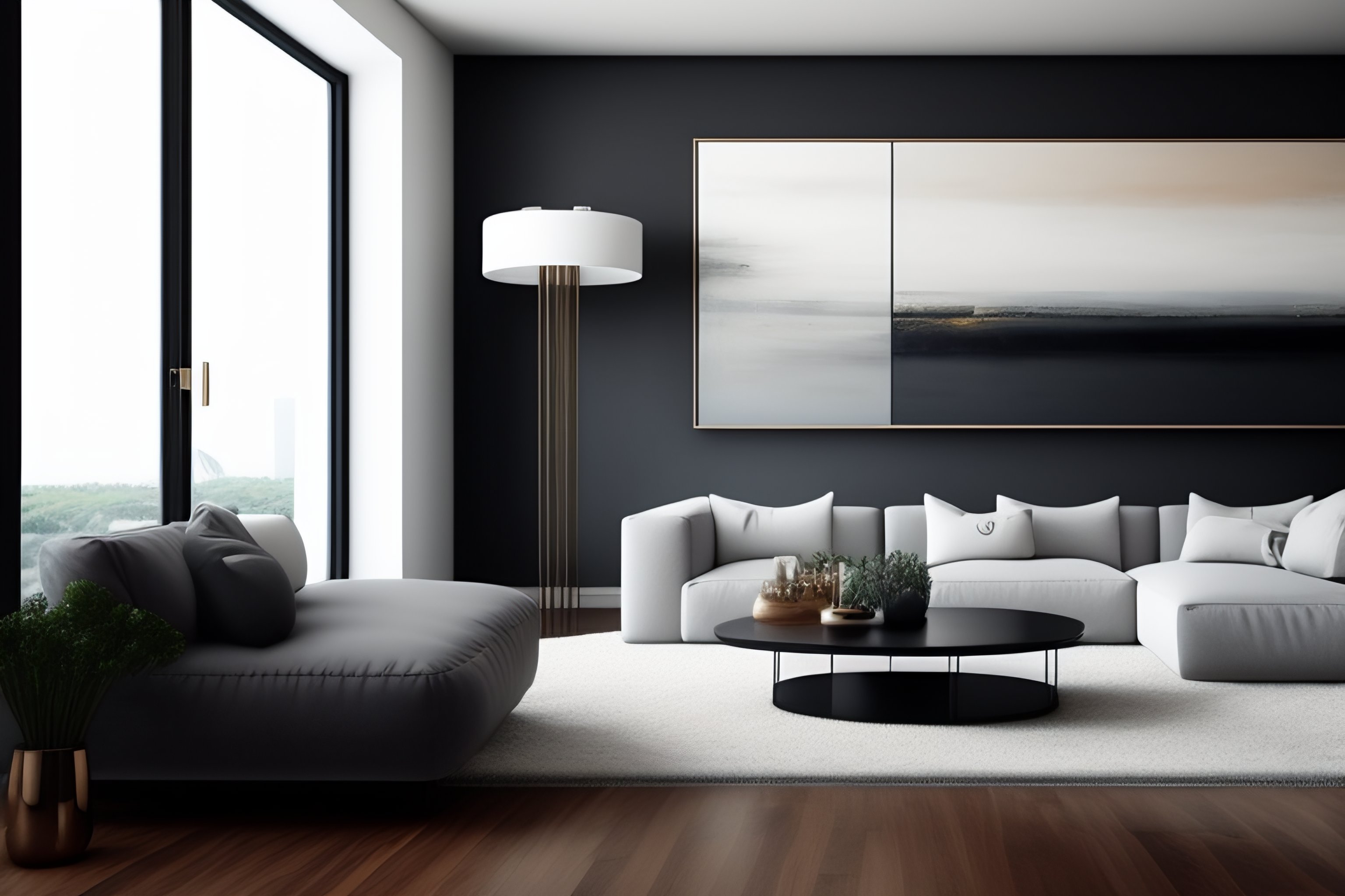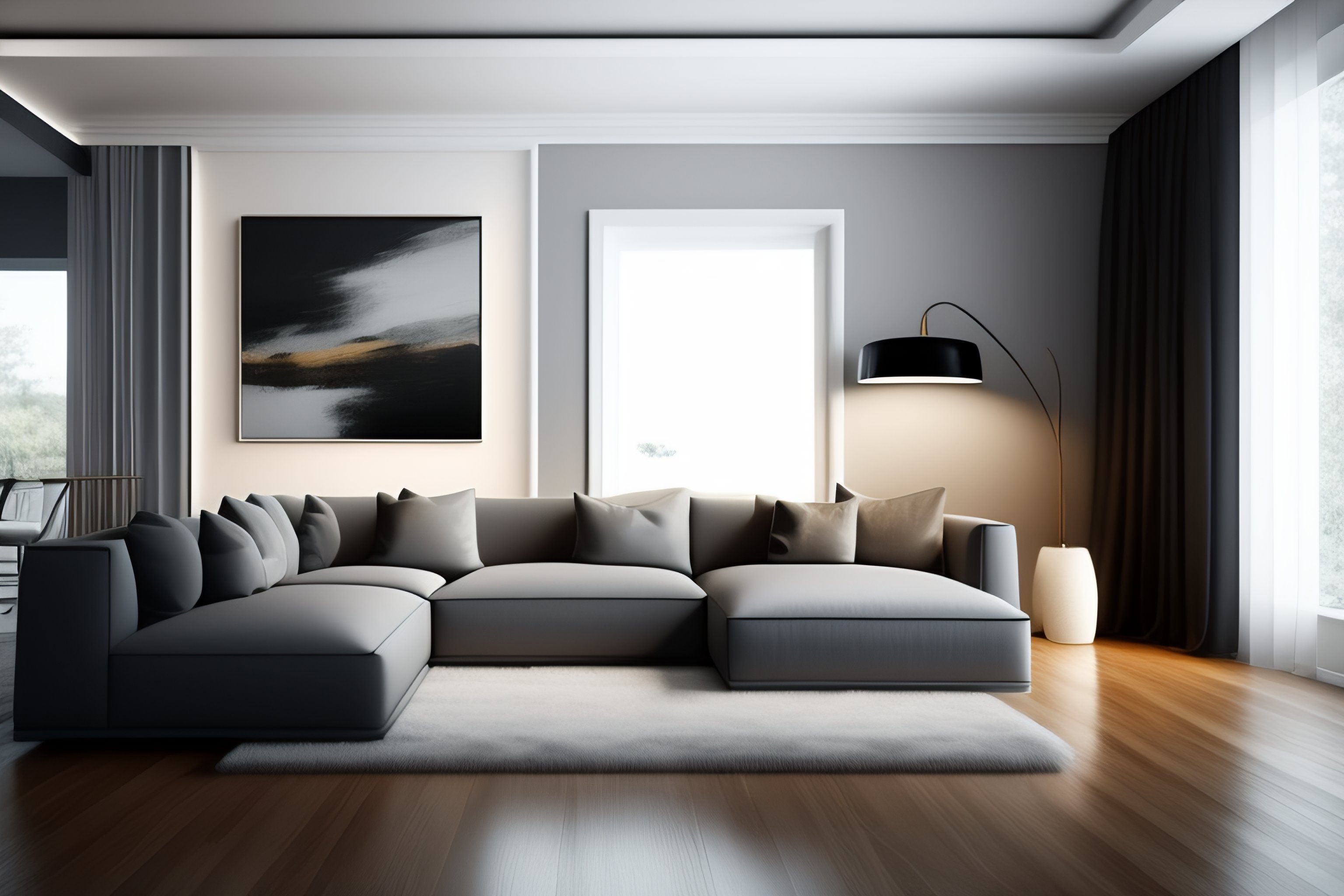 A contemporary living room with a sleek, minimalist design, featuring light gray walls and flooring, a white and gray sectional sofa, and a modern, low-profile coffee table. a large abstract painting hangs on the wall, adding a touch of rustic charm. a floor lamp with a metal base and a sleek design stands in the corner, completing the look.