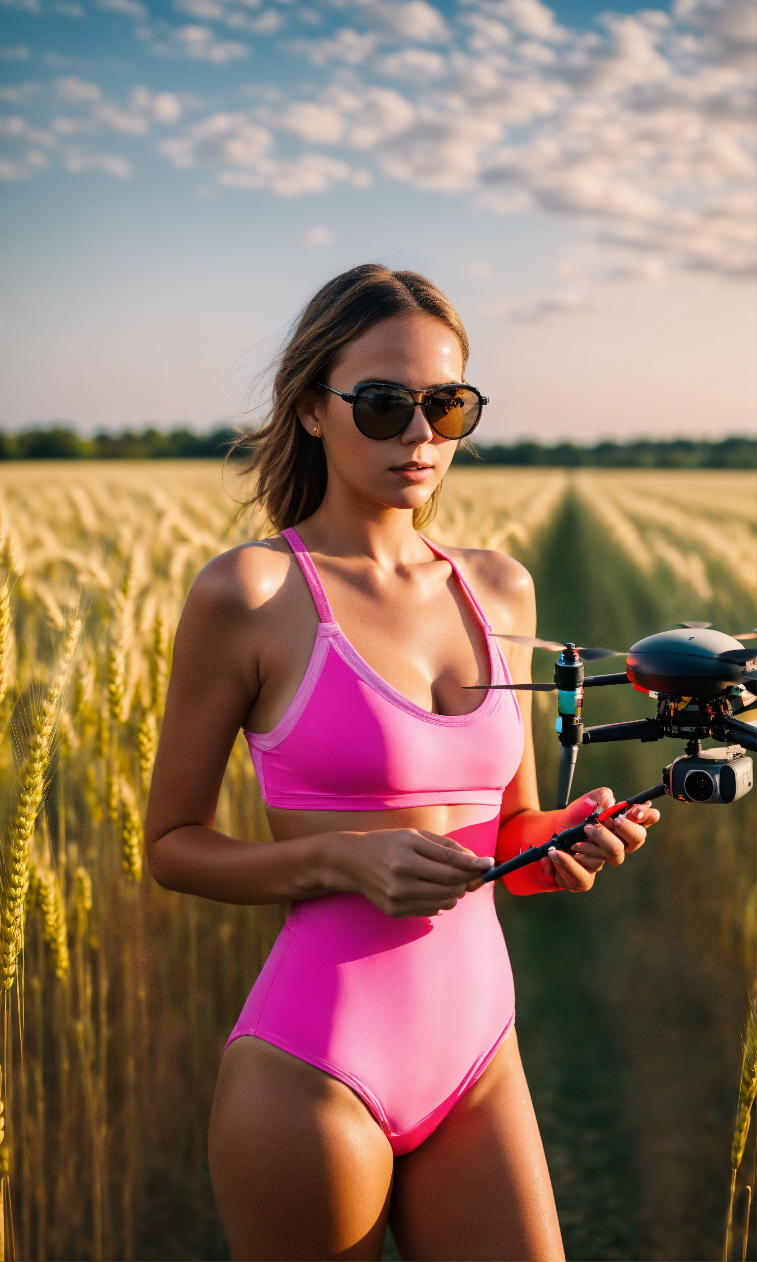 25 years old lady in a pink swimming suit and rounded sunglasses controlling a drone that is spraying a field of wheat