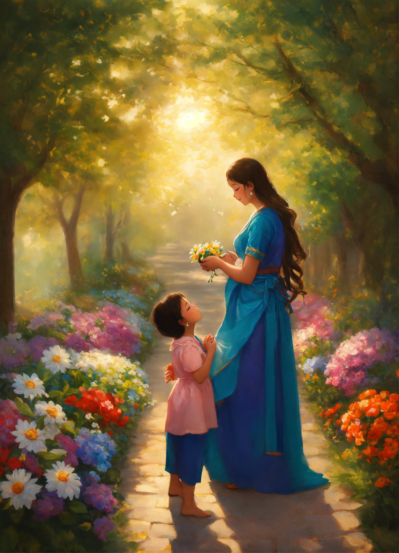 Surrounding the hands and heart, include elements that represent health, joy, and love, such as vibrant flowers and a path illuminated by gentle lights. the scene should convey a sense of hope and faith, emphasizing the power of prayer and the deep love of a parent for their children. overall, the image should evoke feelings of serenity, faith, and the boundless love of a parent.