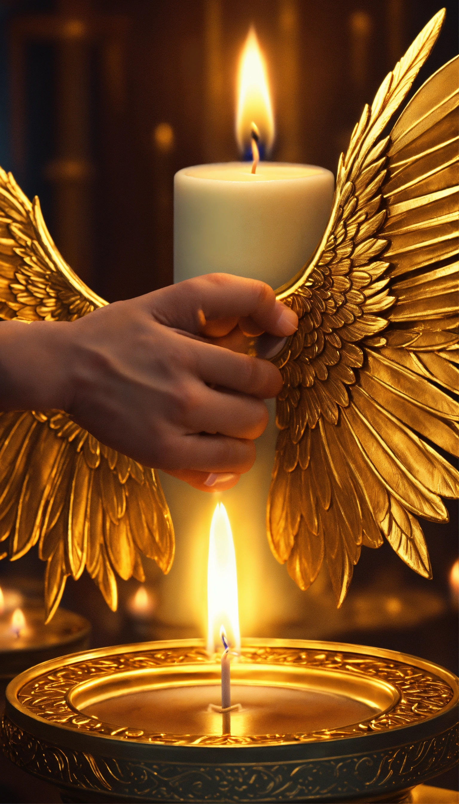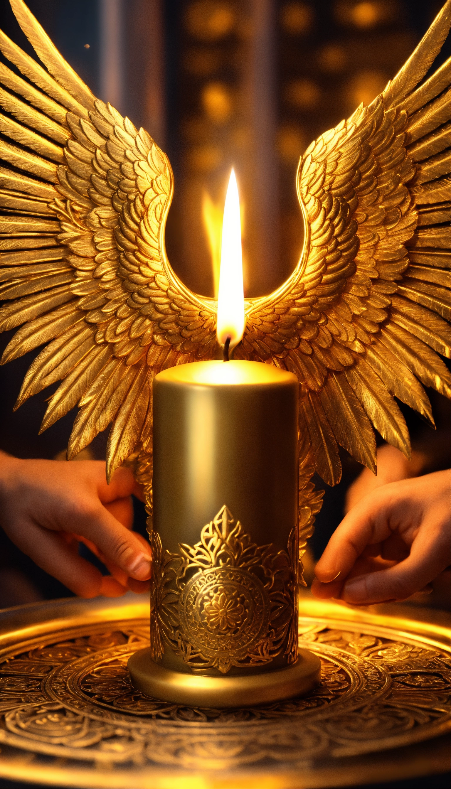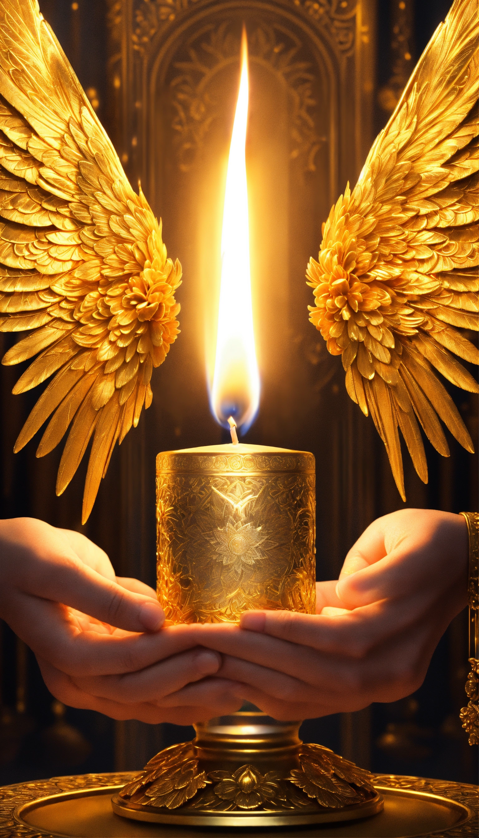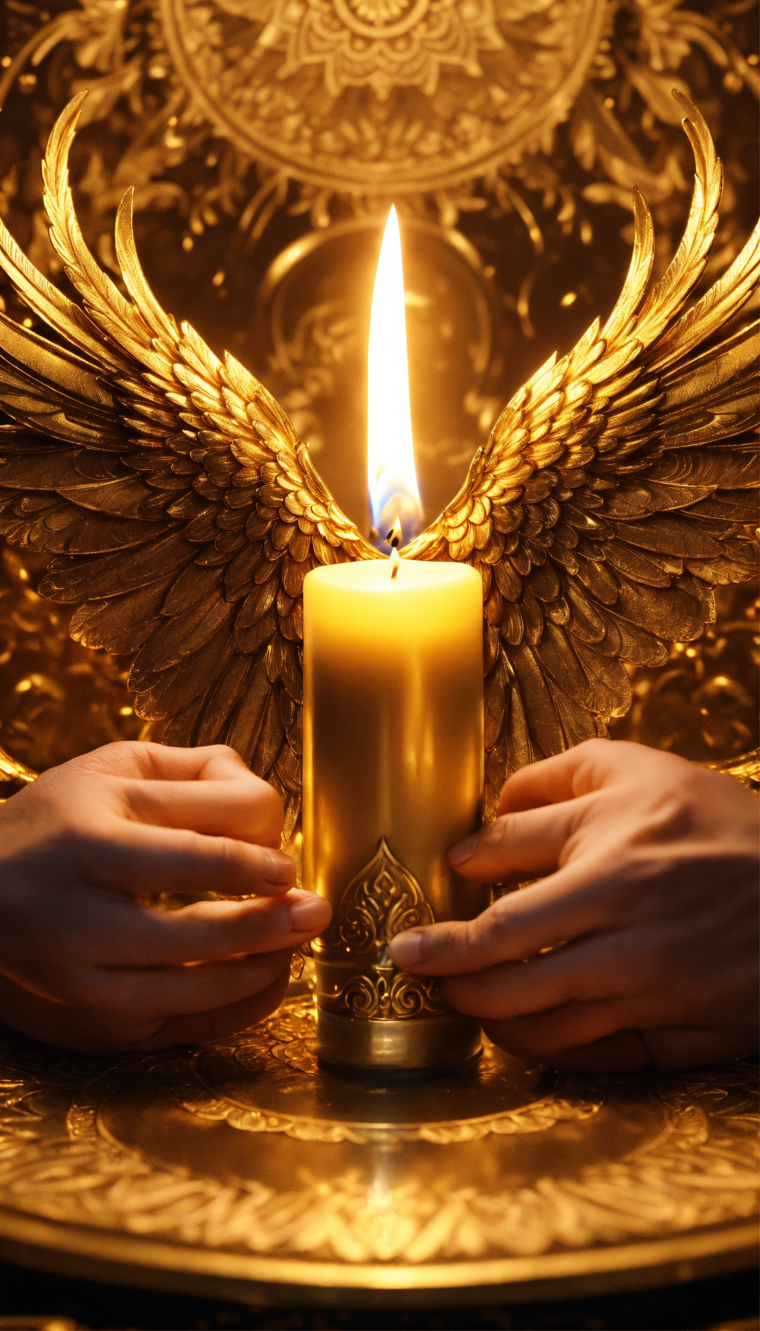 Hands. beautiful and detailed men taking a powerful candle, detailed, digital illustration, real, 3d, golden colored candle with a yellow flame with white and golden details, on each side of the candle there are golden and detailed wings, luminous mandala shape background golden, sharp focus, cinematic illustration, 8k, hyperrealistic digital painting, hd, high quality and resolution.