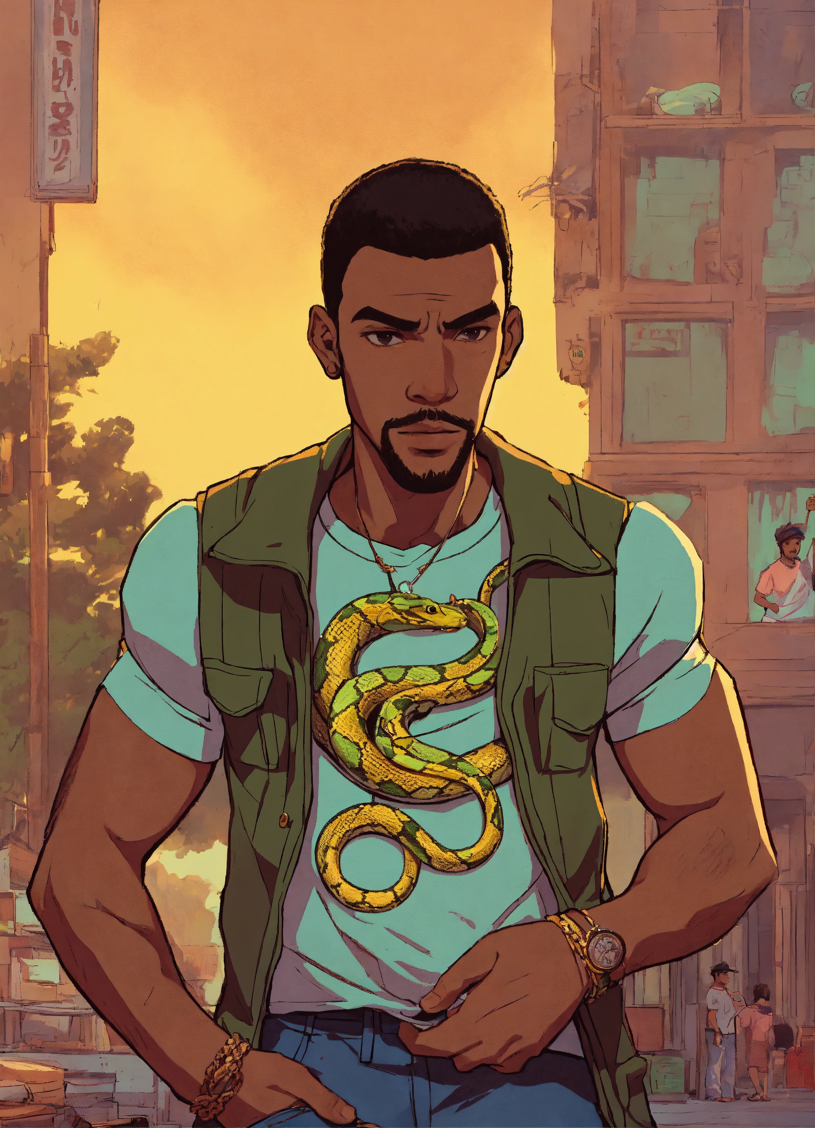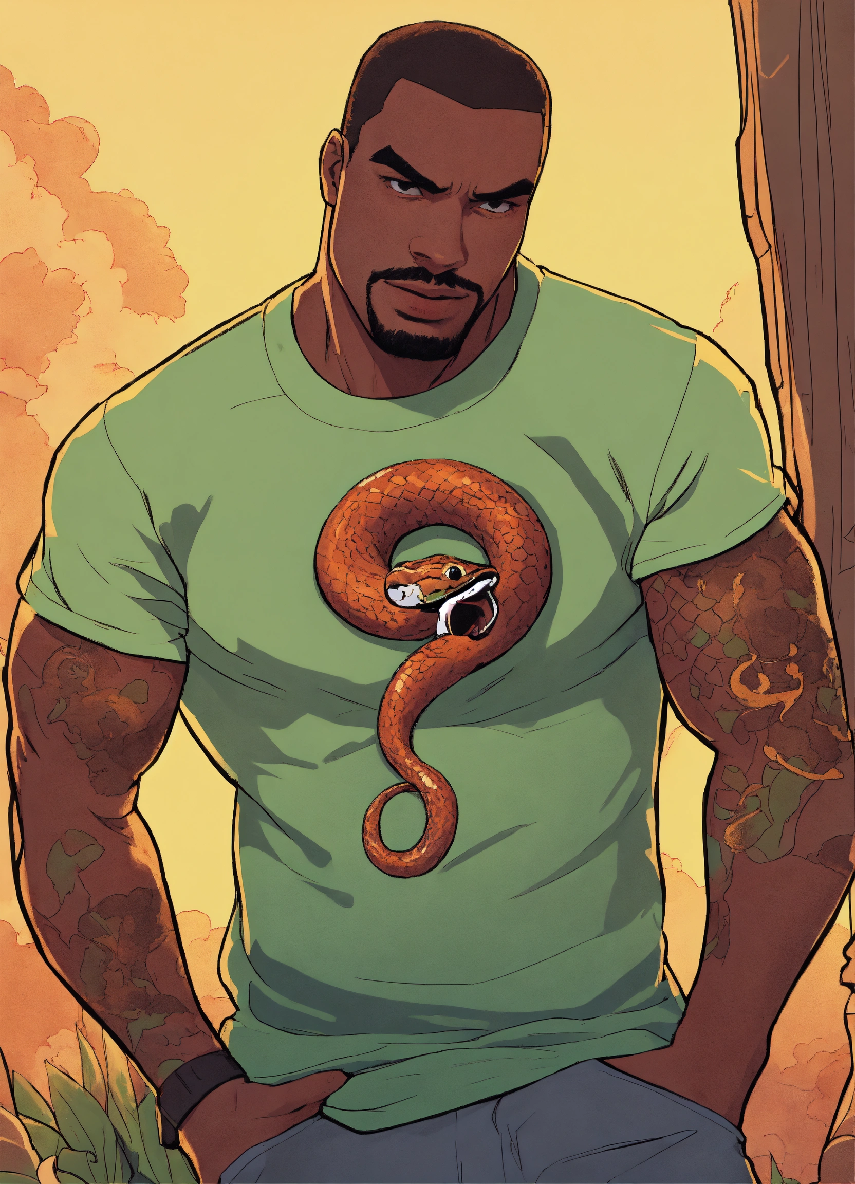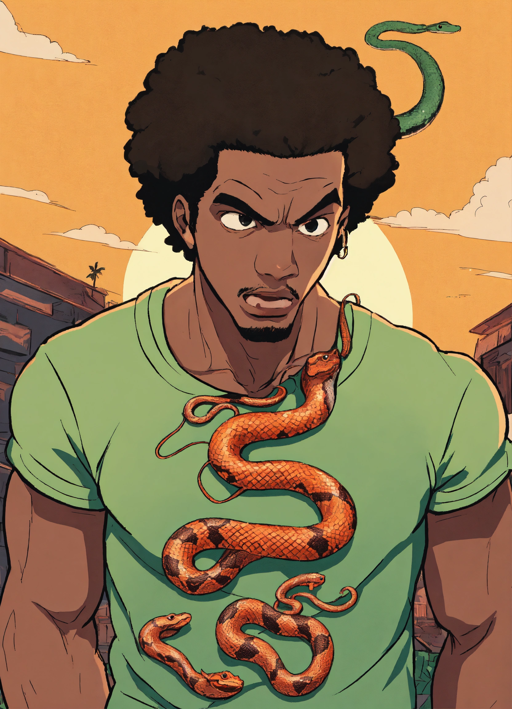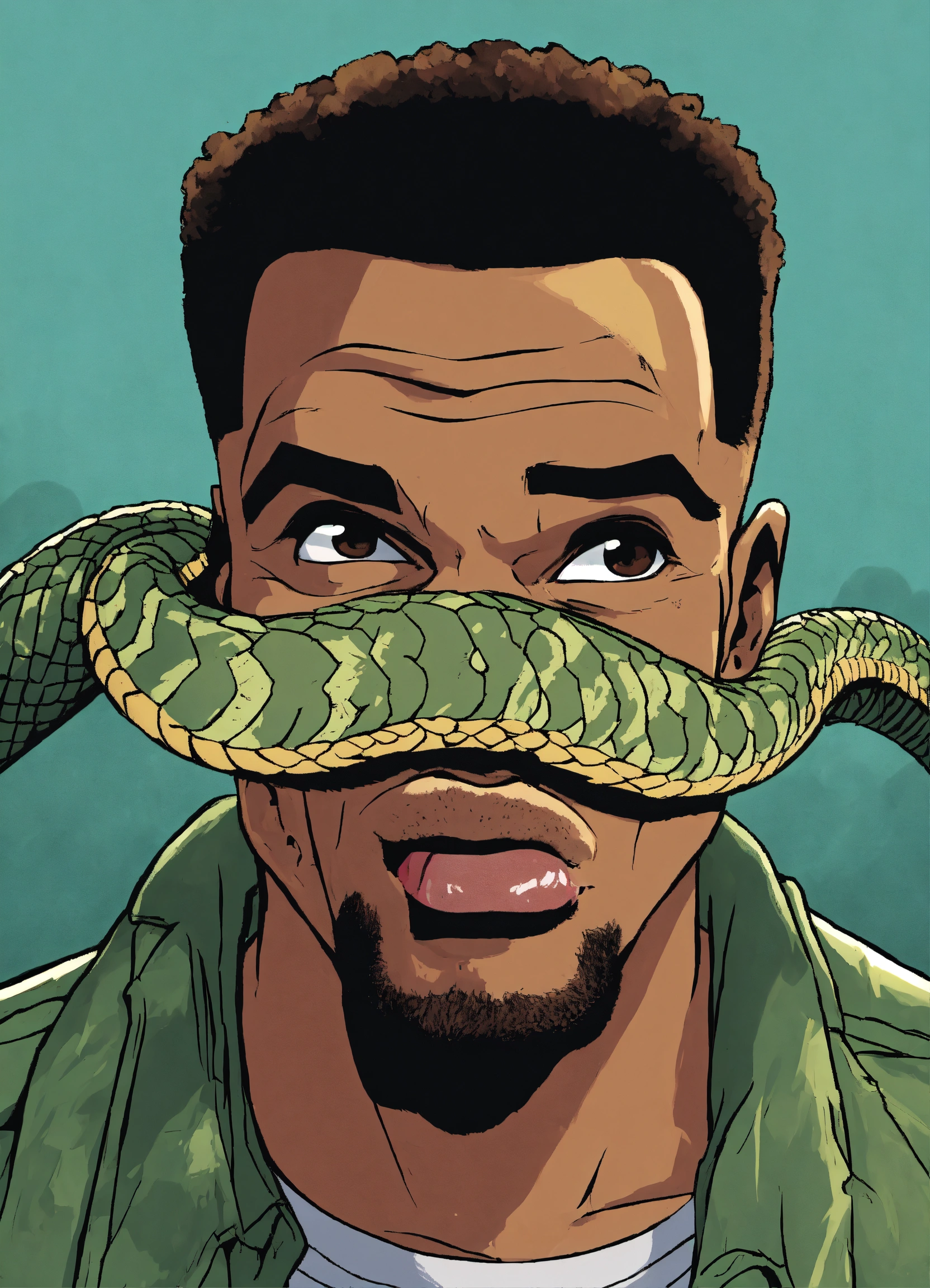 Image of a man from the shoulders up, wearing a t-shirt, with a small snake coming from his mouth going through his eye, wrapping itself around his body, boondocks-styled, cartoon-styled