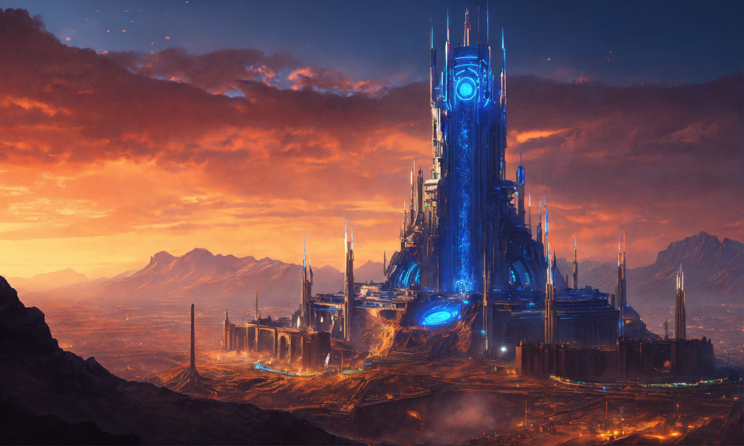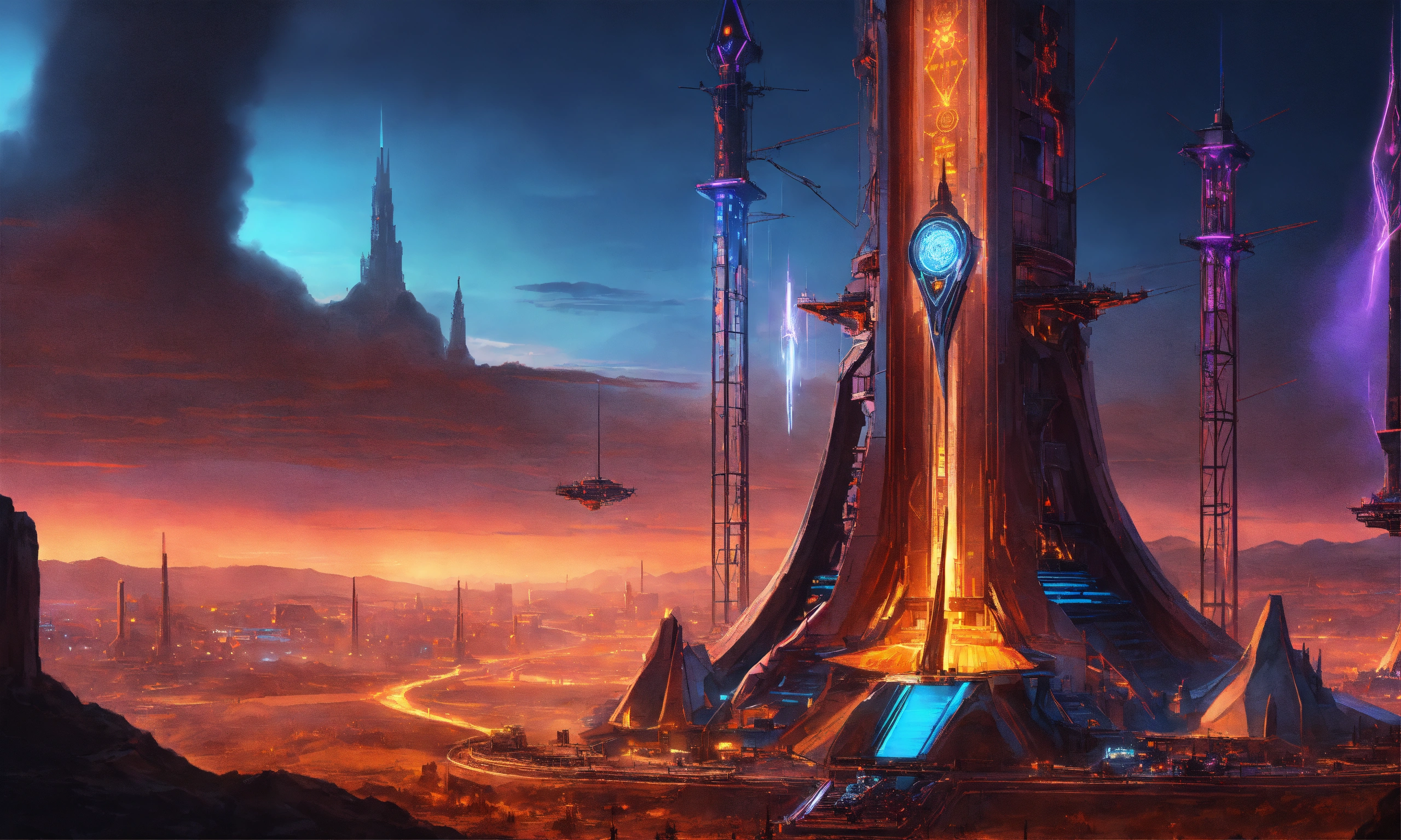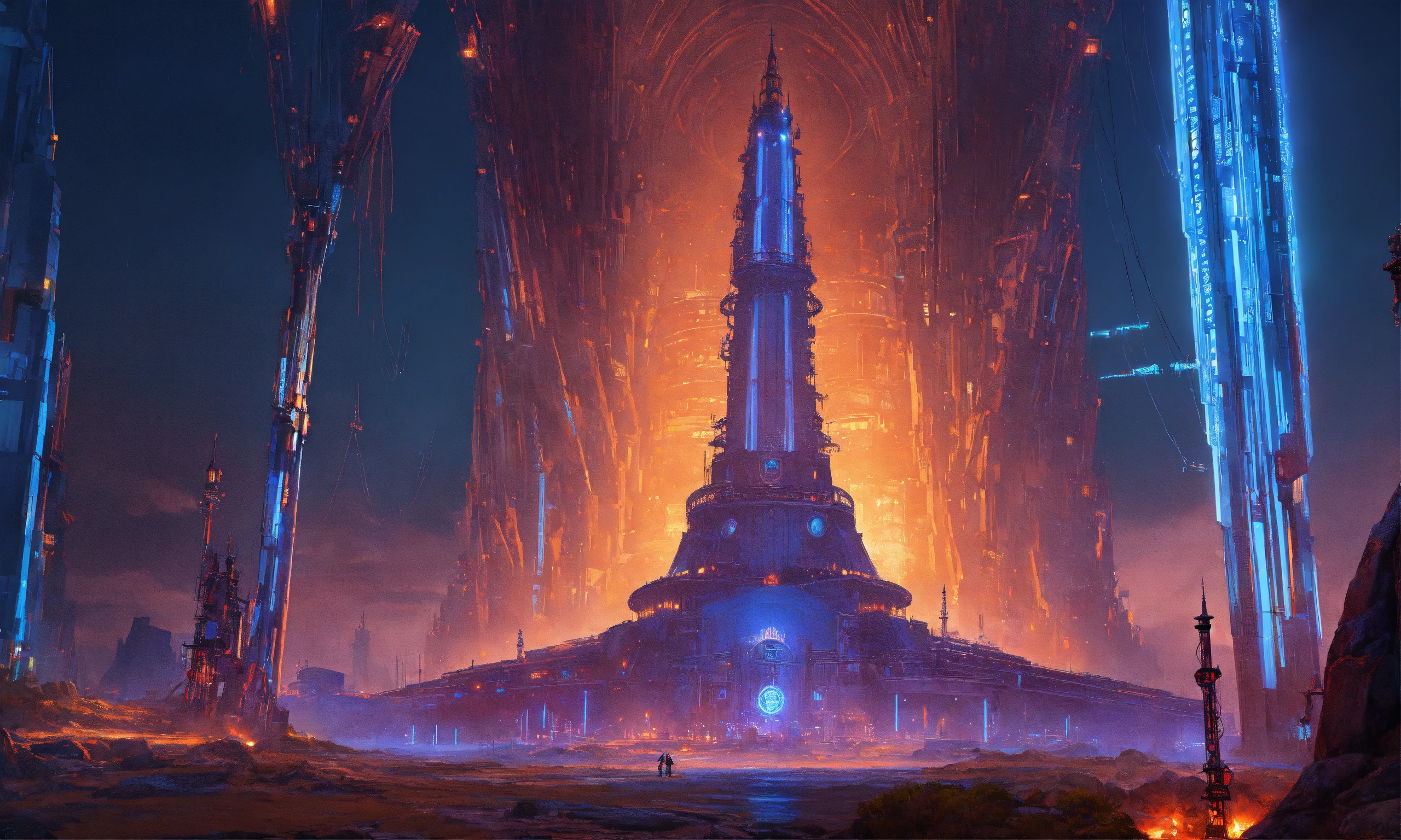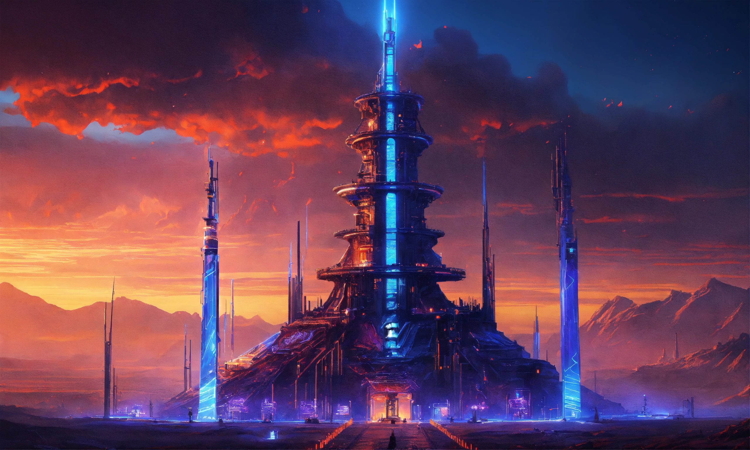 Tall futuristic tower of sauron, temple with coils and circuits going up the structure, powerful blue electricity is striking from sub towers to the top of the evil tower, energy surges, colorful lights, tron style, spider robot are on patrol, secure compound, crystal circuitry, giant speakers on elaborate stands around the tower, in the middle of a wasteland, unreal engine, 8k, vibrant neon illumination up the tower