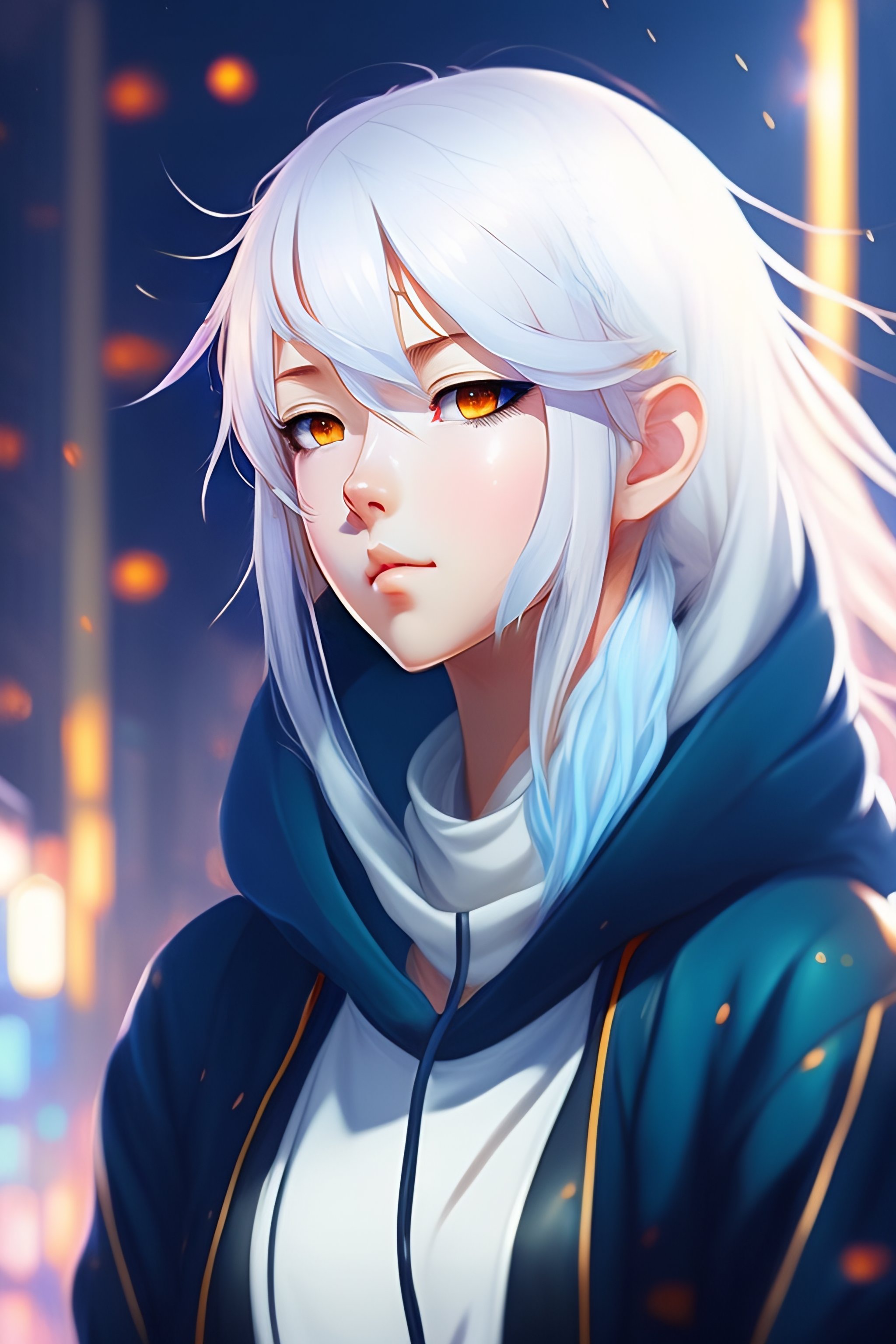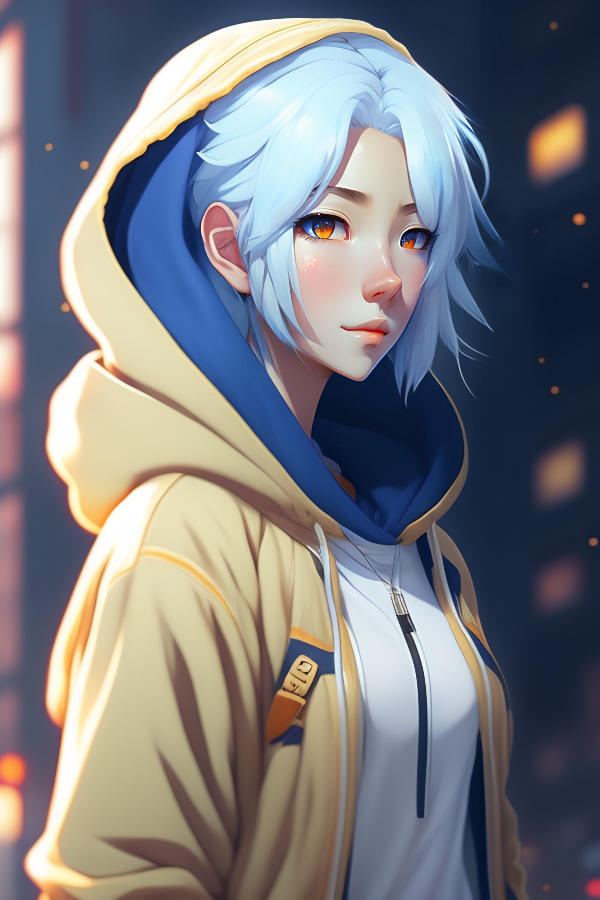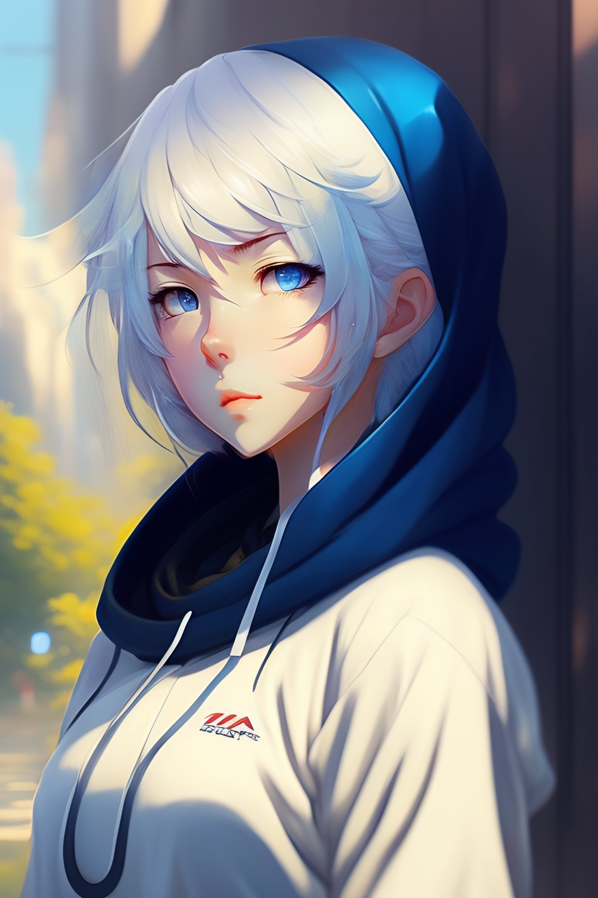 Oil painting anime key visual full body portrait character concept, white hair with blue eyes, blue hoodiekuudere cute, trending pixiv fanbox, rule of thirds golden ratio, by wlop makoto shinkai takashi takeuchi studio ghibli