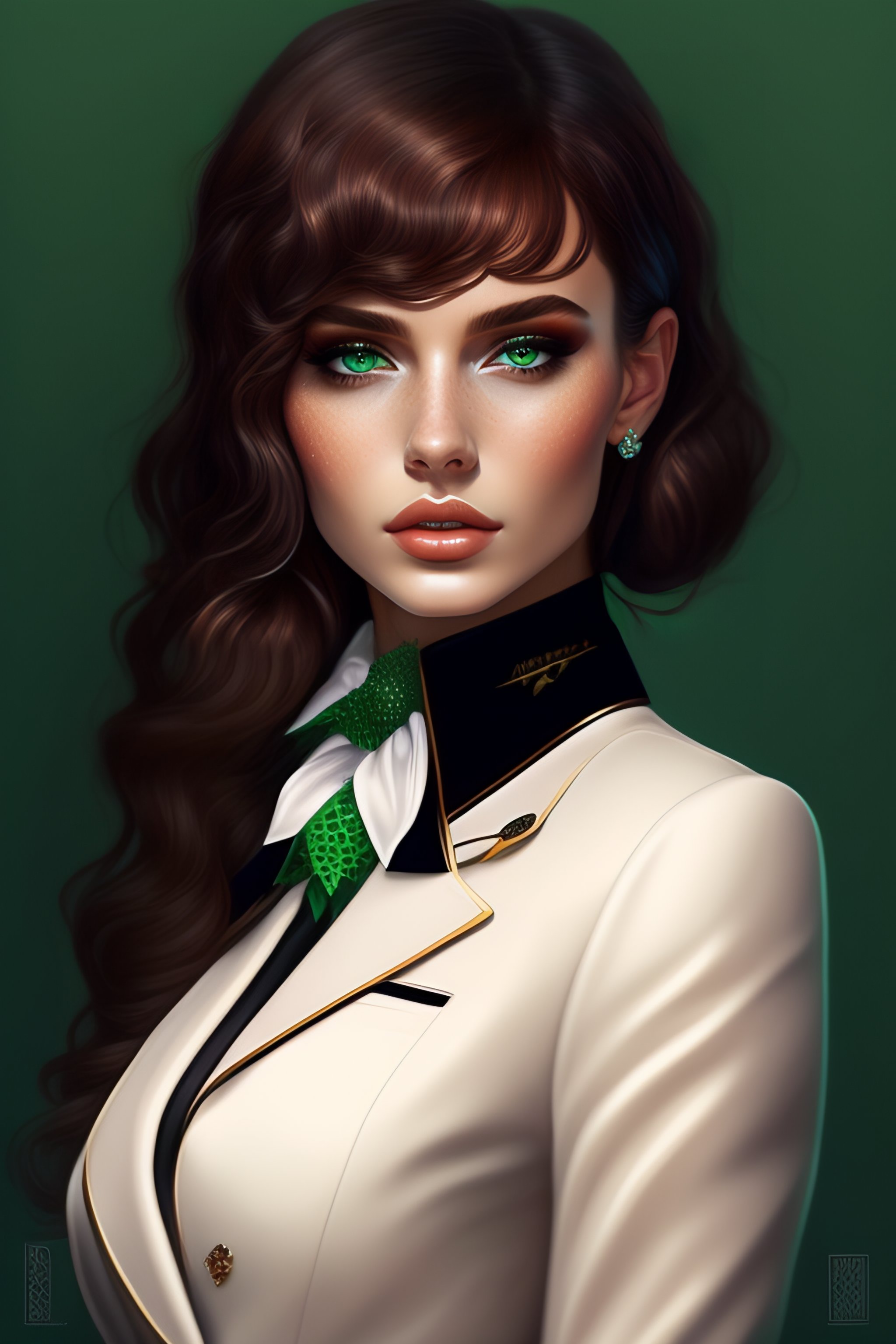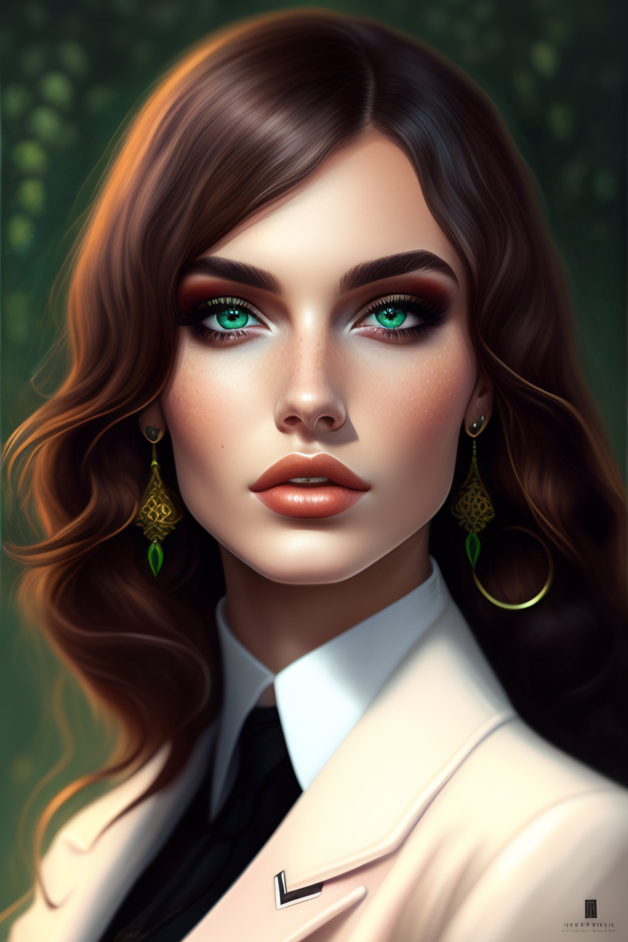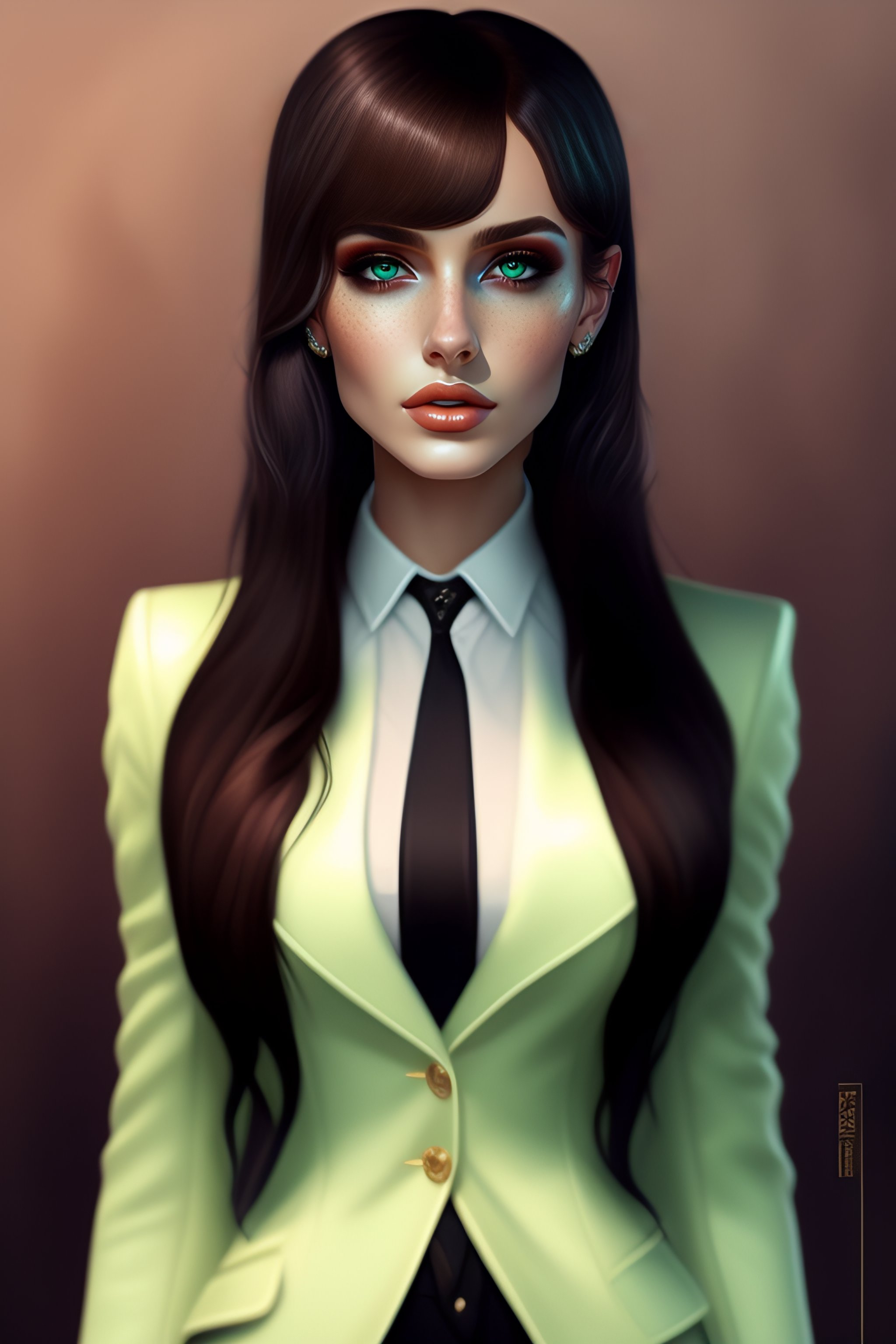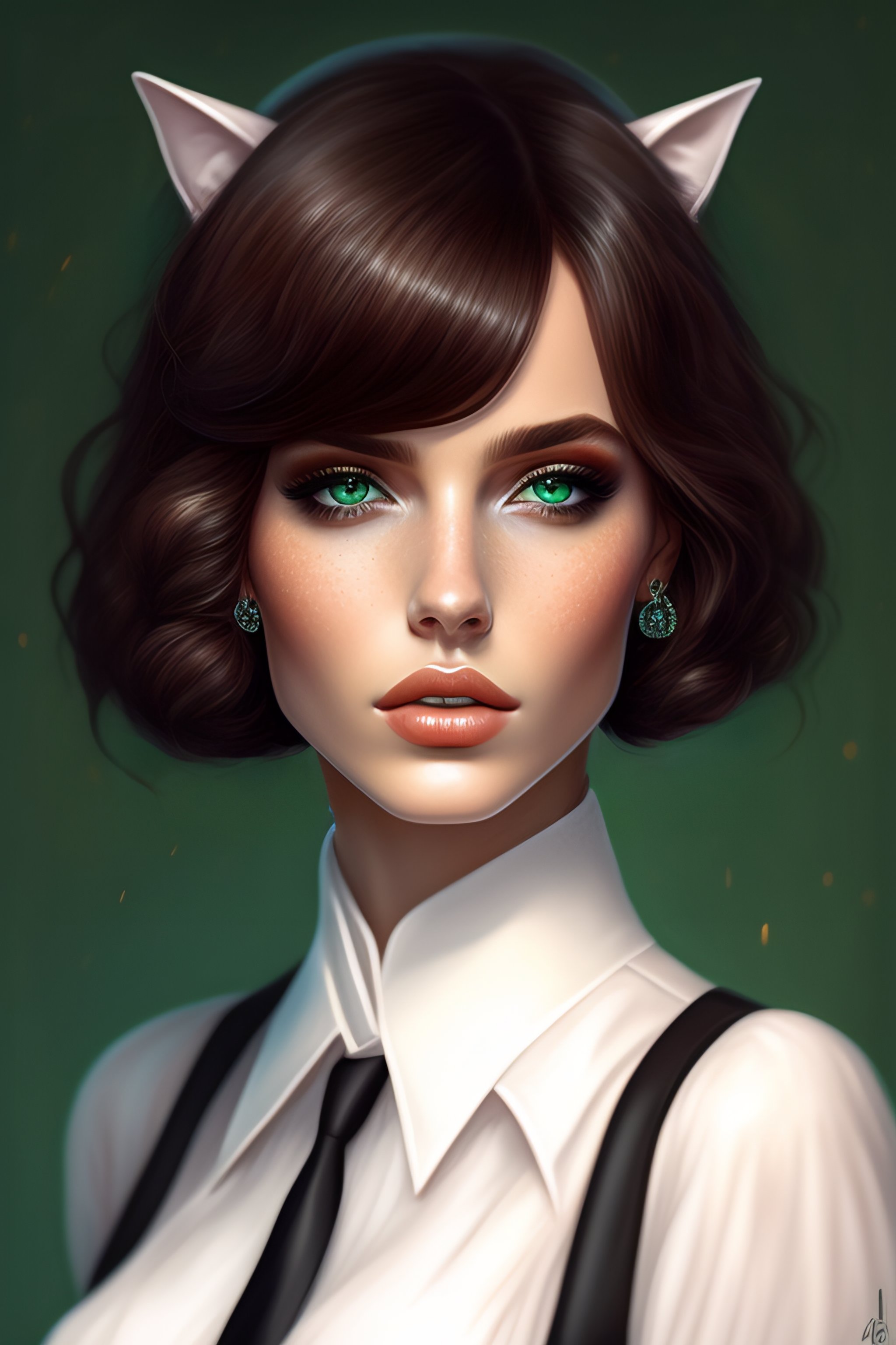 Hungarian, e-girl, aesthetic, bangs, brown hair, light green eyes, black and white fitted suit, beautiful eyes, beautiful lips, gothic, full body, slim, stylish, freckles, cat ears, 8k, high detail, highly detailed, digital painting