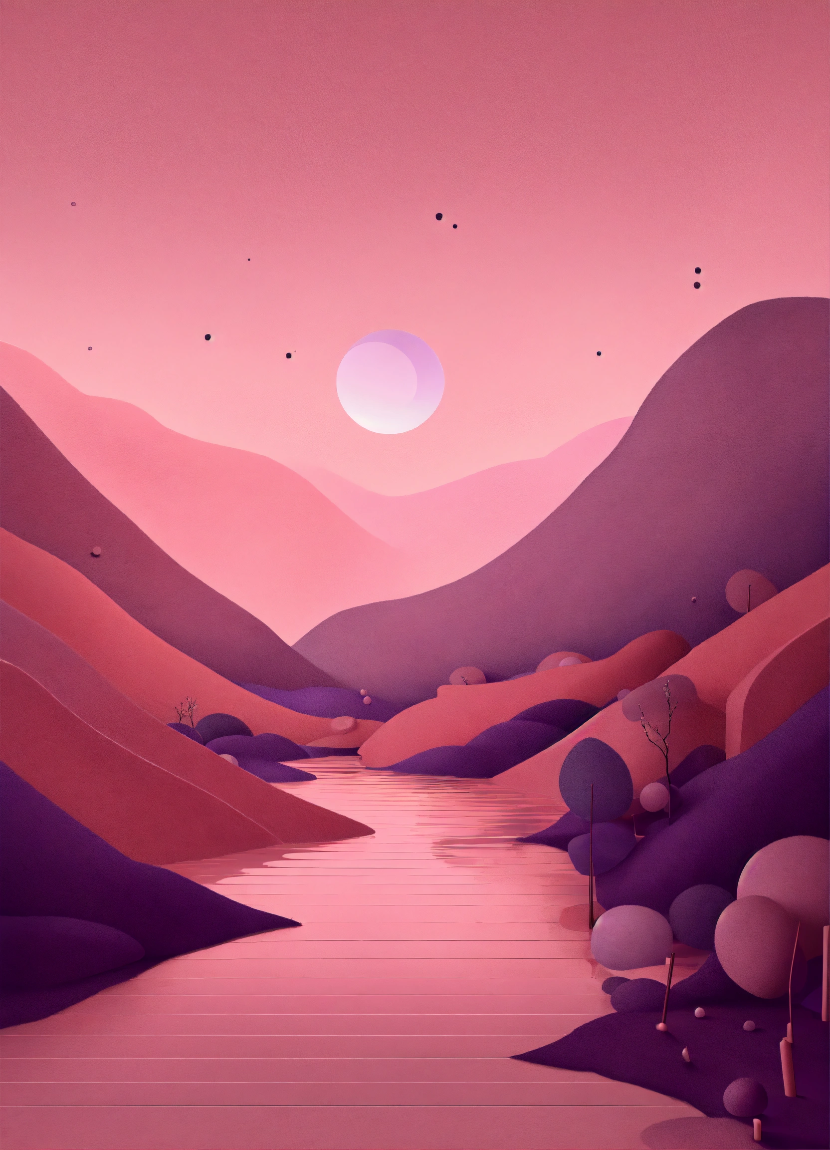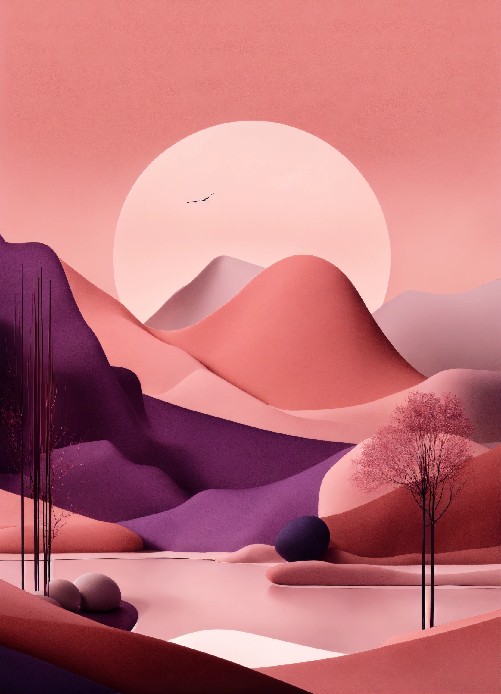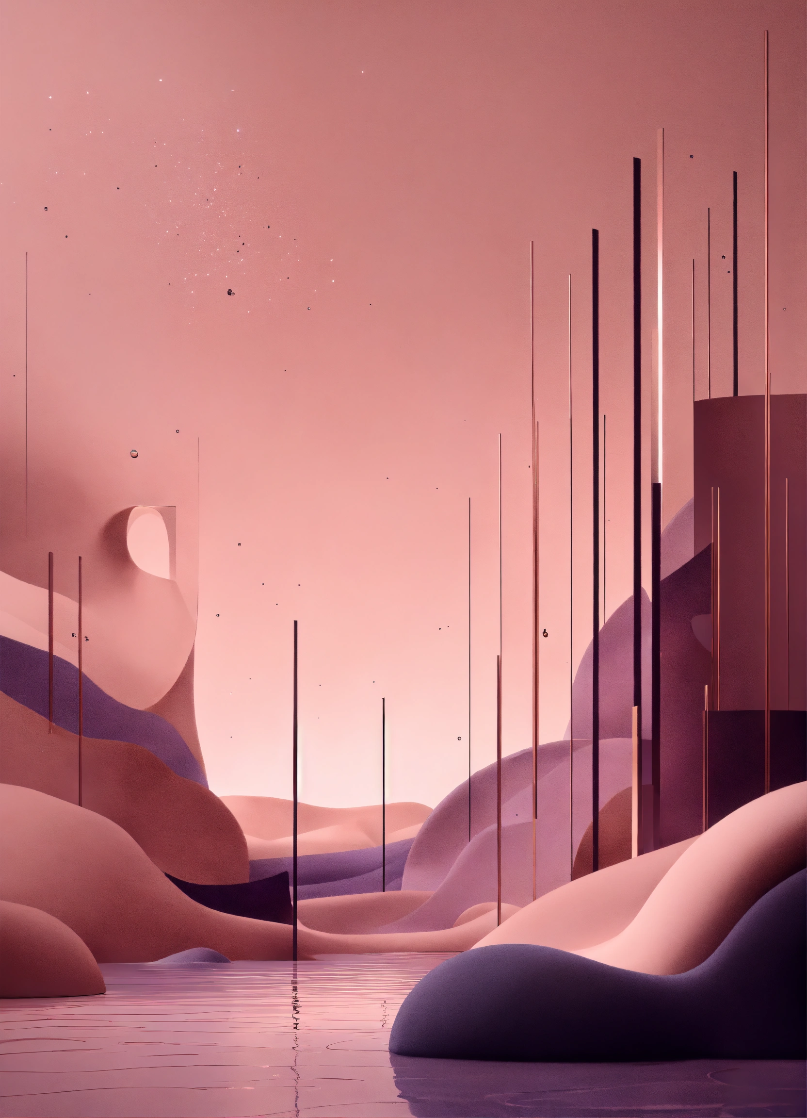 Muted tones of dusty pink and dark purple surreal combination with minimalist compositions, evoking a sense of calmness, ink illustrations, simple bare minimalist style 3d compositions, wedding theme.