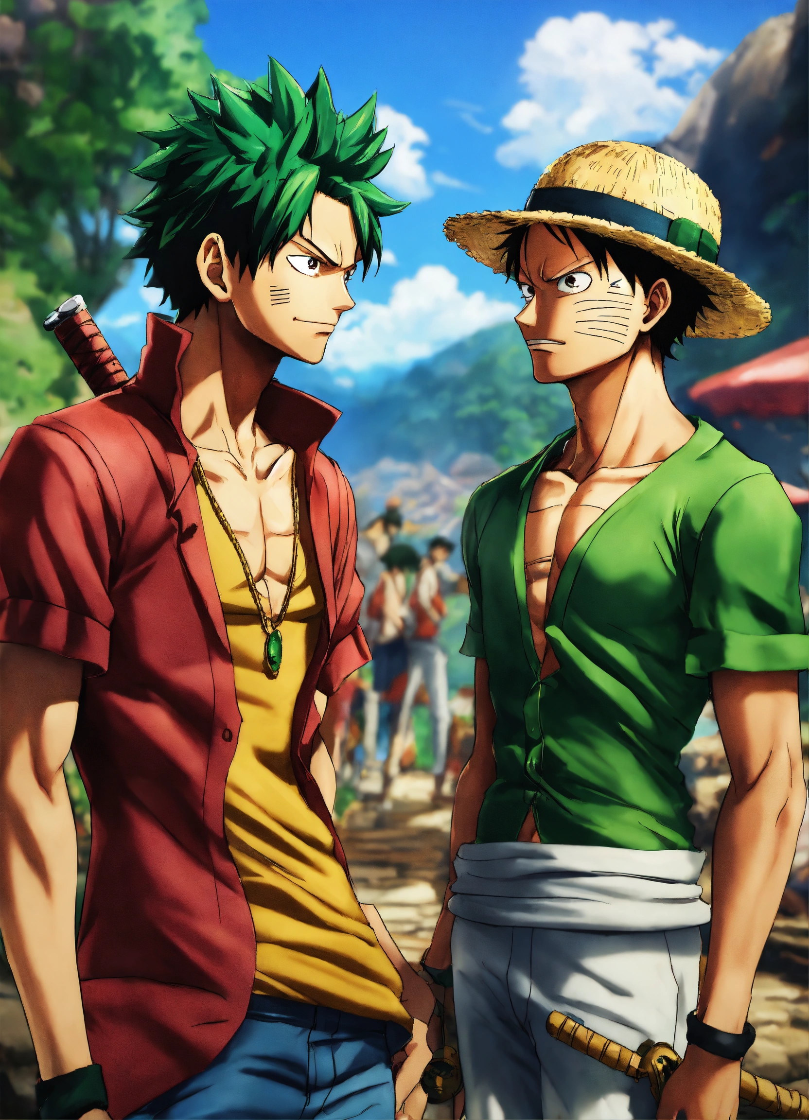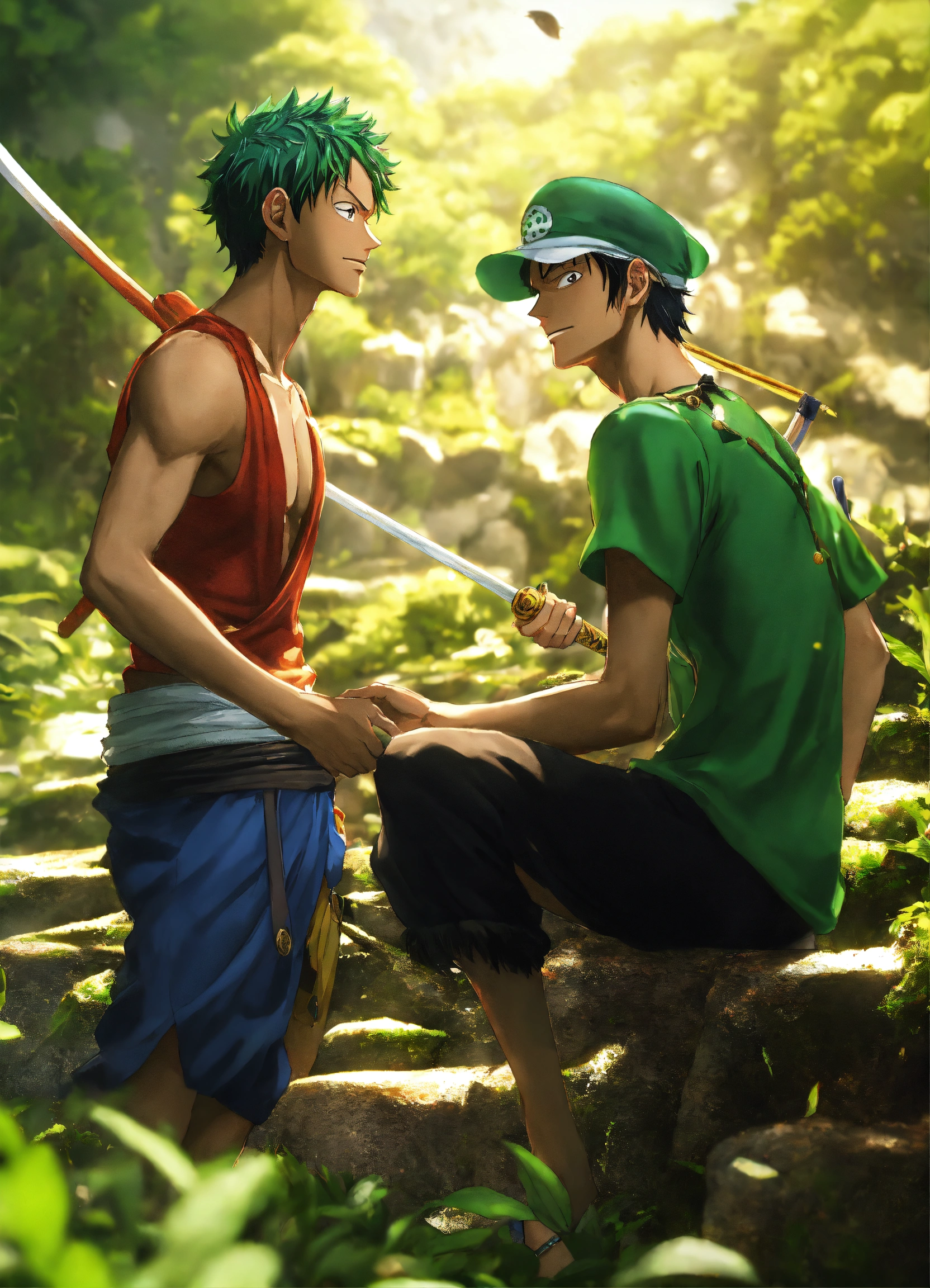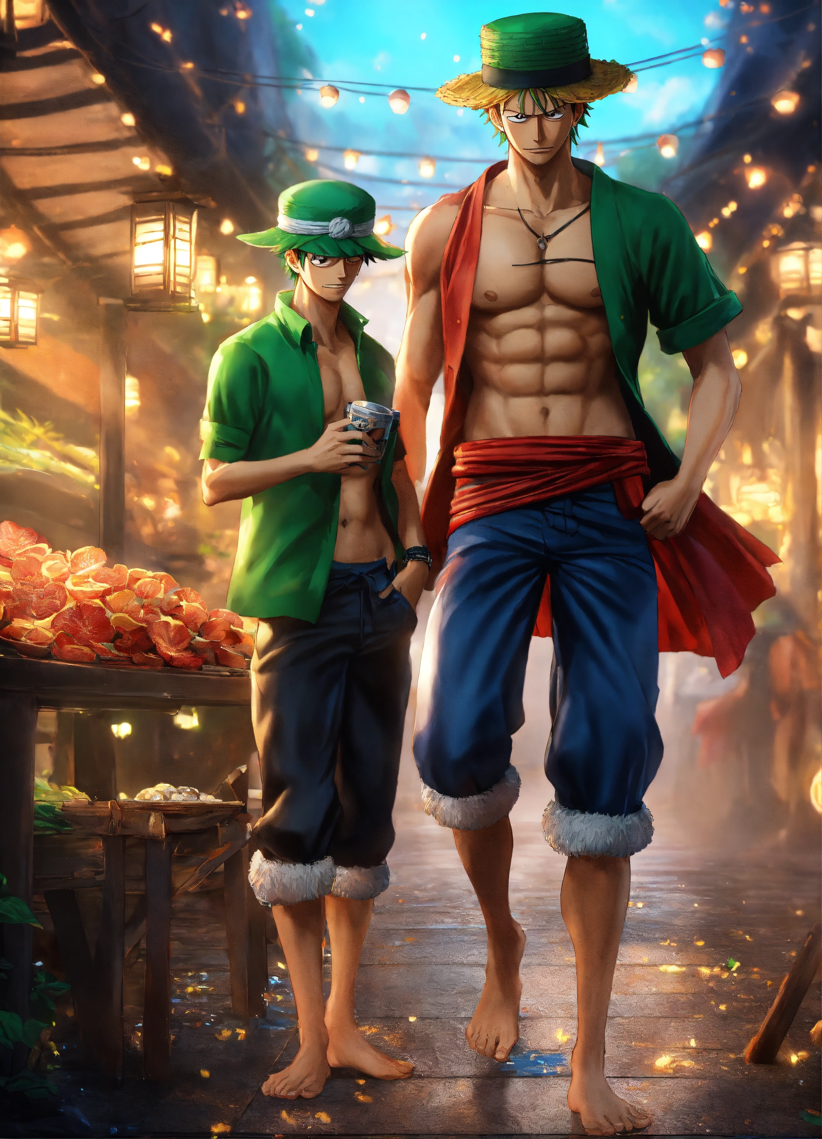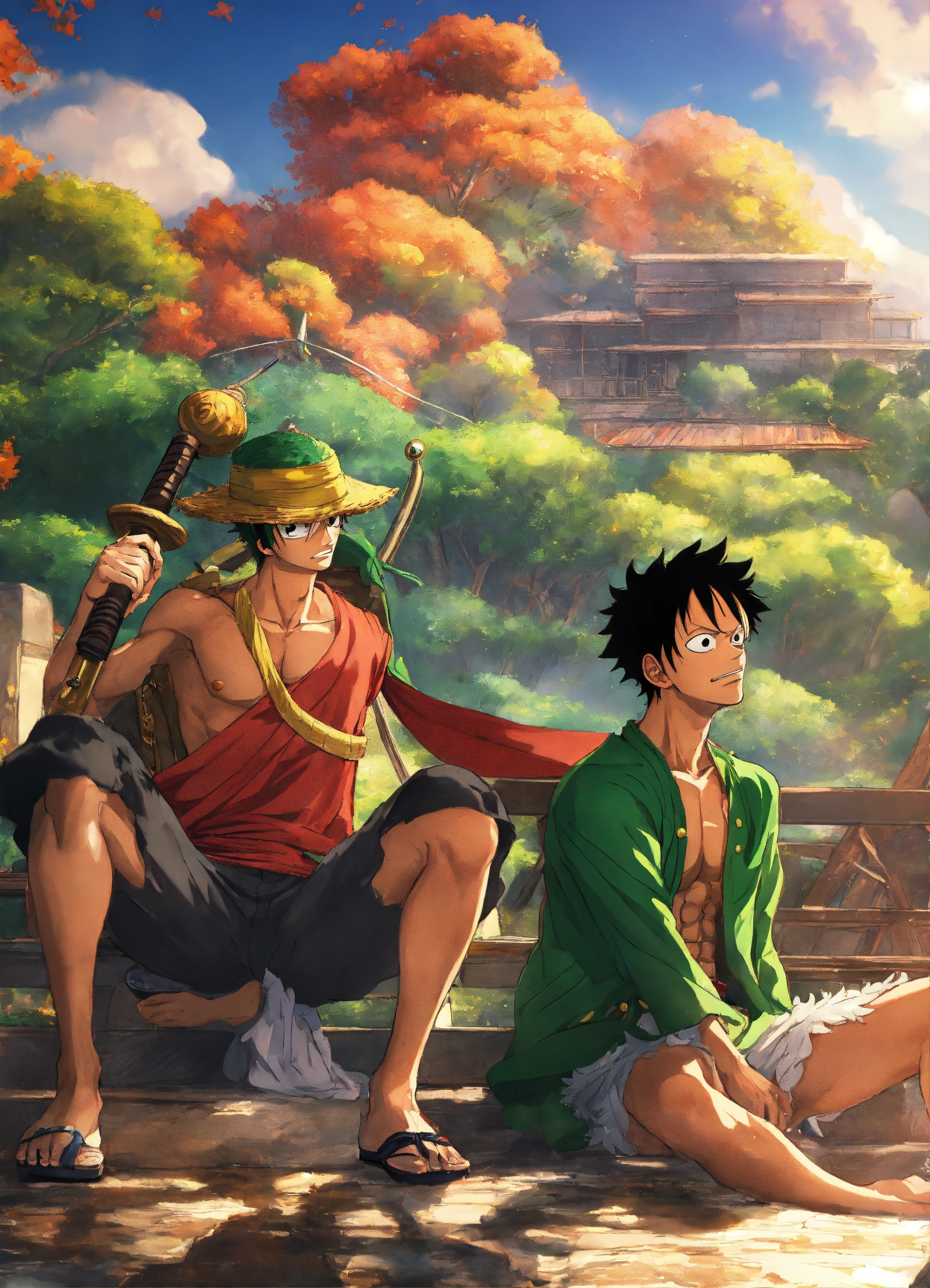Portrait of luffy and zoro from one piece, detailed scene, stunning details, anime, detailed environment, ray tracing, 8k