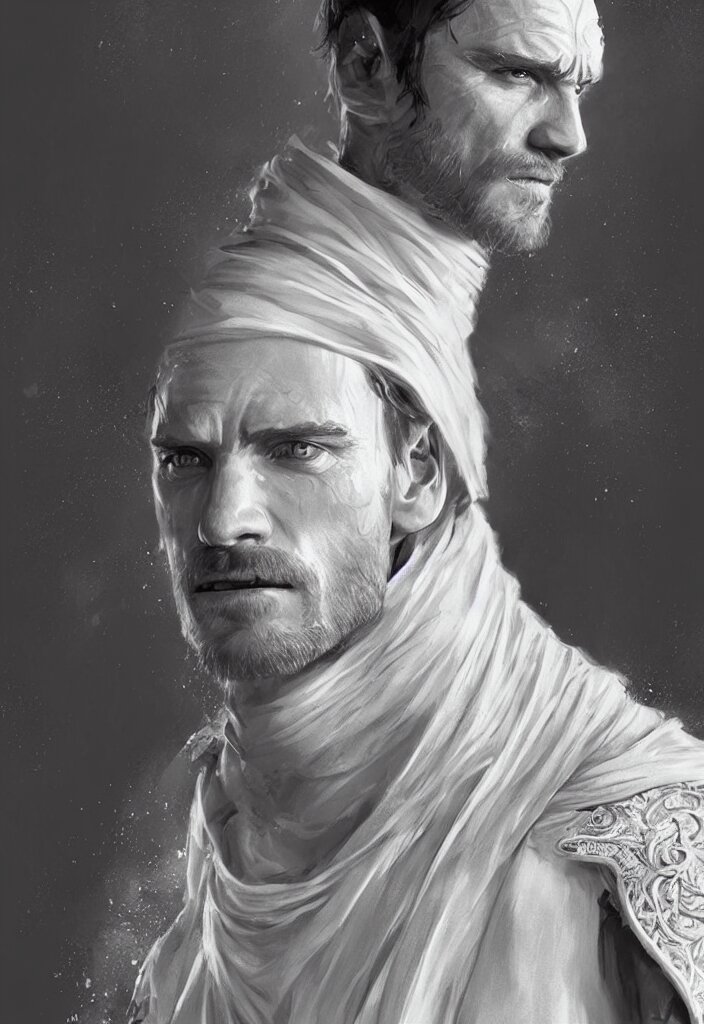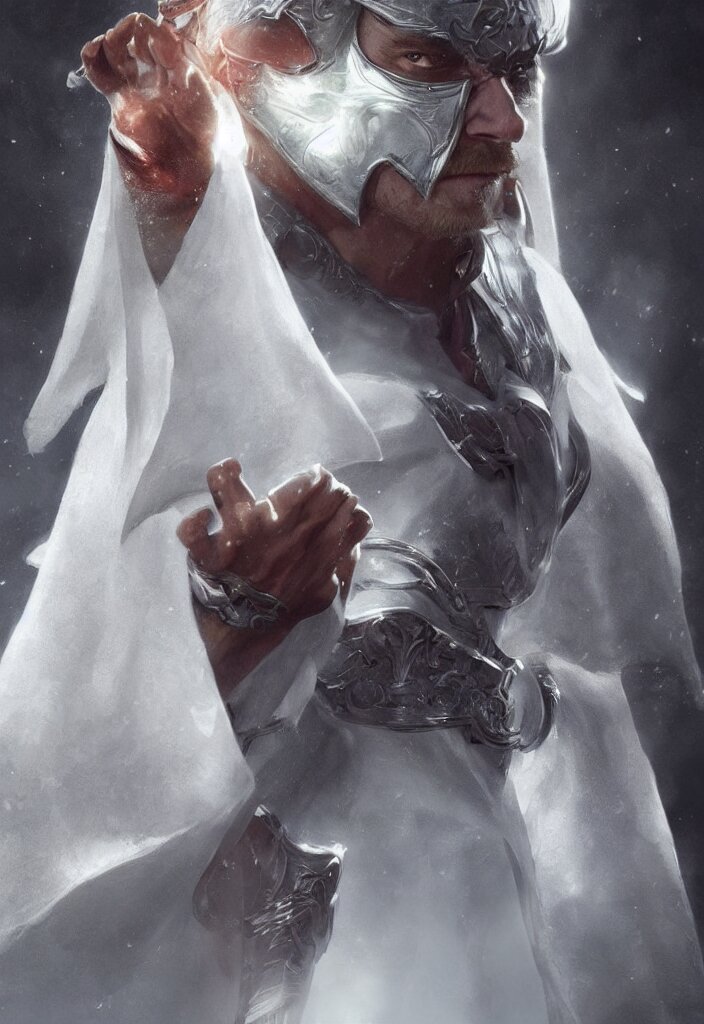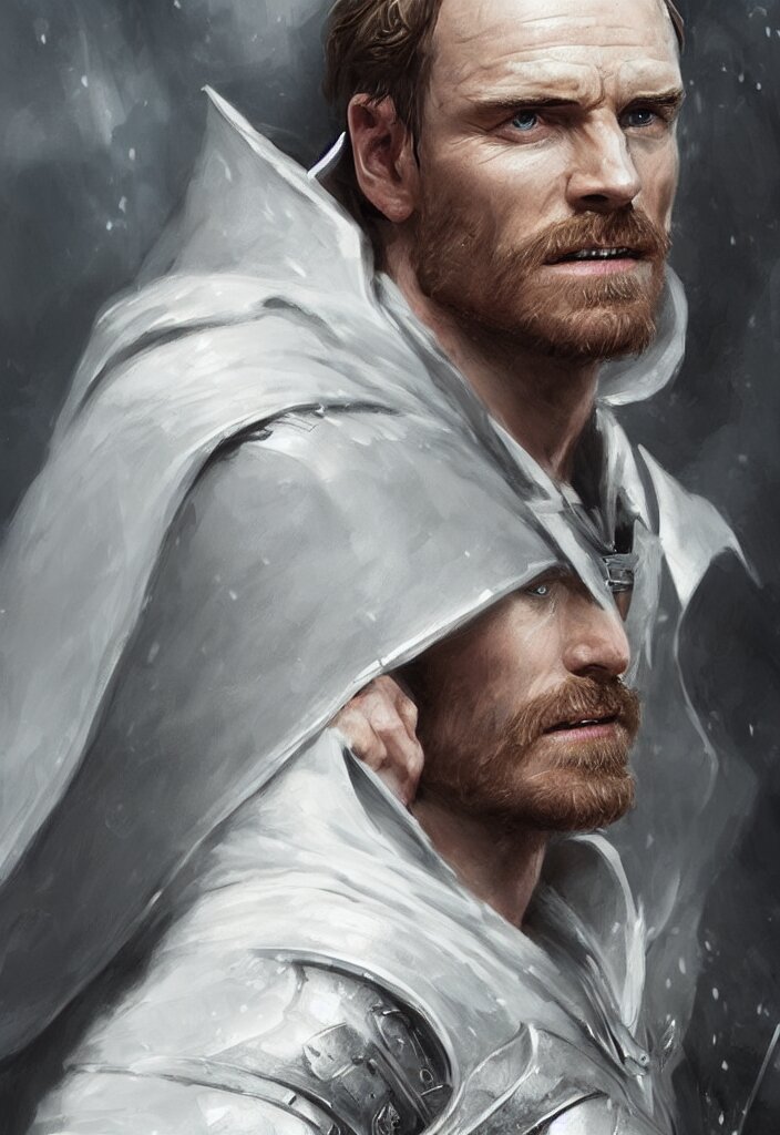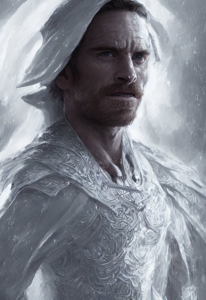 Michael fassbender in white cloak armor, intricate, epic lighting, hyper realistic, ray tracing, white short hair, character concept art, cinematic, artgerm, ultra detailed, artstation trending.