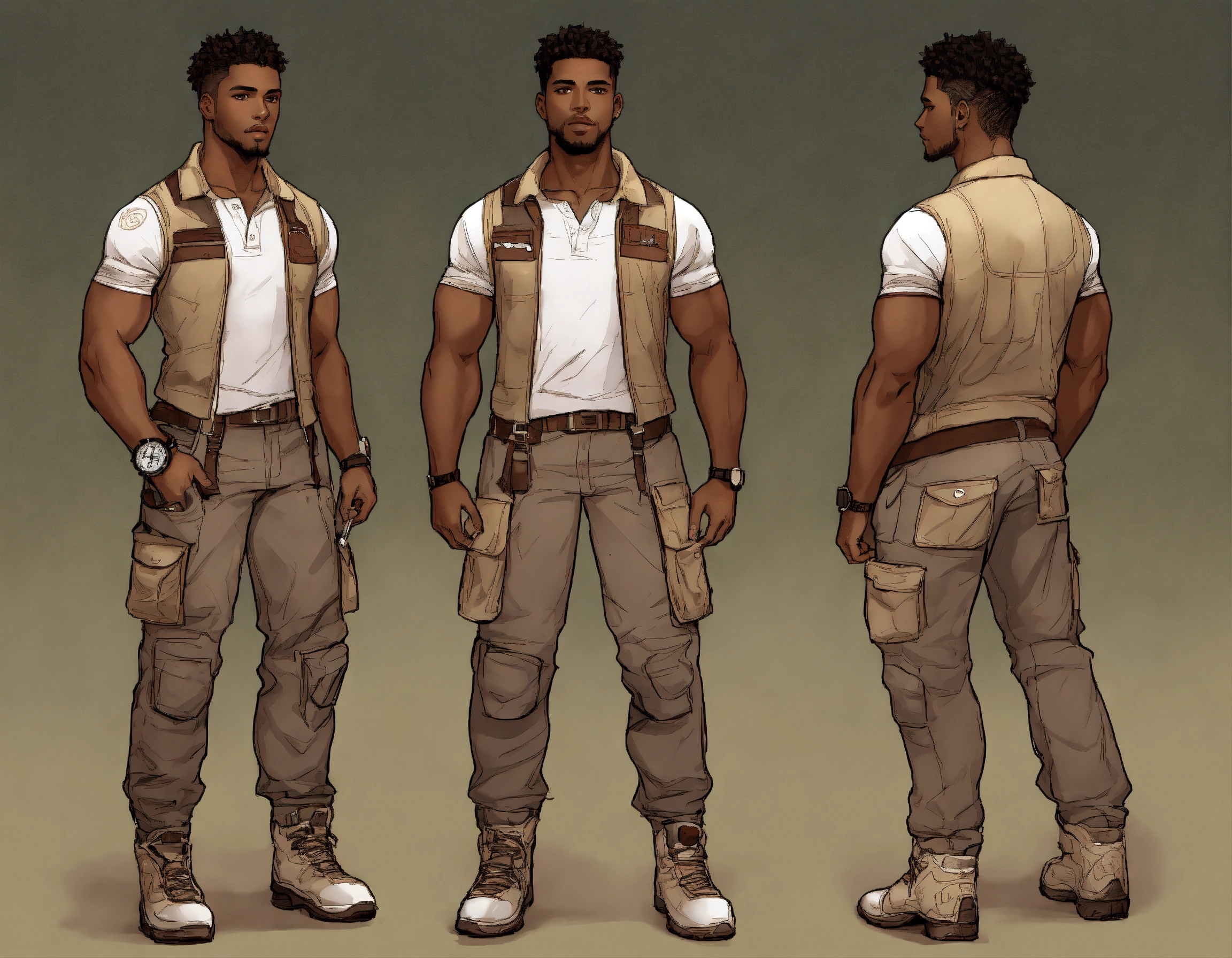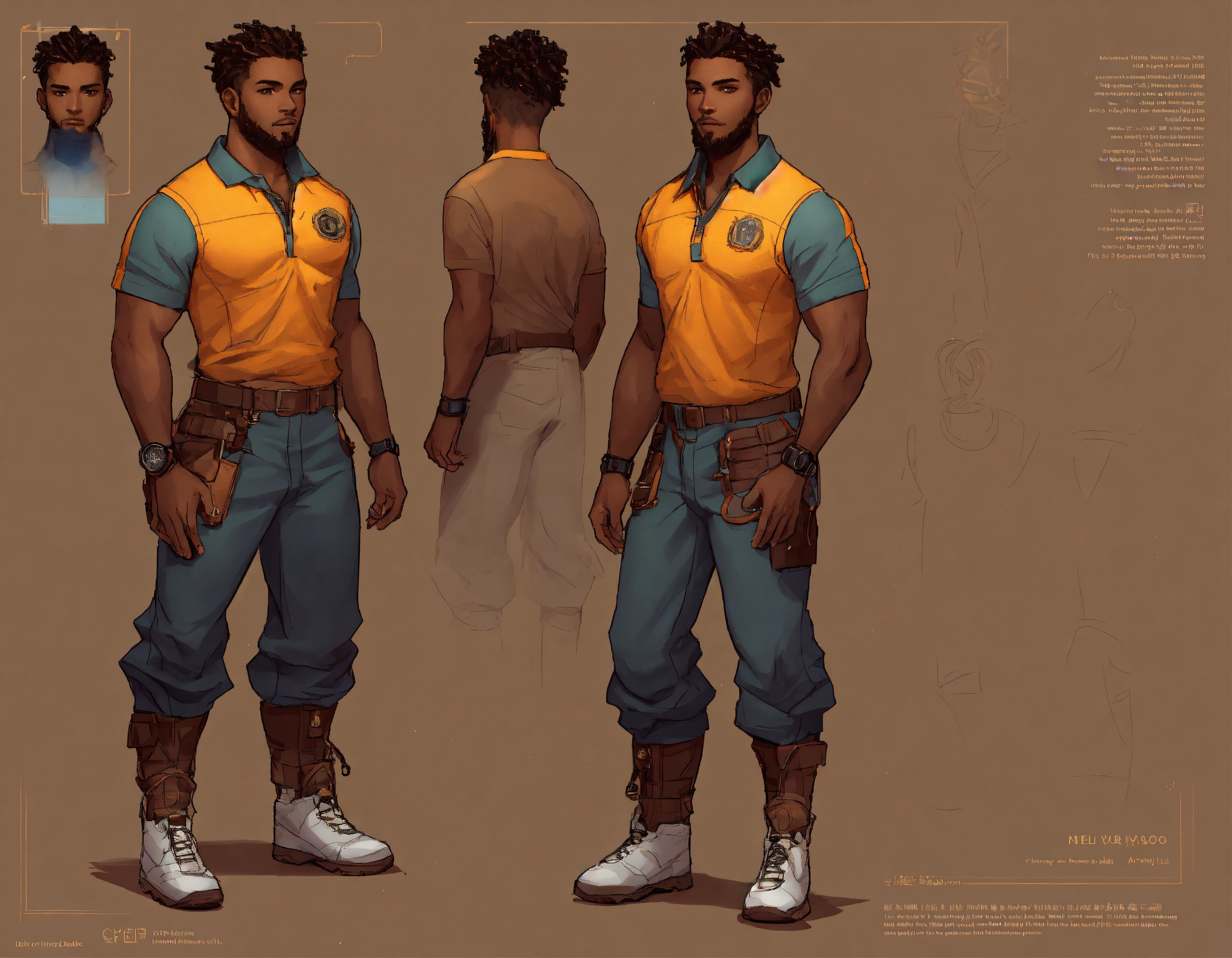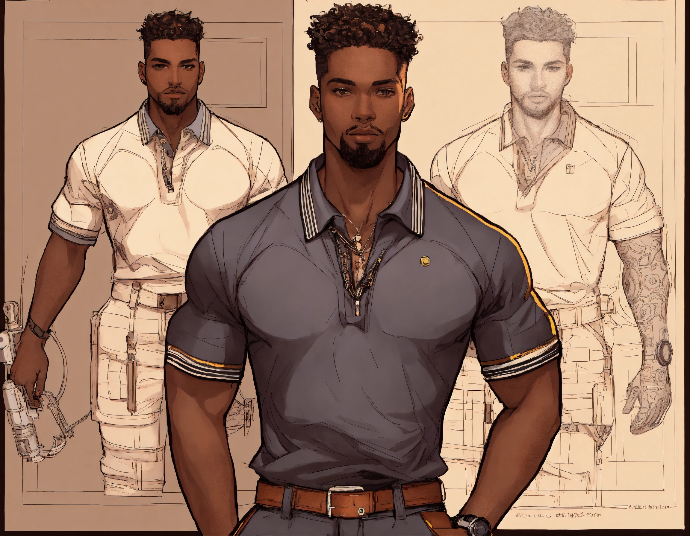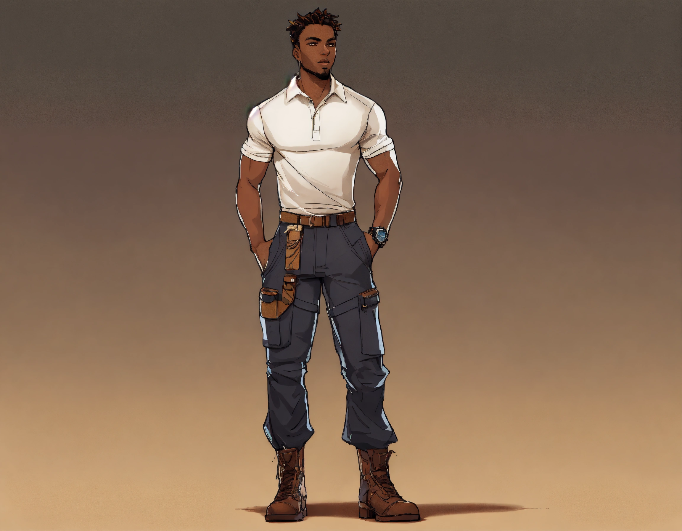 Dark dark complexion fully clothed athletic man, realistic healthy glossy well defined loc’d hair texture, full body shot, rule of thirds centered subject placement, storybook, dreamlike, cartoon, illustration, intricate detail line drawing, cyber steampunk, polo shirt, cargo pant