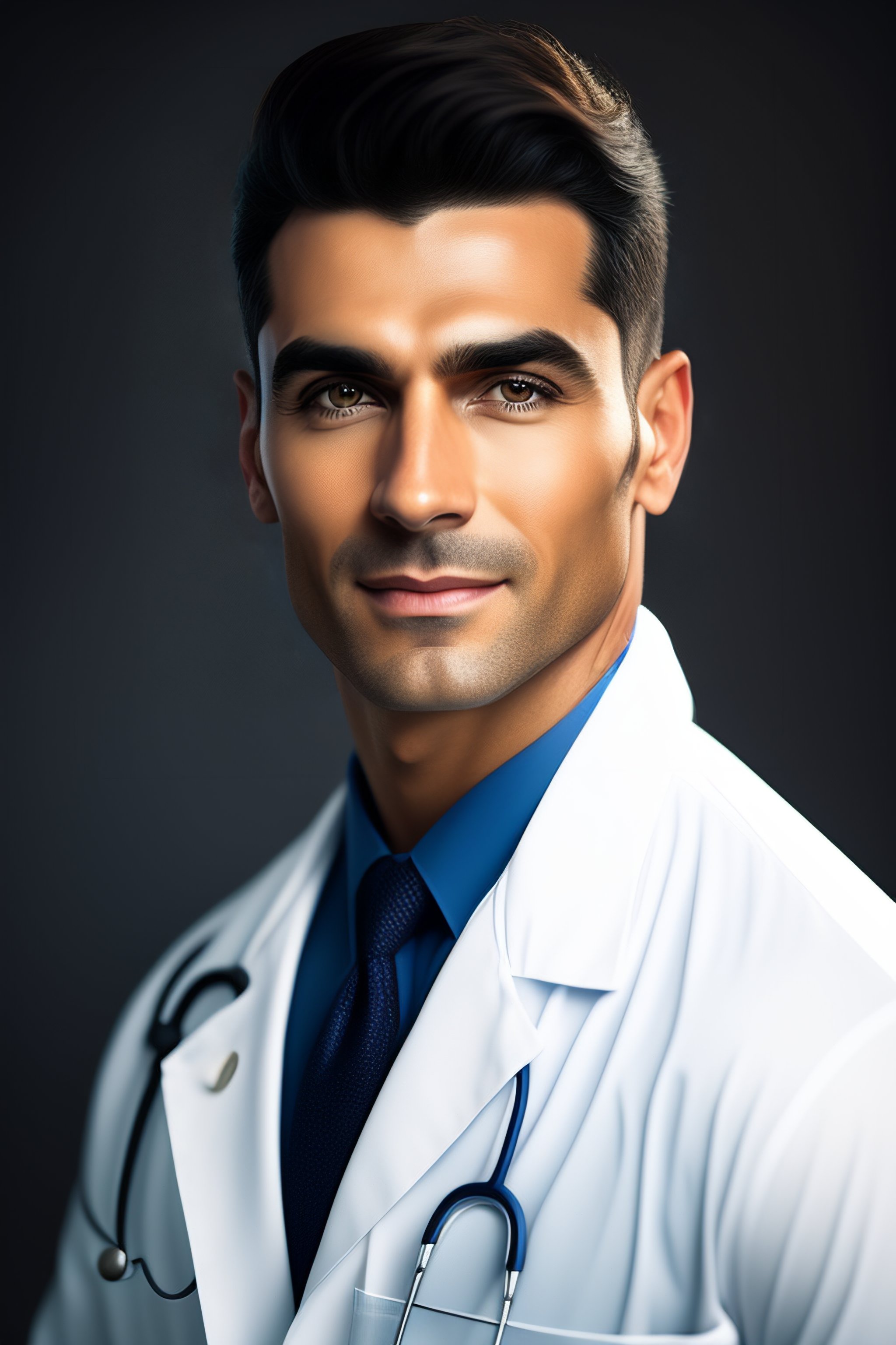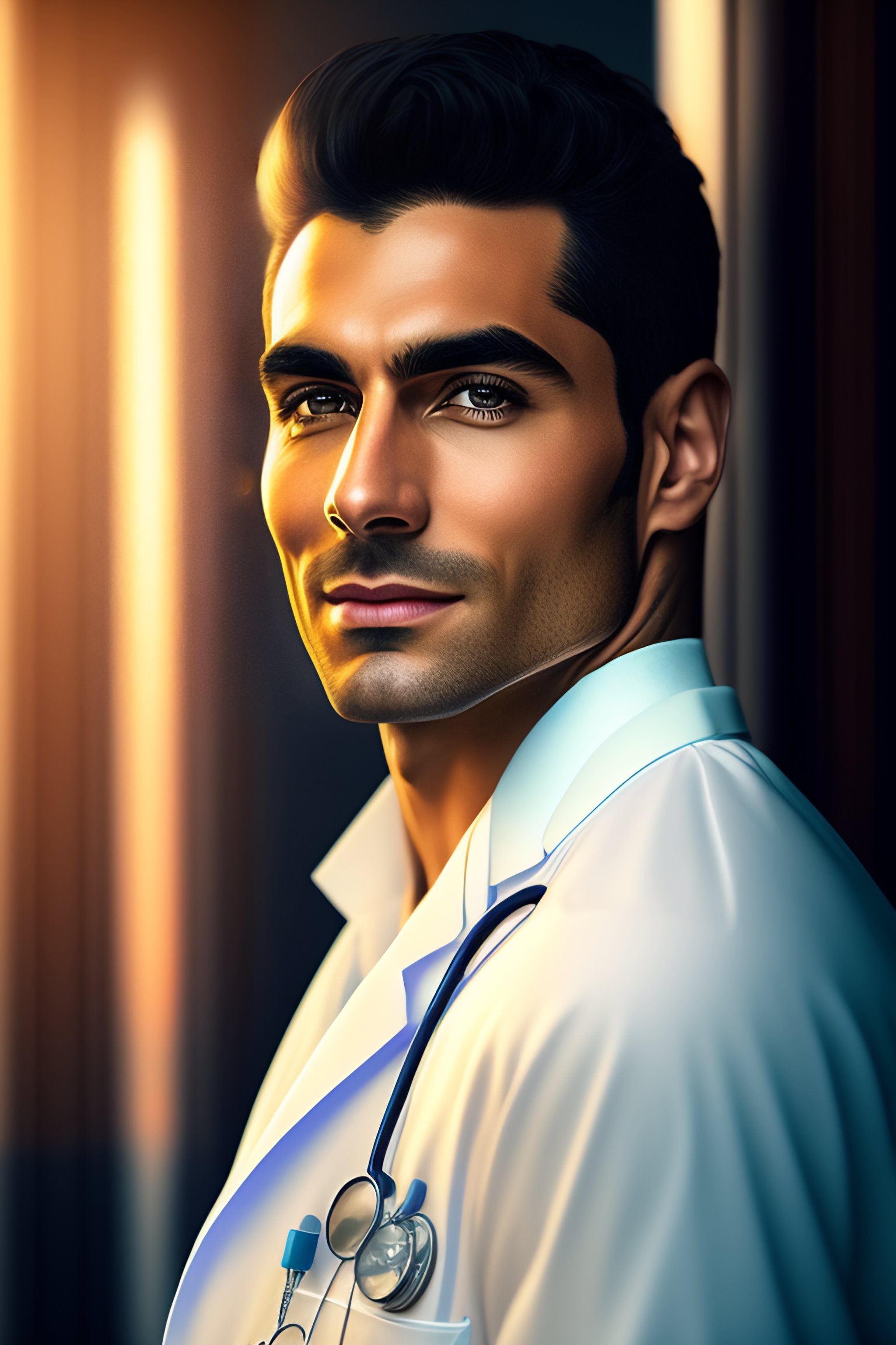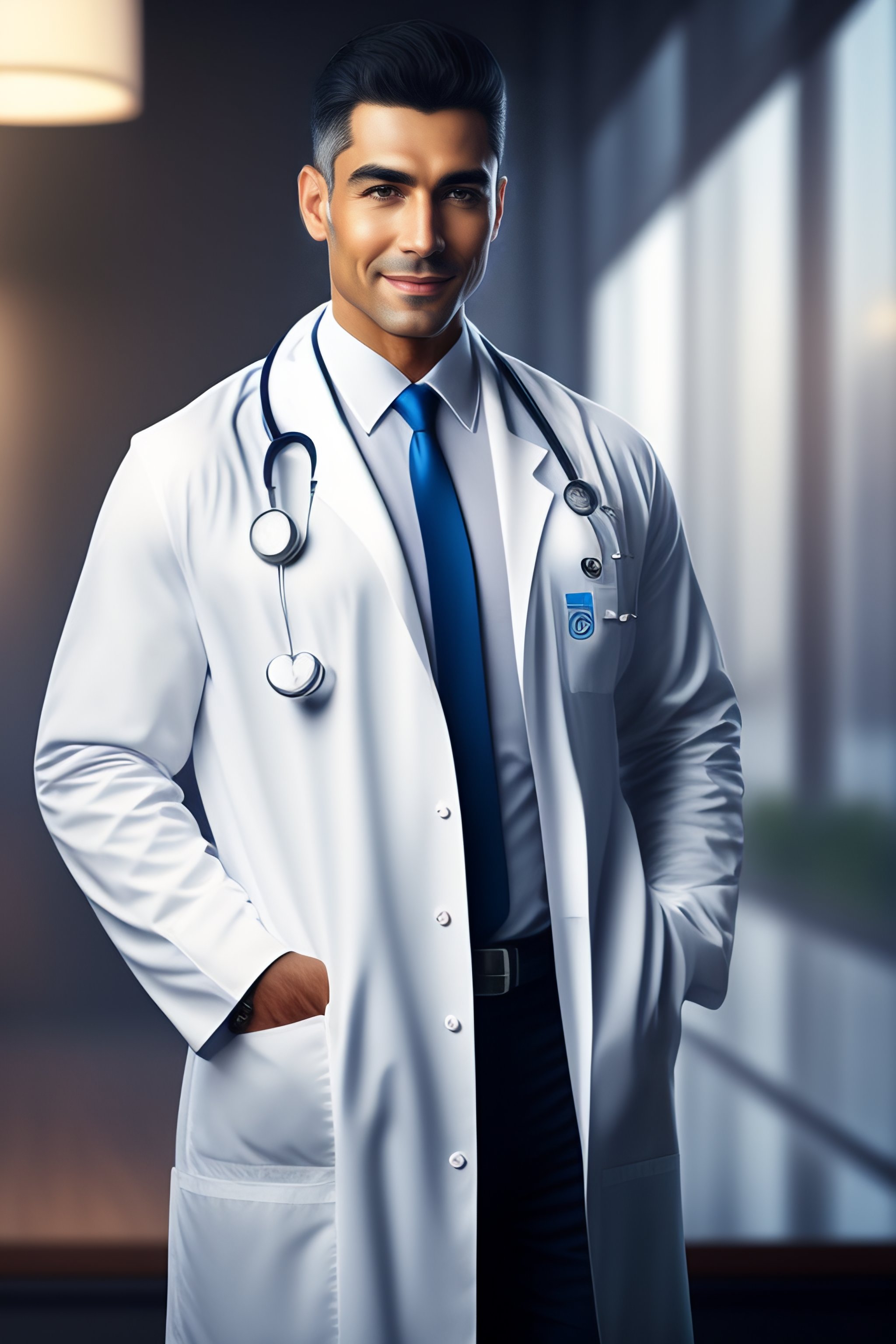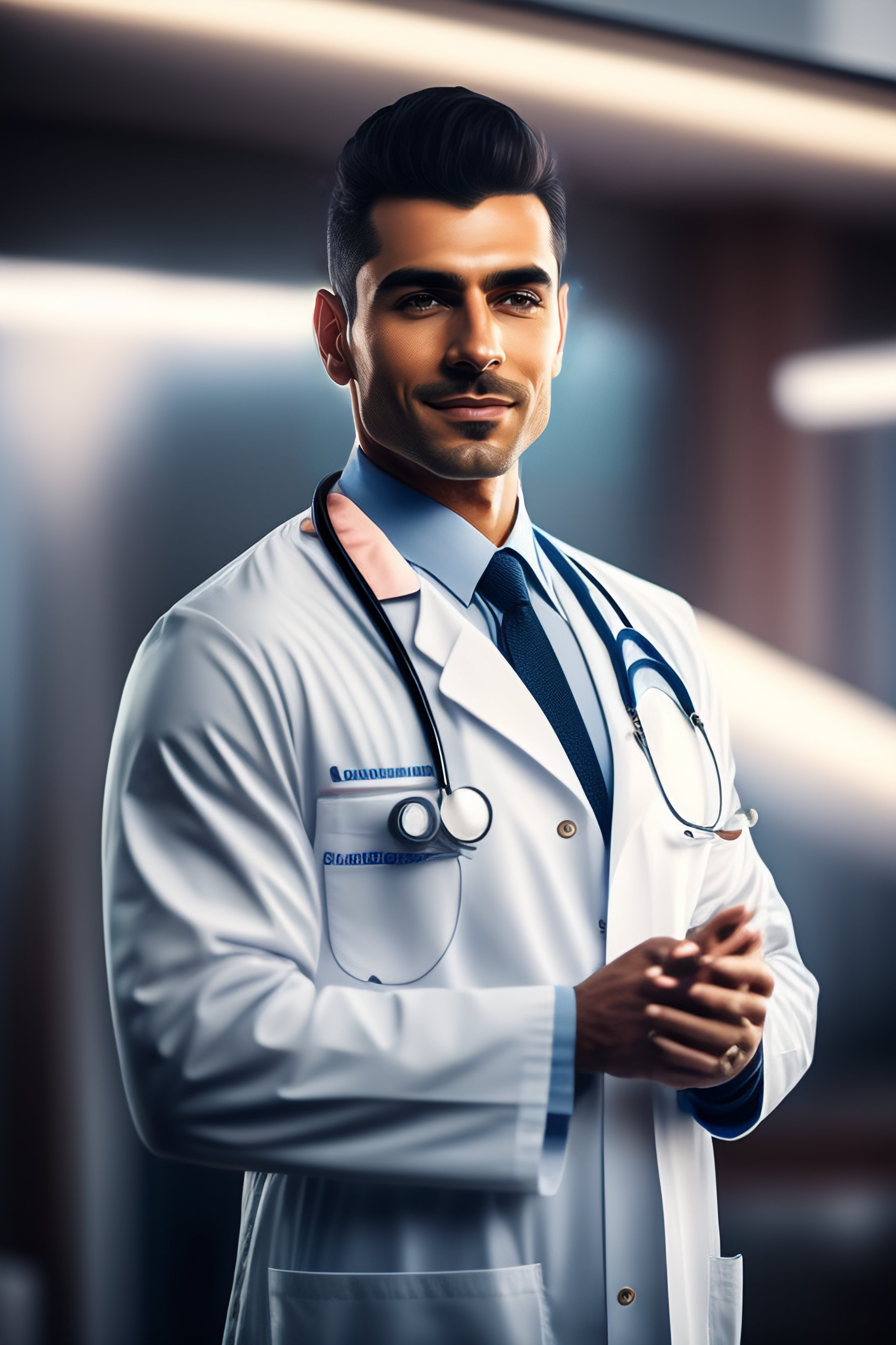 Photo of a realistic experienced male doctor wearing a doctors outfit in the style of stefan kostic, realistic, sharp focus, 8k high definition, insanely detailed, intricate, elegant, art by stanley lau and artgerm, with blurred hospital background