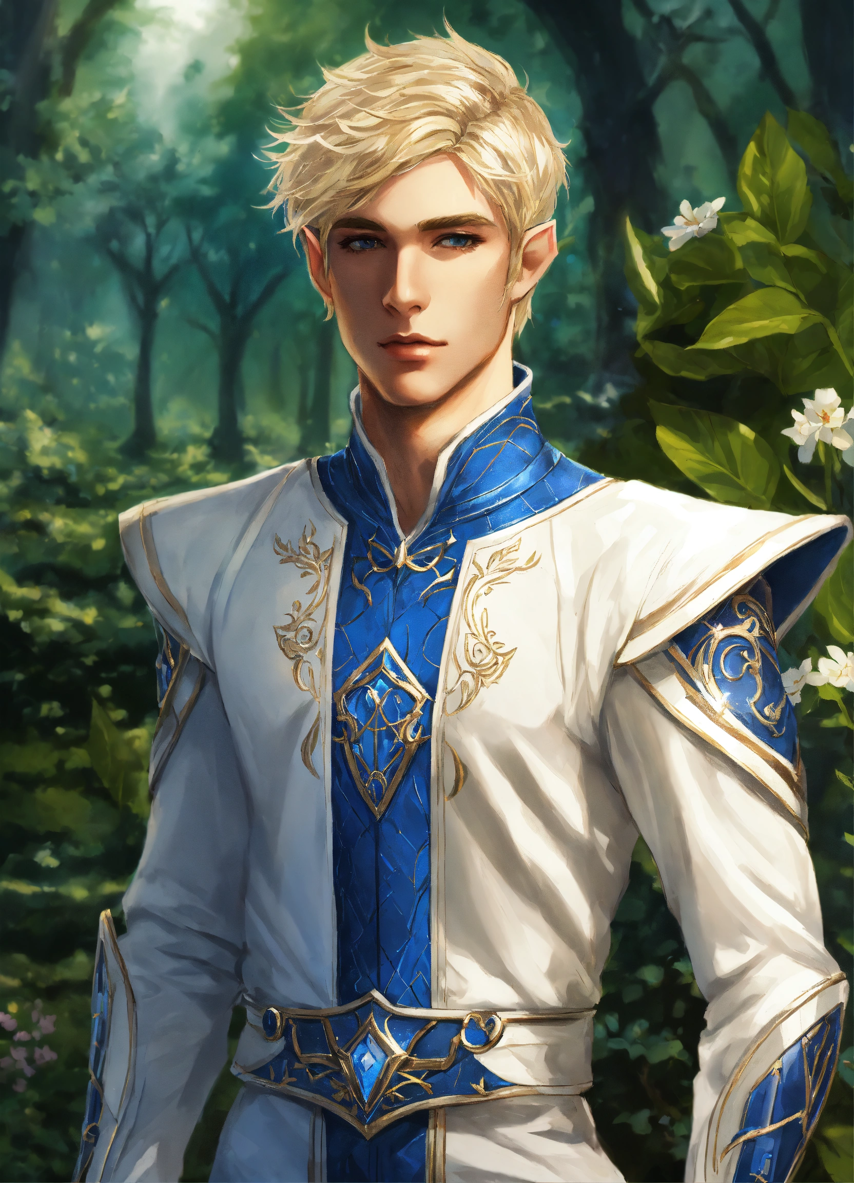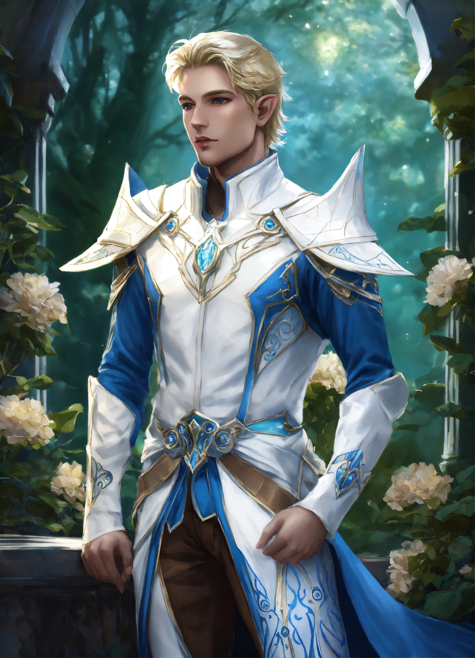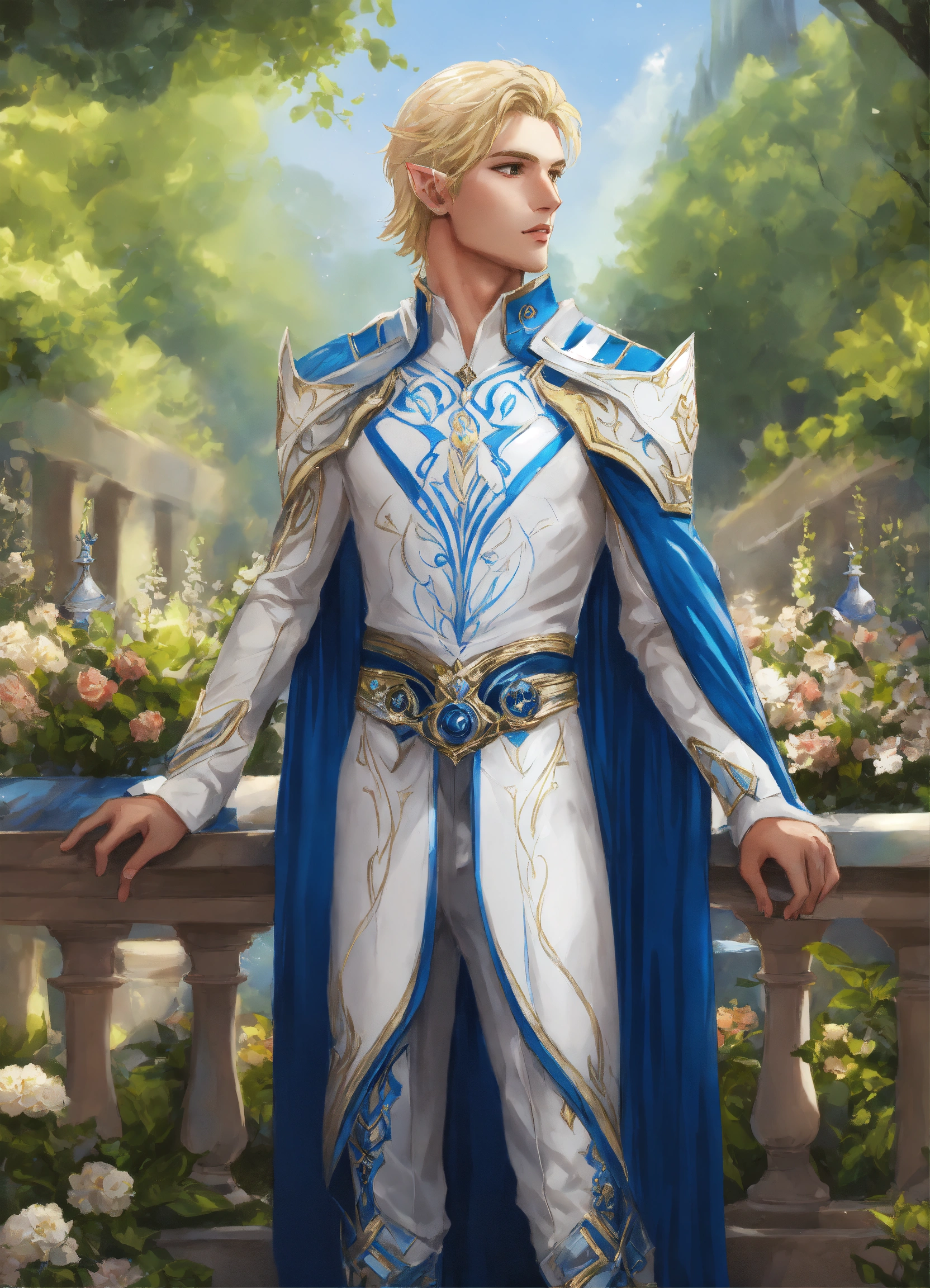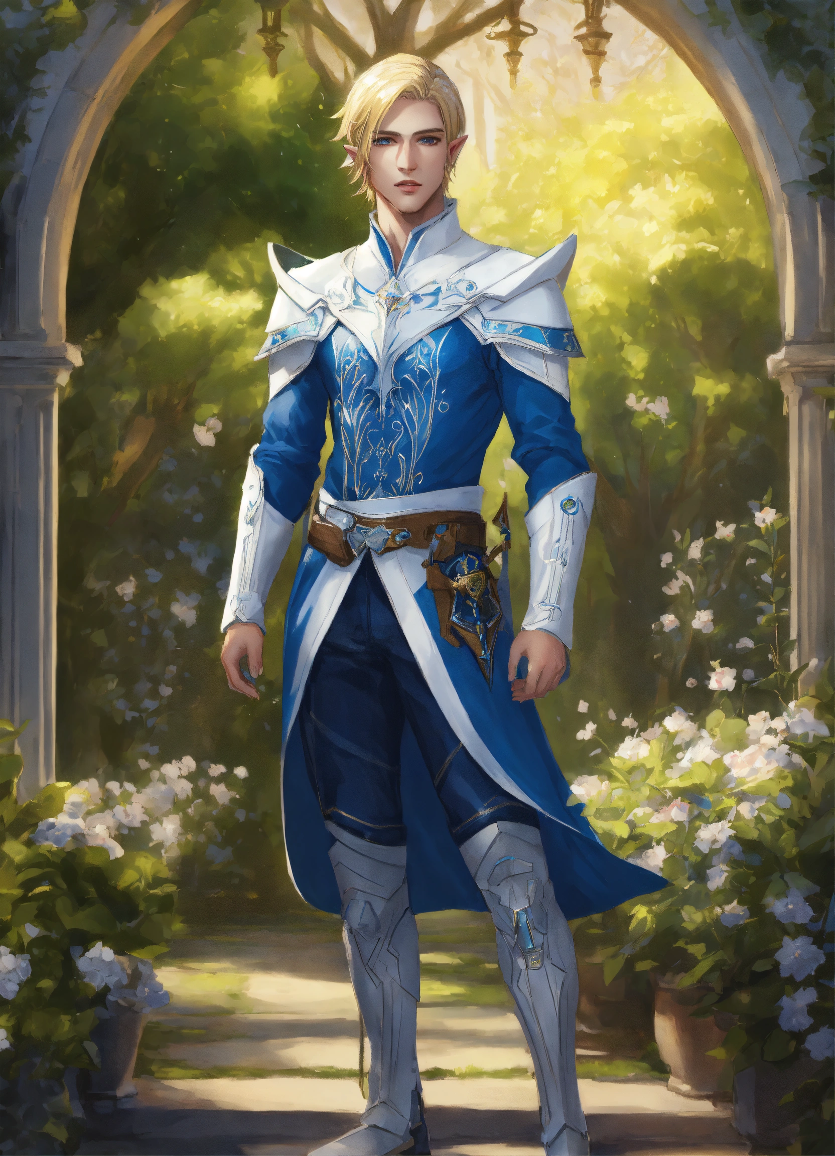 Drawing of an elf, royalty, sci fi, cybernetic, white and blue sci fi outfit, blonde hair, standing in an elegant elven garden, handsome, male high elf, 22 years old, full body