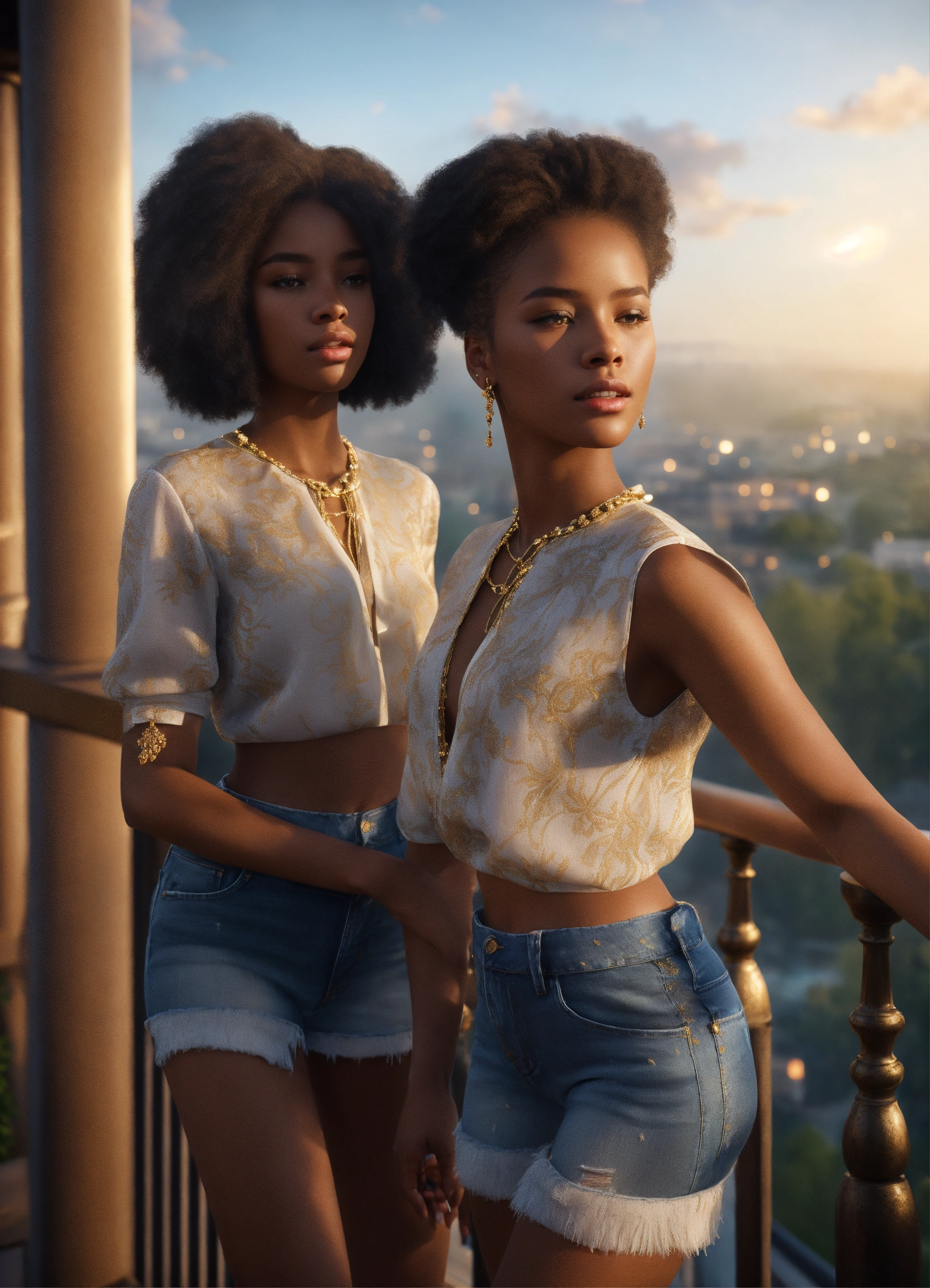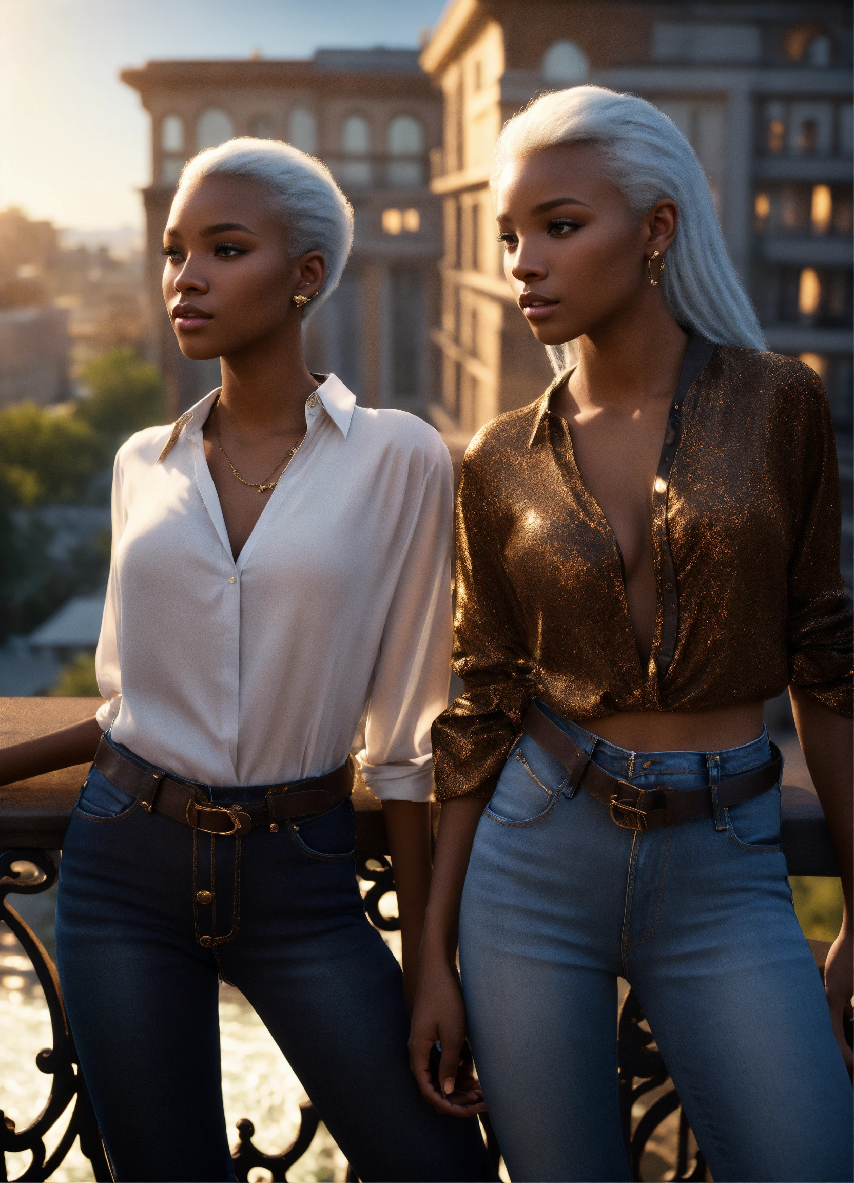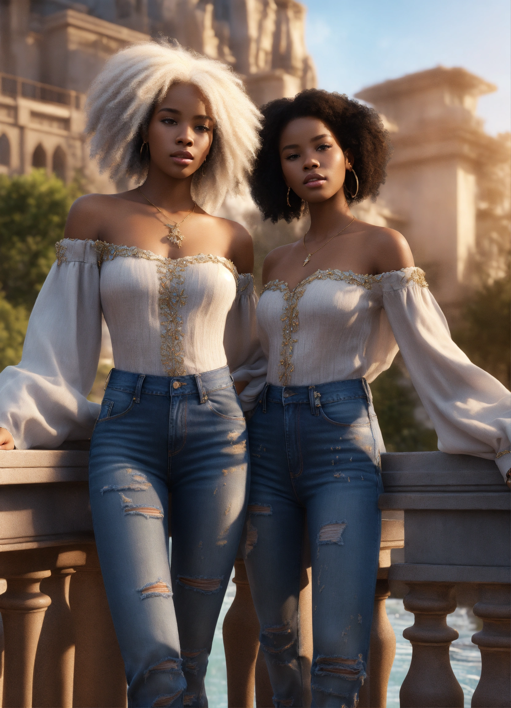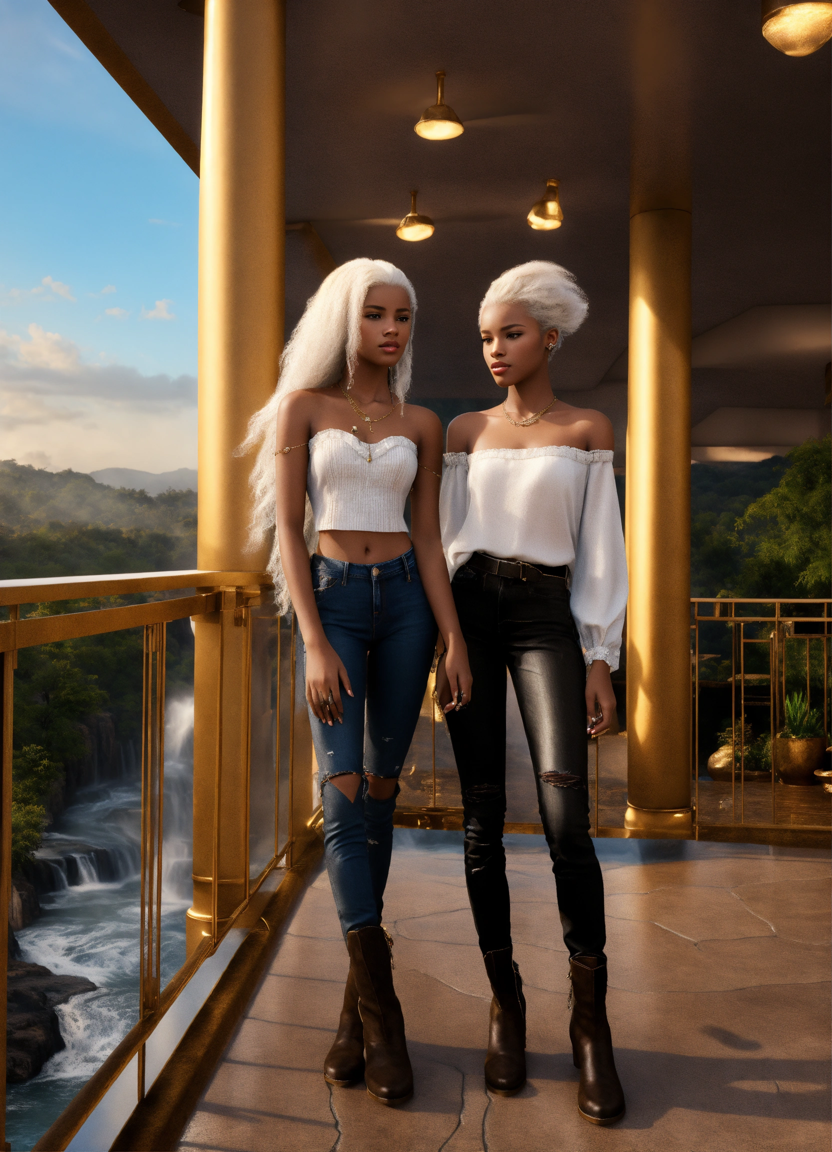 Pretty fraternal twins, twin 13-year-old, one twin white hair. african features, one twin brown-skin, black hair, in haute couture blouse, jeans, and boots. standing on upscale balcony, waterfall, regal persona. cinematic style, high detail, realistic physics, photorealistic, unreal engine, hdr, 8k