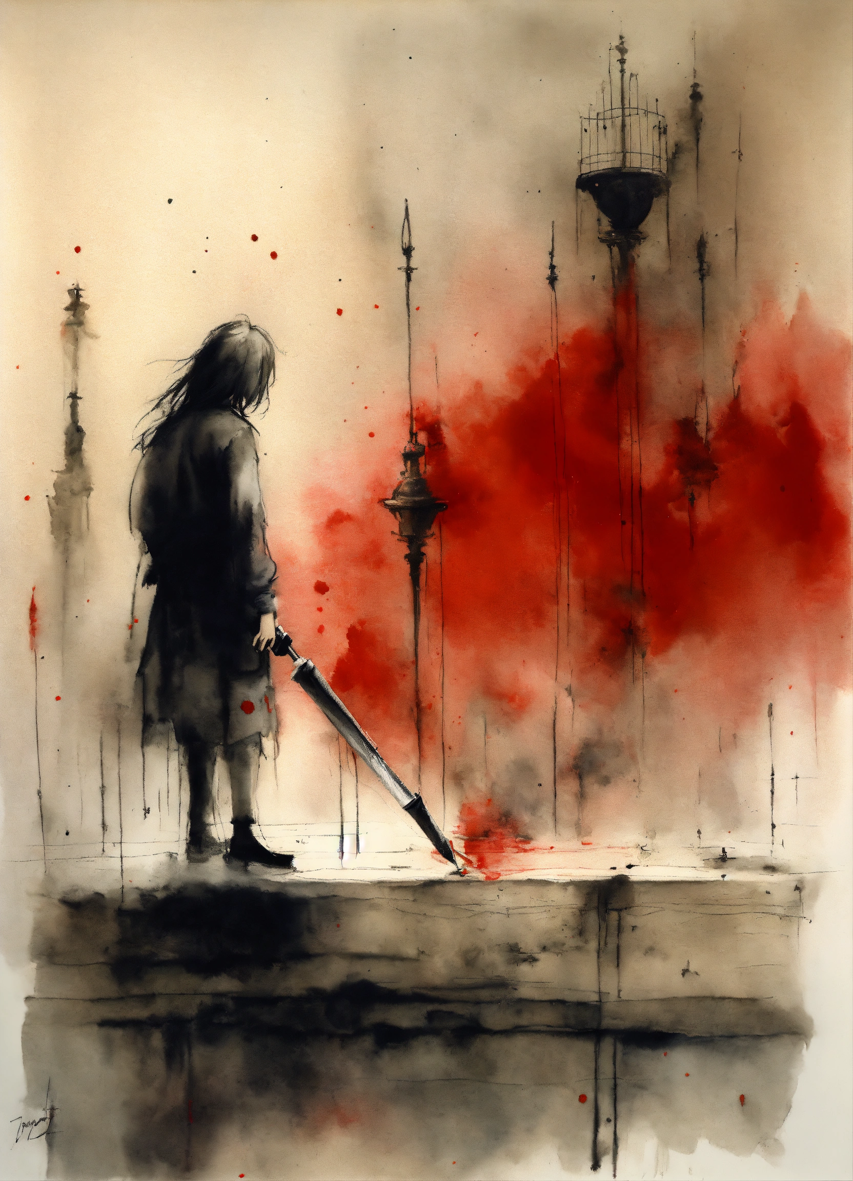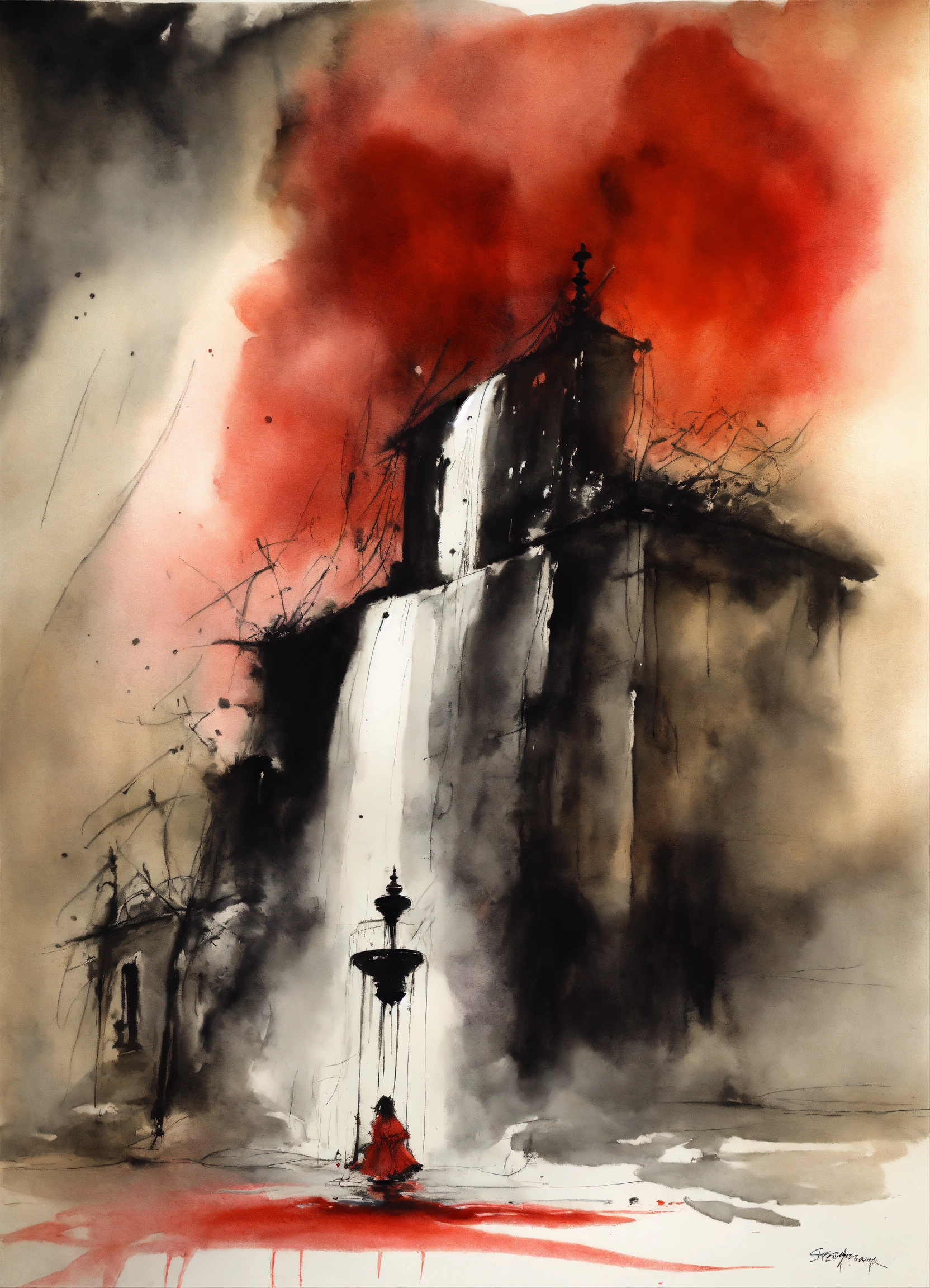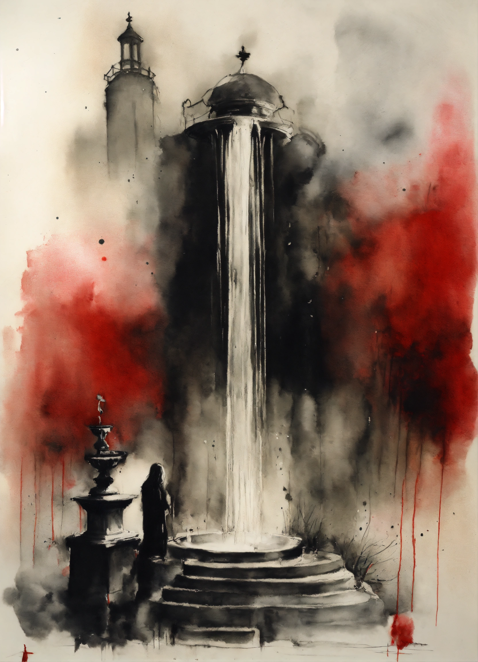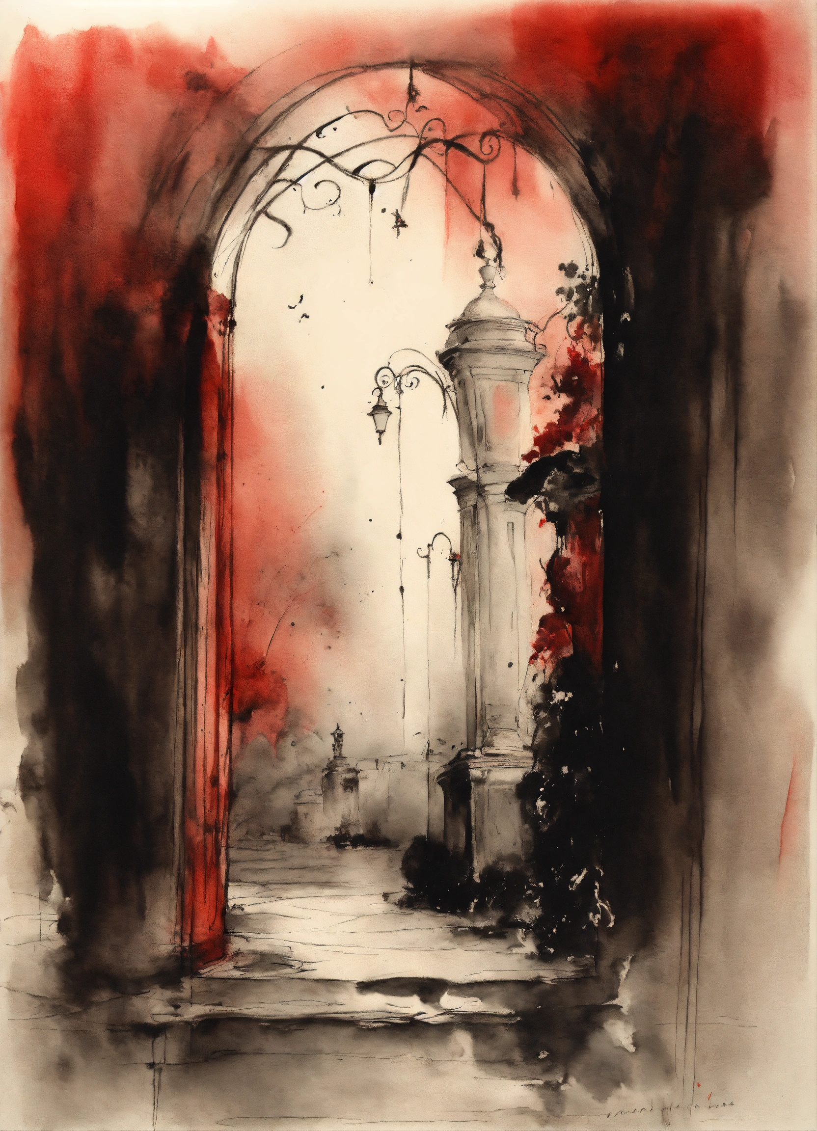 Stephen gammell style, dessin, aquarelle, aquarelles, noir et blanc et rouge, de marais, de sombres créatures, dégoulinant, a parchment with a fountain pen placed on it
