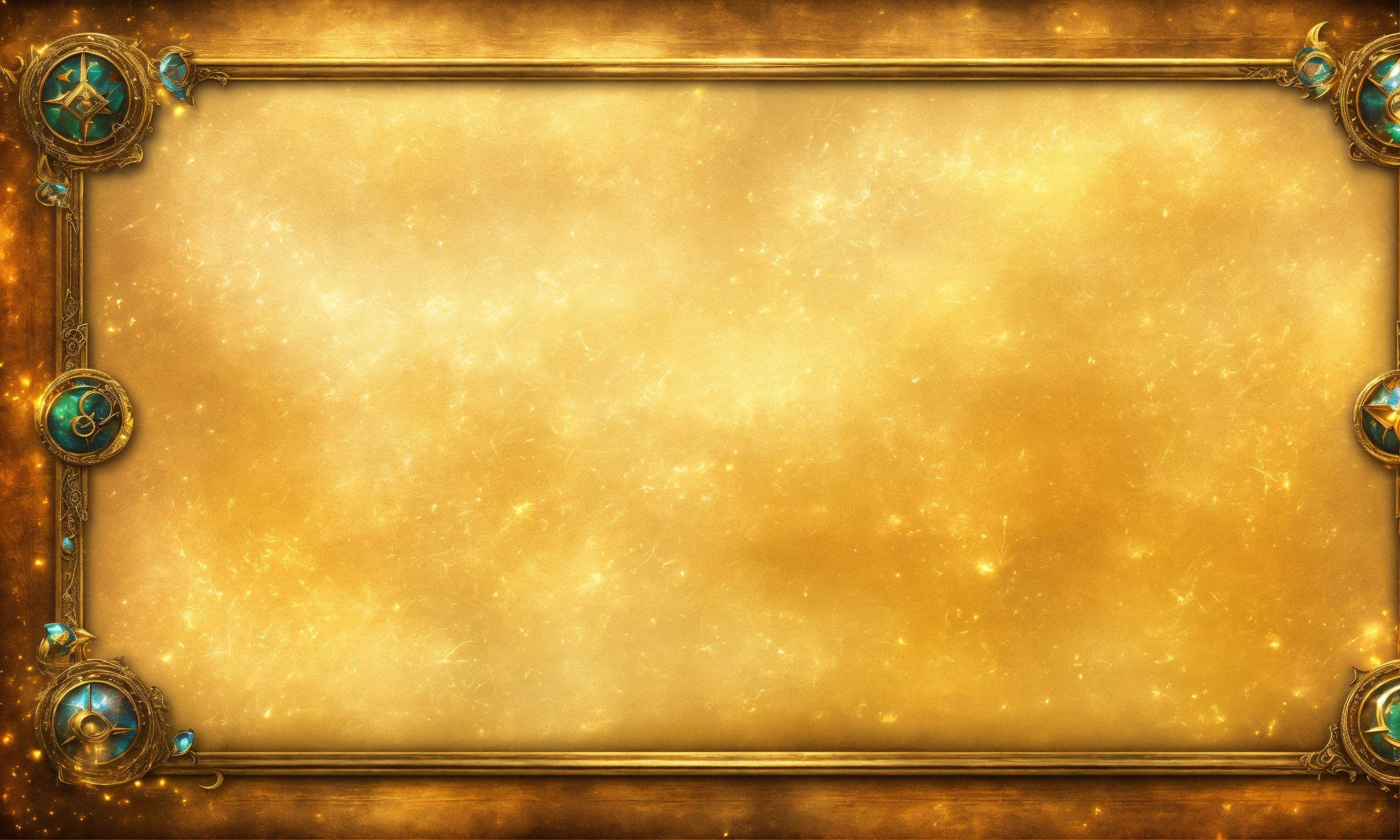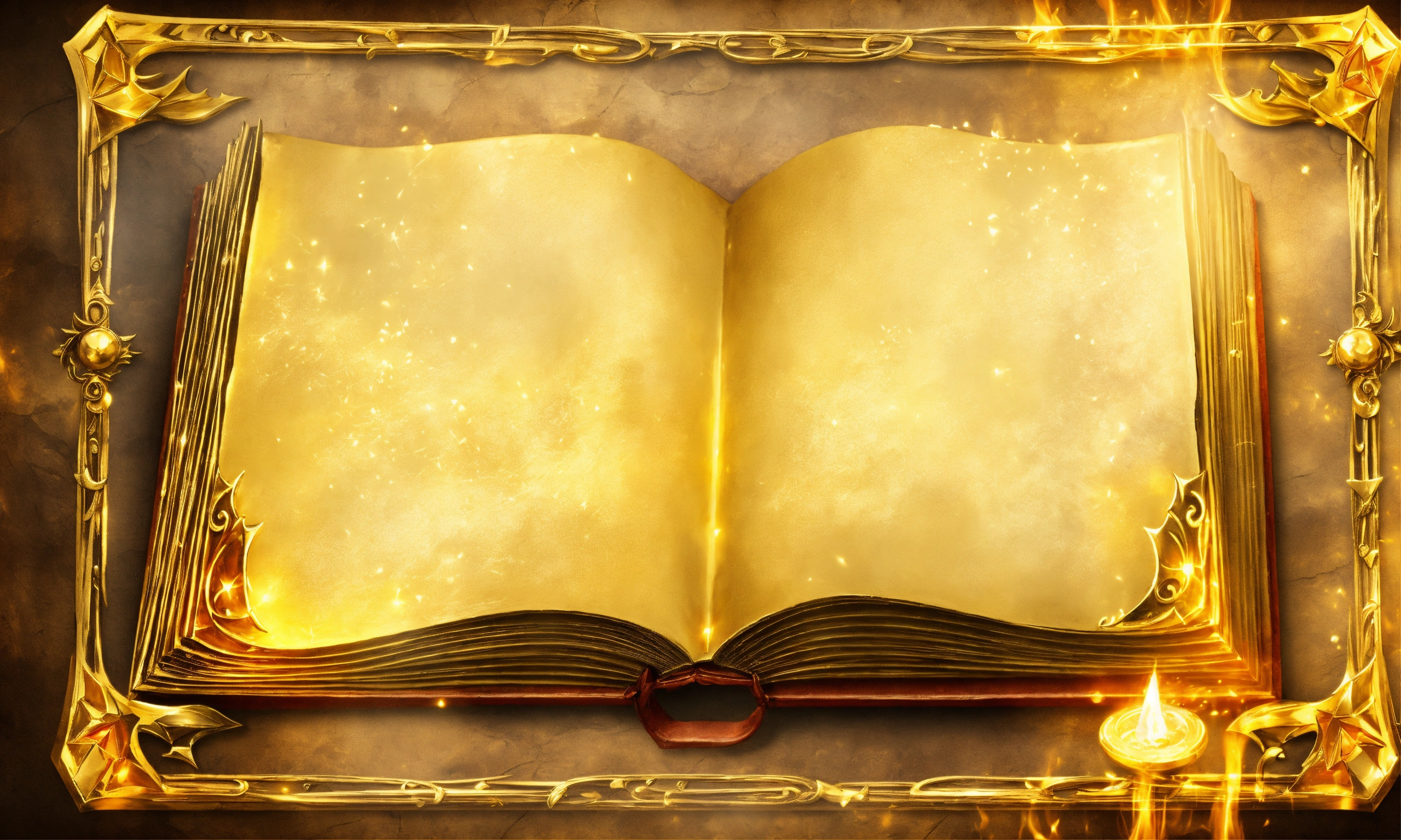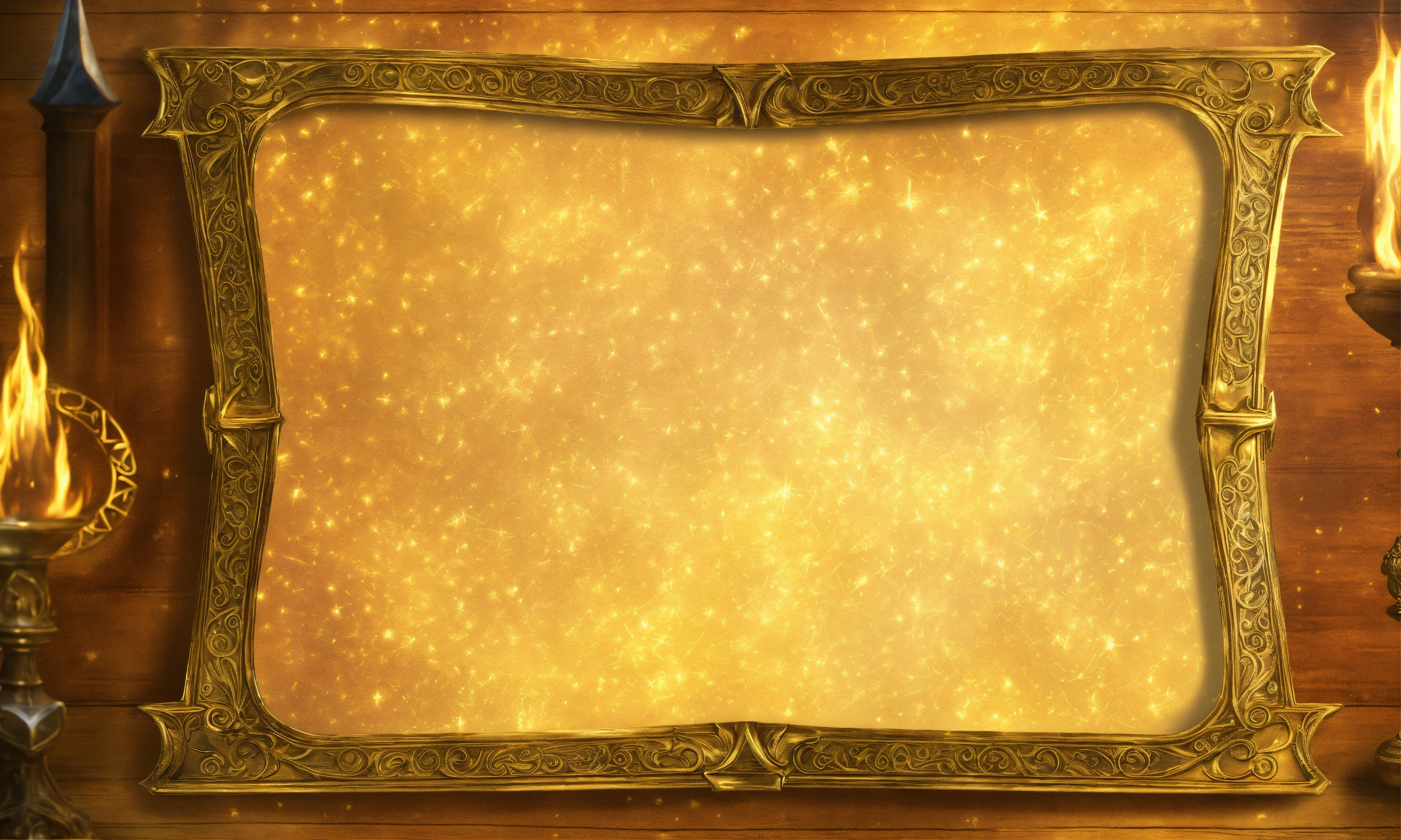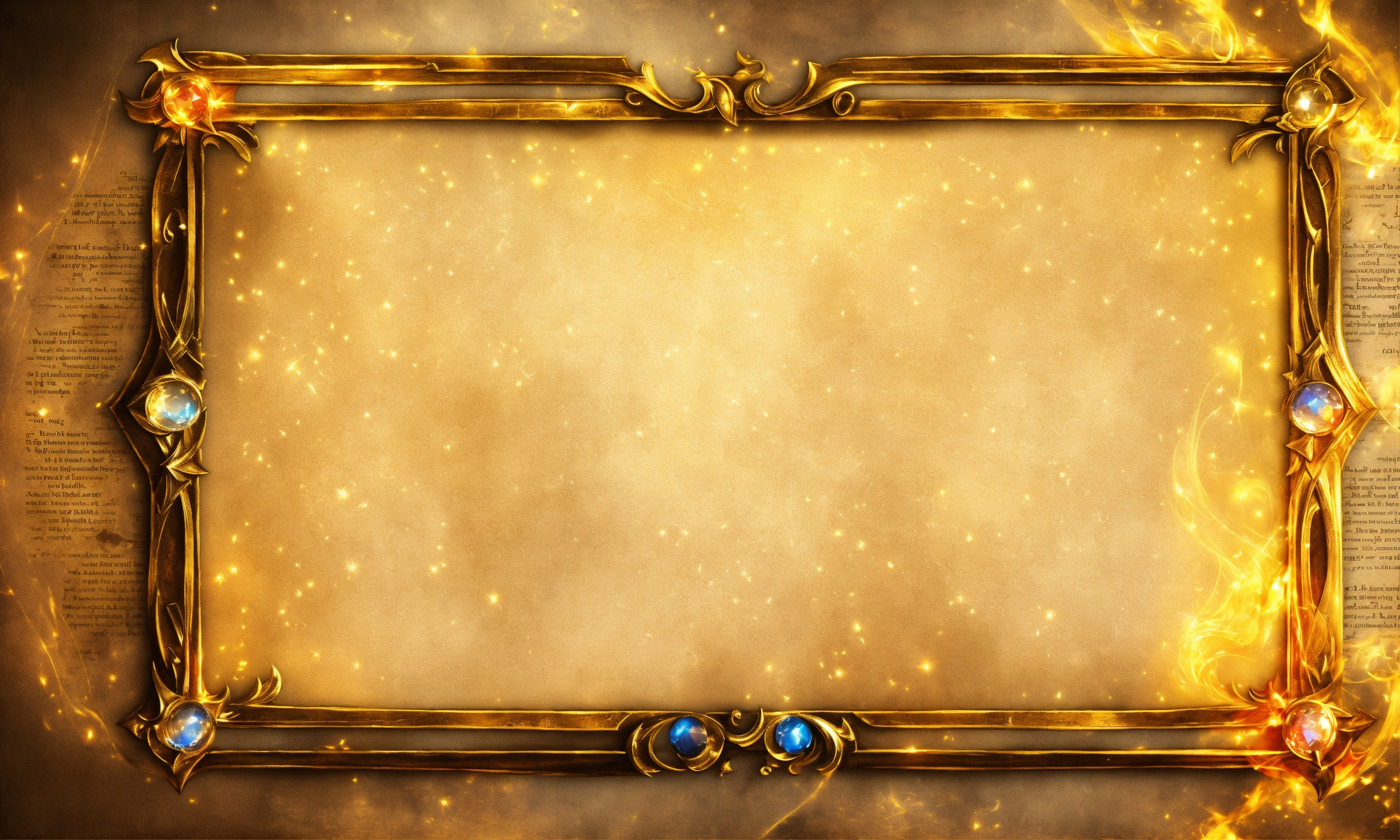 Magic spell frame, template, old parchment background, magic book, fantasy, gold, dungeons and dragons, elements, magic effects