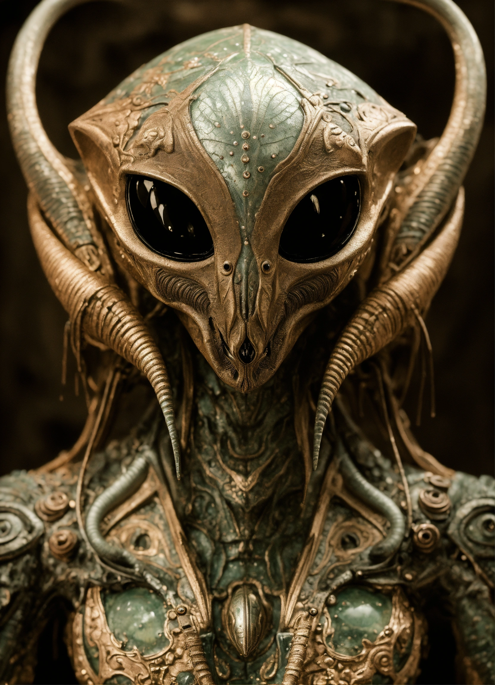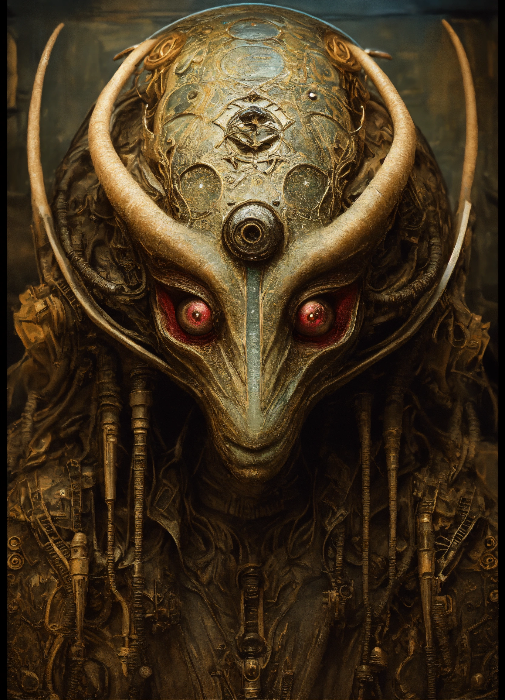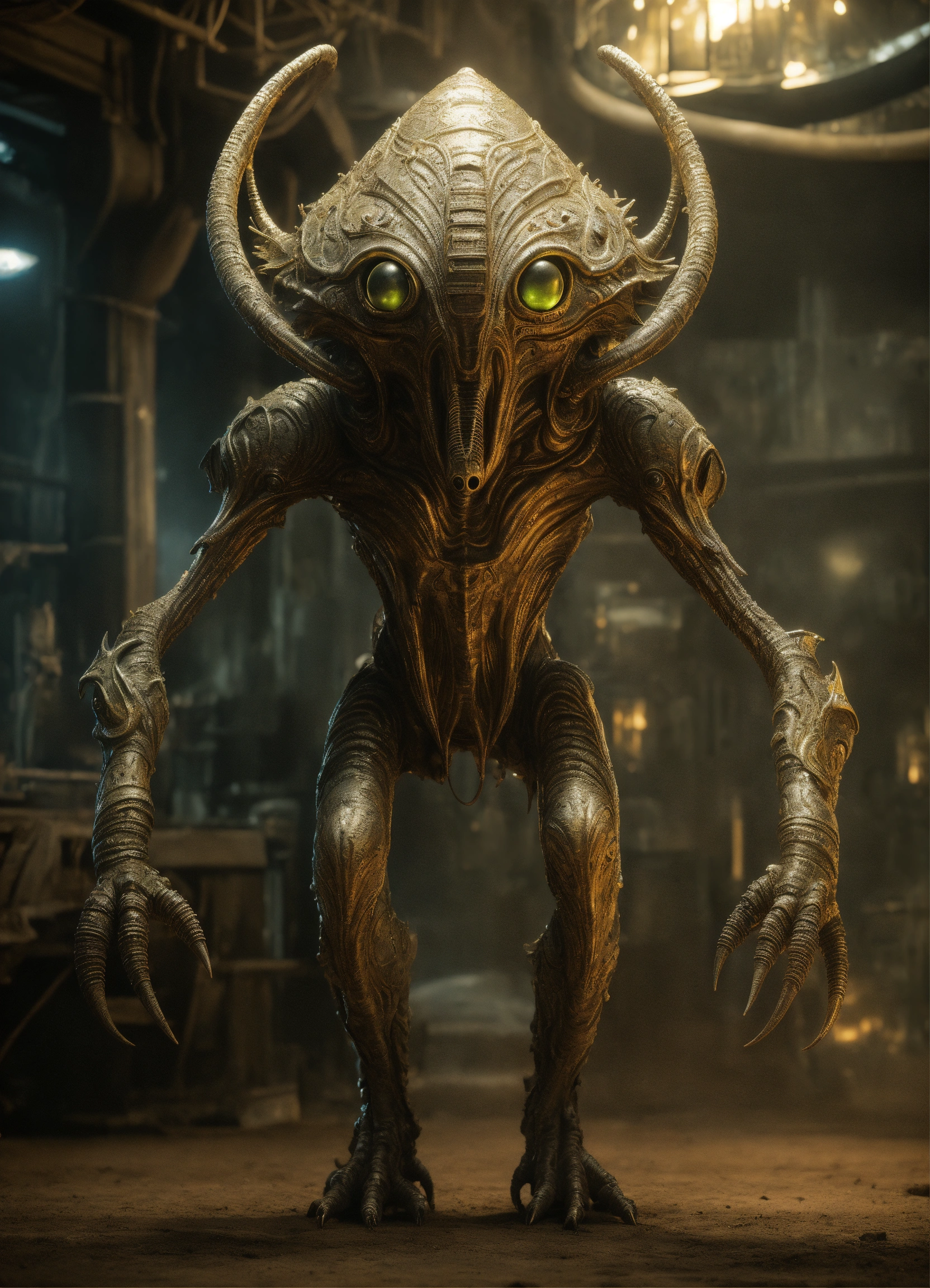 Unconventional design of an ominous extraterrestrial, incredibly detailed and realistic design, unbelievably imaginative alien creature, inspired by apollyon, designed by tim holtz and lucifer